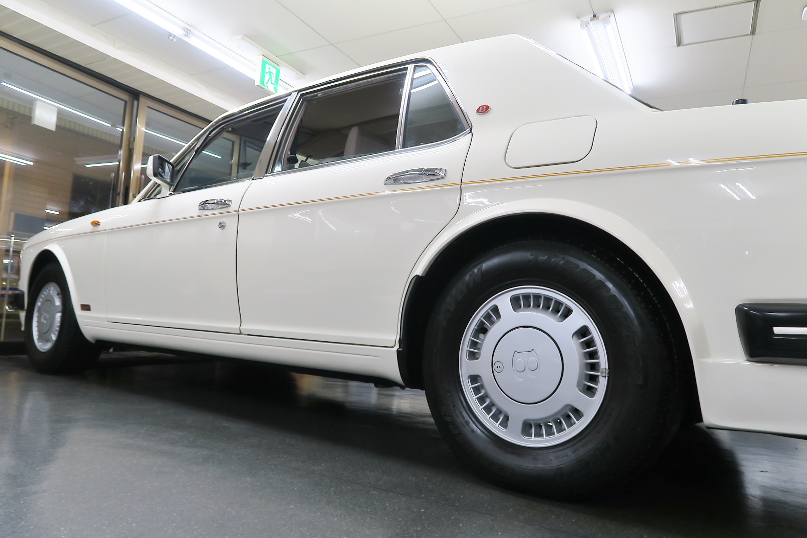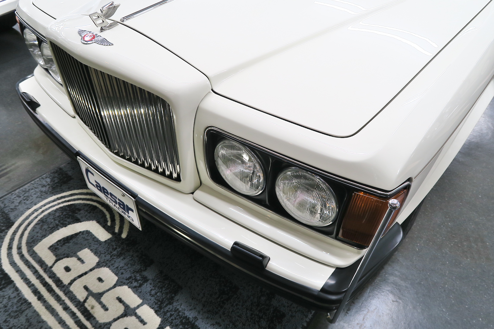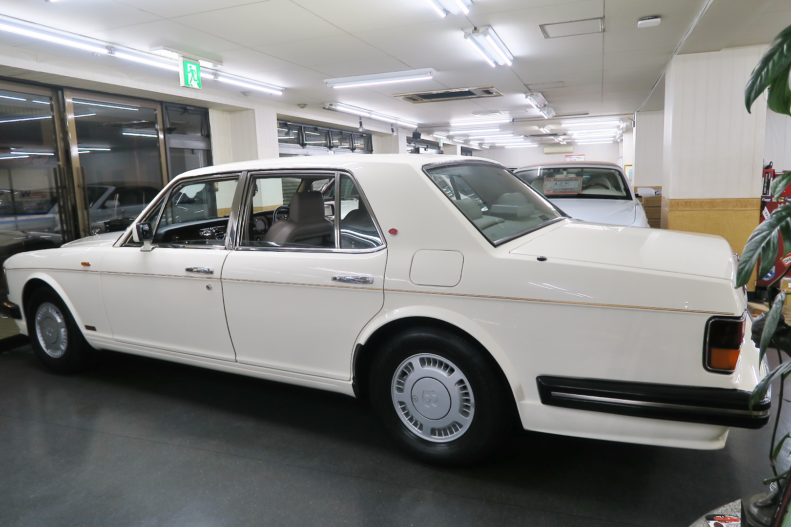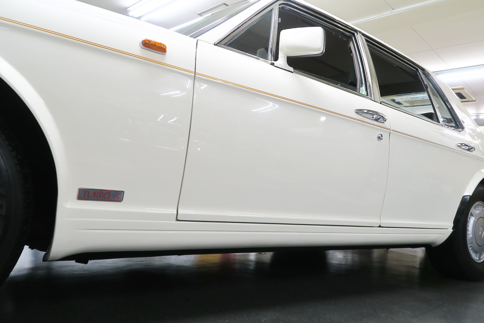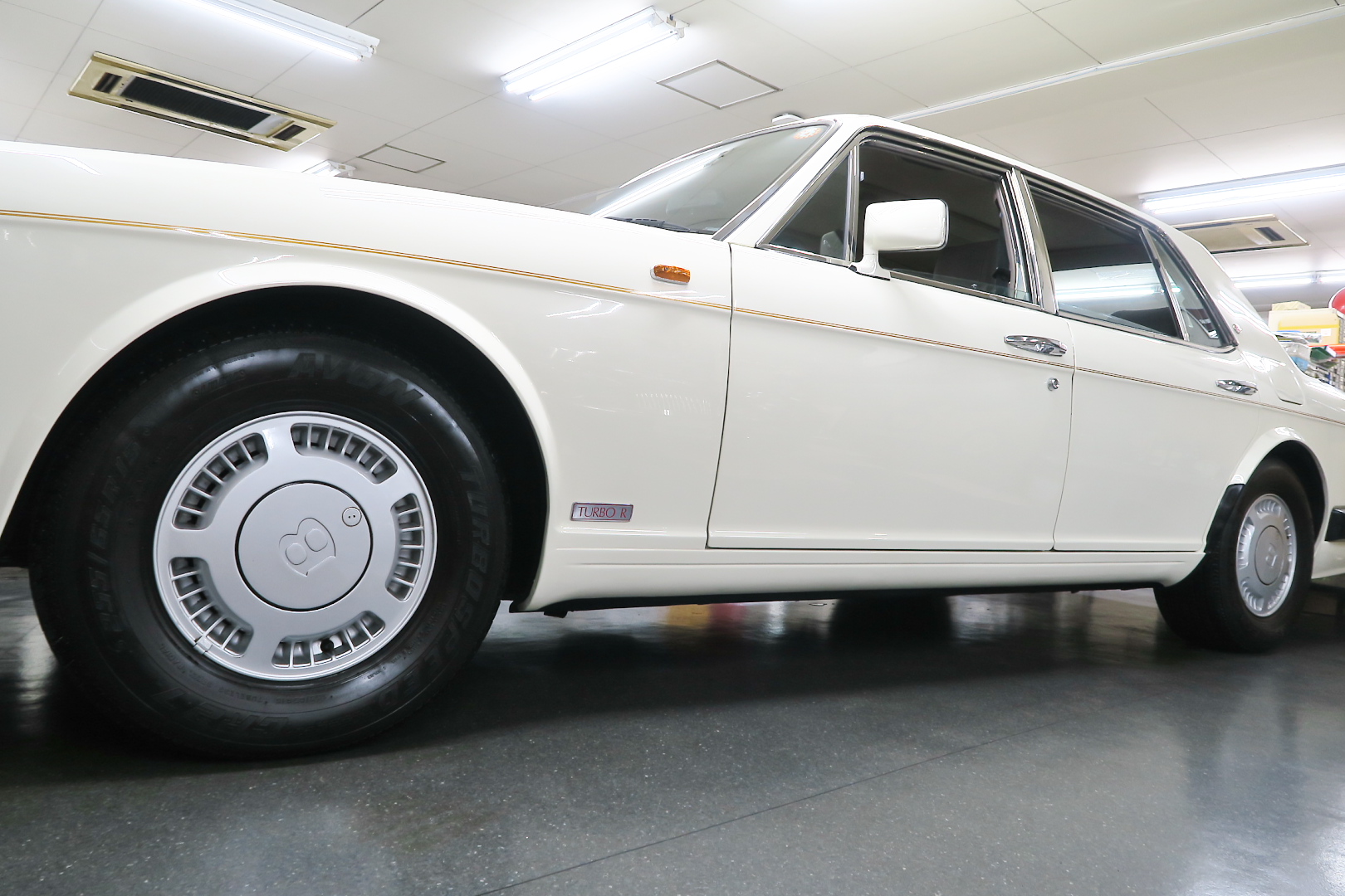 「ベントレー・ターボR」物語 「ロールス・ロイス」と「ベントレー」の生産比率(オーダー数)を逆転させた伝説の ホームラン王「ターボR」。 1965年から1980年の間に生産された「ロールス・ロイス」の4ドア・サルーン 「シャドウ」の生産台数は、「30.057台」、これに対し、ベントレーの4ドア・サルー ン、「T」は、その10分の1にも満たない、僅かに「2.289台」であった。 もはや、誰もが、ベントレーブランド自体を忘れそうになっていた。 おそらく、日本でも「ターボR」発売以前に「ベントレー」というブランドをよく知っ ていたのは、一部のエンスーな方だけであったろう。 この生産比率を逆転させる奇跡の原動力となったのが「ターボR」。 只者ではない。 ターボRの原点は、1982年に発表された「ミルザンヌ・ターボ」から始まる。 82年から85年の間に生産された、このモデルは、キャブ車のターボで、正直、 よろしくない。 トータル 516台生産されたらしいが、今となっては、当社も扱わない。 85年からは、名称を「ベントレー・ターボ」とし、インジェクション式のターボ付き となるが、本当の快進撃が始まるのは、1989年式モデルから、、 この年、エンブレムが「TURBO」から「TURBO R」に、、 外装を大型エアロパーツで武装、ヘッドライトが丸め四灯となる。 シートはバケットシート、タイヤは、ロールスの235サイズに対し、255サイズ、サス、 ショック共に「硬め」、最高速度は軽く200kmを超える、、明らかに、ロールスとは 違う、スポーツサルーン、、オーナードライバーズカーであることを強調。 しかも、時は、正にバブル絶頂期! これが 大ホームラン、名門「ベントレー」ブランドを復活してみせた。 1989年、ロールス社は年間生産台数が3000台を超えた(3254台)。 ハンドメイドの超高額モデルとしては大変な台数である。 1990年には、更に大掛かりな改良が行われ、シリーズ2へ進化、これが当車両、、 実際にベントレーがロールスの生産比率を超えたのは、この1990年のことである。 これは、「ベントレーS1」以来、実に45年ぶりの快挙であった。 この年のロールス社の年間生産台数(3274台)は、89年をも上回り、ベントレー 全盛期を迎えることになる。 90年当時のディーラー新車価格は、 ・ベントレーターボR 3100万円(税別) ・ベントレーラーボRL 3400万円(税別) ・R・RスパーU 3050万円(税別) ・R・RスピリットU 2750万円(税別) この価格設定からも、ロールスよりベントレーの方が高級、のイメージができあがる。 89年から91年にかけては、日本もバブル景気の全盛期、多くのベントレーが、正規 ディーラーのみならず、民間業者により並行車として輸入された。 当時は弊社とて、新車の「ターボR」を輸入したものだ。 が、流石に時間が経ってしまった、、近年では、この年式の極上個体のR・R、ベント レーは、ほとんど、見なくなった。 車自体は頑丈なのだが、中古車の流通価格が安くなりすぎて大切に扱われなくなったこ とと、仮に売り物がでても、その多くが、この円安で海外の業者に買われてしまってい ることが最大の原因であろう。 それが証拠に、先ほど、日本最大の掲載台数を誇る「カーセンサー」ネットで、 「ベントレー ターボR」と検索したところ、掲載車は、僅かに「4台」、それも、 内、2台は弊社の在庫車、、日本から消えた?? じゃなくても、今や当社の仕入基準を満たす個体は、ほぼない と言ってもよいほど、 さて、当車両のお話: ディーラー車 右ハンドル(90年モデル・90年8月登録) 当時は、「右H」は、完全にオーダー制で、注文される方も、10人にお一人くらい。 まだまだ「外車は左ハンドル」の時代であった。 当個体、複数オーナーであるが、弊社が、「2009年」に仕入れ、販売させて頂いた 元「シーザー認定号」、オーナー様は、2025年まで、16年間ご所有されていた。 今回は 終活の一環として、久しぶりの再入庫。 走行:「49.900km」 もちろん「実走」。 しかも、保管環境はバツグンで、販売させていただいた時と ほぼ変わりなし。 91年までに「ラッカー塗料」にありがちな「塗装クラック」箇所は、すでにリペア 対策済みで、クラックもなし。 ベース・コンディションは、極めて素晴らしい。 外装は、「アクリル・ホワイト」」 ソリッドのホワイト、真っ白ではなく、少し象牙色っぽい。 のちに「コーニッシュ・ホワイト」として復活した 良き時代のホワイト・カラー。 全長:「528cm」 ショートボディ、本来「RL」だけに付く「CピラーにBバッジ」、 純正フライングBマスコット 純正コーナーポール 当時の外装オプション全部付け 内装は、 「マッシュルーム」コノリーレザー。 オリジナル「コノリー」、ノンリペアで、ここまでキレイに残す。 マッシュルームというカラーを選択された方も極めて稀で、まず みない。 このカラー、汚れも目立たず、好きかな。 ウッドもノンリペアで 艶々っ オプションの「両面ウッド張りピクニック・テーブル」 この右テーブルを開いた箇所(ウッド面)