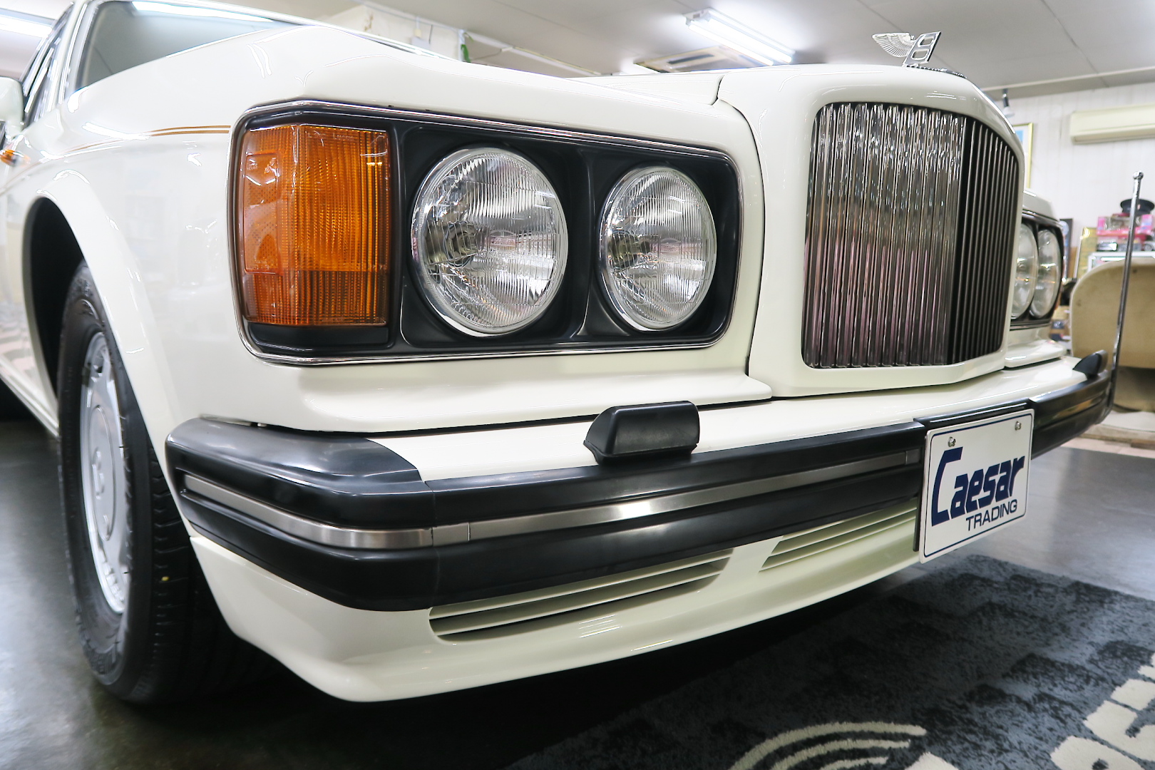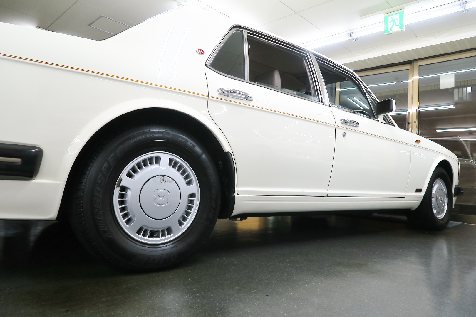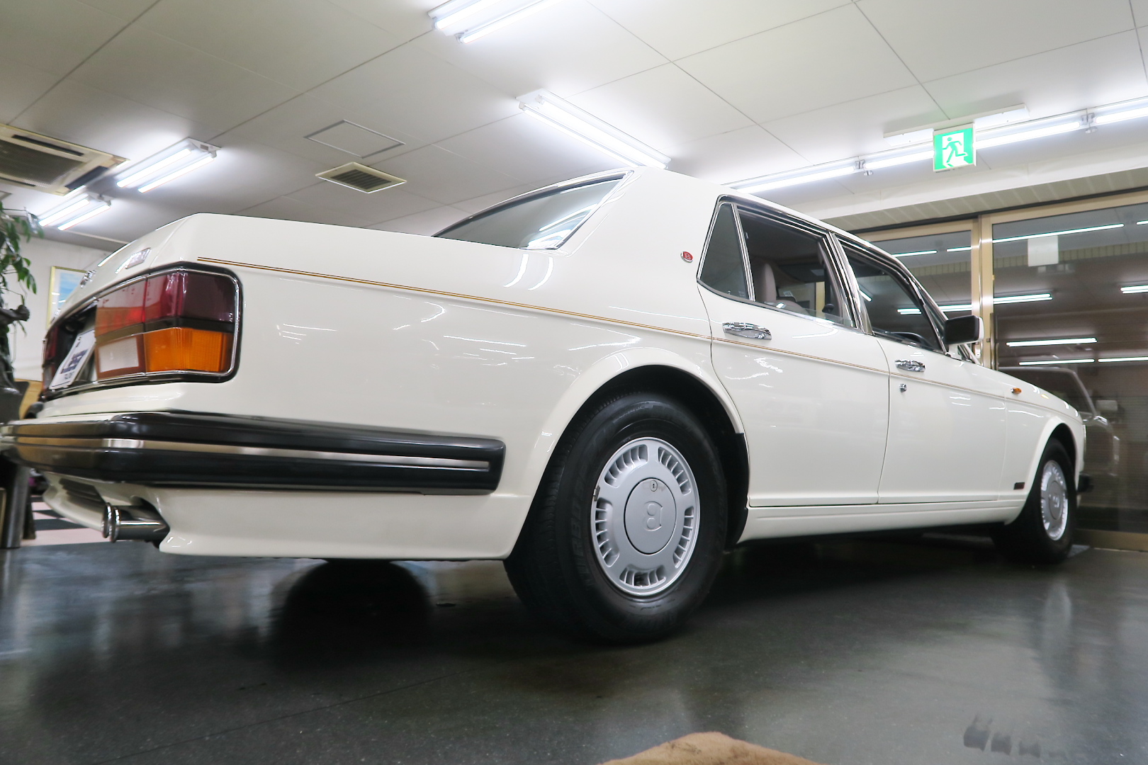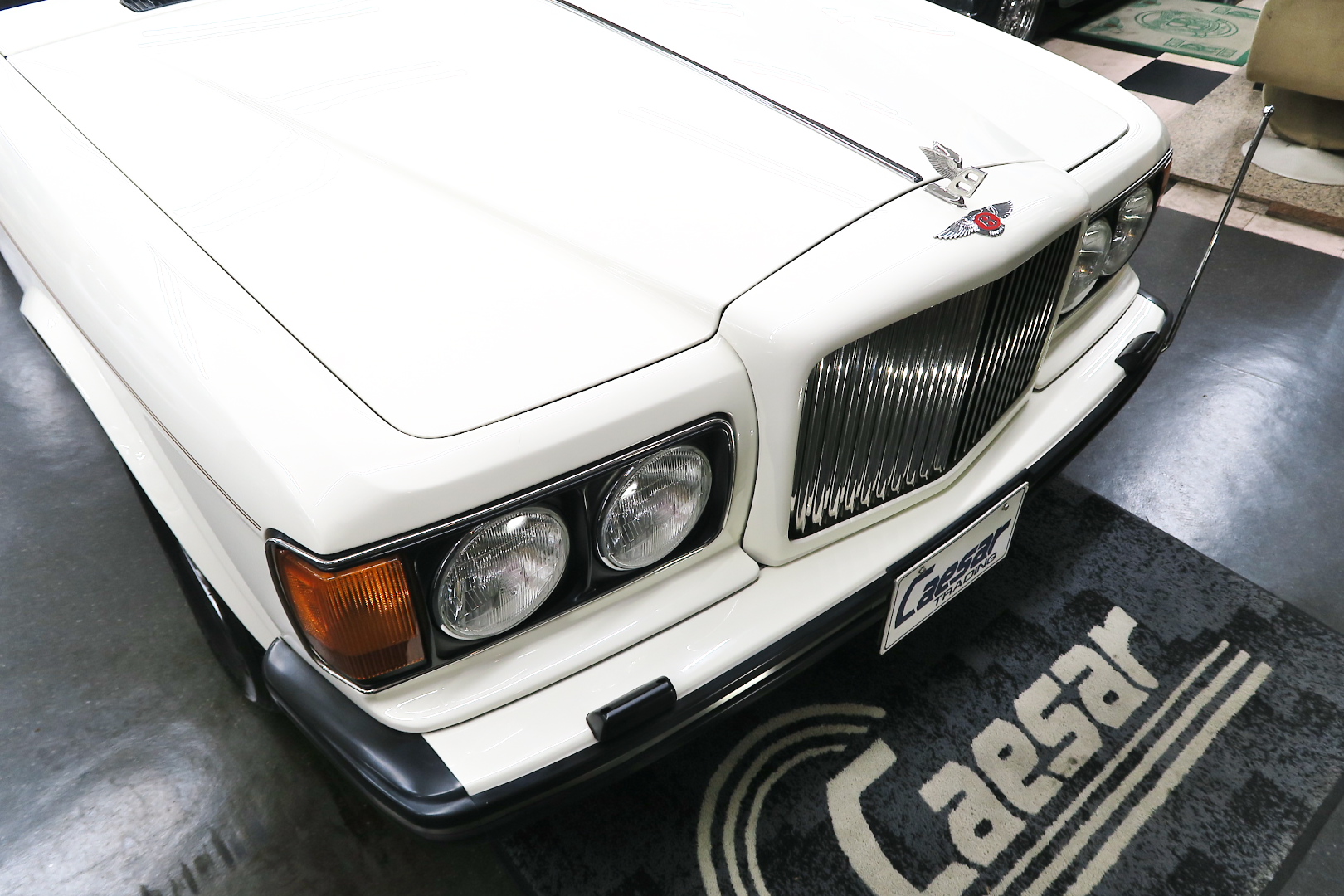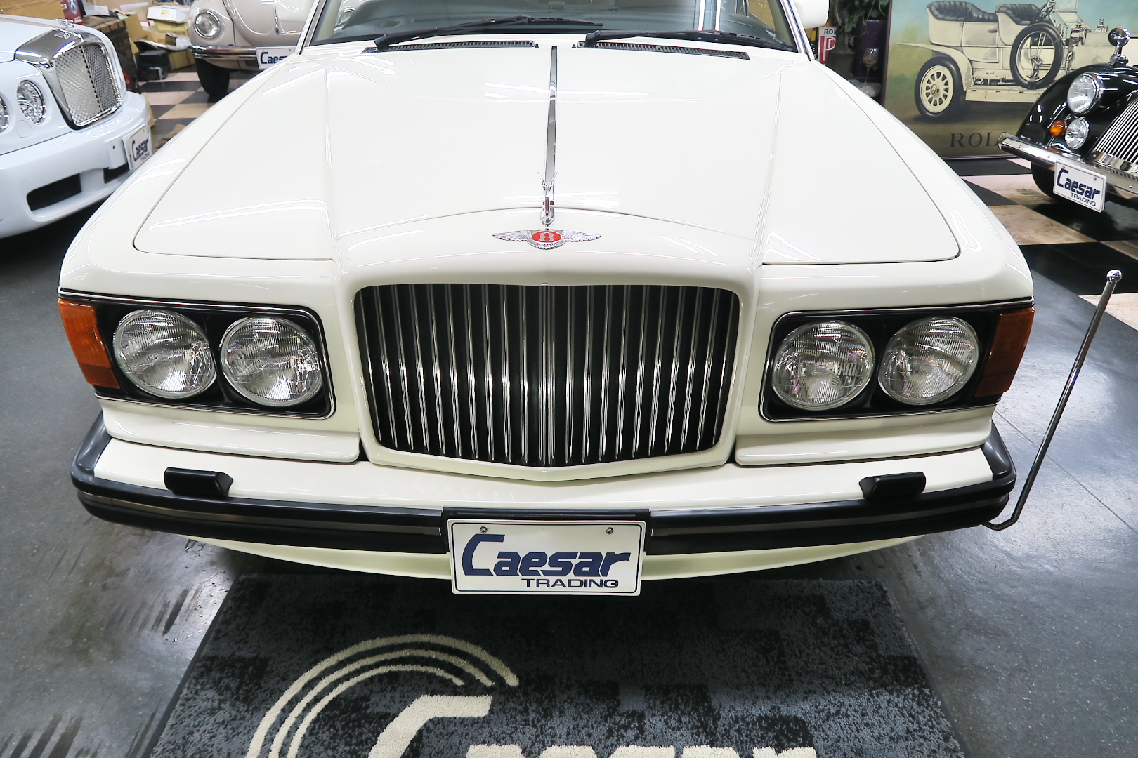 「ベントレー・ターボR」物語 「ロールス・ロイス」と「ベントレー」の生産比率(オーダー数)を逆転させた伝説の ホームラン王「ターボR」。 1965年から1980年の間に生産された「ロールス・ロイス」の4ドア・サルーン 「シャドウ」の生産台数は、「30.057台」、これに対し、ベントレーの4ドア・サルー ン、「T」は、その10分の1にも満たない、僅かに「2.289台」であった。 もはや、誰もが、ベントレーブランド自体を忘れそうになっていた。 おそらく、日本でも「ターボR」発売以前に「ベントレー」というブランドをよく知っ ていたのは、一部のエンスーな方だけであったろう。 この生産比率を逆転させる奇跡の原動力となったのが「ターボR」。 只者ではない。 ターボRの原点は、1982年に発表された「ミルザンヌ・ターボ」から始まる。 82年から85年の間に生産された、このモデルは、キャブ車のターボで、正直、 よろしくない。 トータル 516台生産されたらしいが、今となっては、当社も扱わない。 85年からは、名称を「ベントレー・ターボ」とし、インジェクション式のターボ付き となるが、本当の快進撃が始まるのは、1989年式モデルから、、 この年、エンブレムが「TURBO」から「TURBO R」に、、 外装を大型エアロパーツで武装、ヘッドライトが丸め四灯となる。 シートはバケットシート、タイヤは、ロールスの235サイズに対し、255サイズ、サス、 ショック共に「硬め」、最高速度は軽く200kmを超える、、明らかに、ロールスとは 違う、スポーツサルーン、、オーナードライバーズカーであることを強調。 しかも、時は、正にバブル絶頂期! これが 大ホームラン、名門「ベントレー」ブランドを復活してみせた。 1989年、ロールス社は年間生産台数が3000台を超えた(3254台)。 ハンドメイドの超高額モデルとしては大変な台数である。 1990年には、更に大掛かりな改良が行われ、シリーズ2へ進化、これが当車両、、 実際にベントレーがロールスの生産比率を超えたのは、この1990年のことである。 これは、「ベントレーS1」以来、実に45年ぶりの快挙であった。 この年のロールス社の年間生産台数(3274台)は、89年をも上回り、ベントレー 全盛期を迎えることになる。 90年当時のディーラー新車価格は、 ・ベントレーターボR 3100万円(税別) ・ベントレーラーボRL 3400万円(税別) ・R・RスパーU 3050万円(税別) ・R・RスピリットU 2750万円(税別) この価格設定からも、ロールスよりベントレーの方が高級、のイメージができあがる。 89年から91年にかけては、日本もバブル景気の全盛期、多くのベントレーが、正規 ディーラーのみならず、民間業者により並行車として輸入された。 当時は弊社とて、新車の「ターボR」を輸入したものだ。 が、流石に時間が経ってしまった、、近年では、この年式の極上個体のR・R、ベント レーは、ほとんど、見なくなった。 車自体は頑丈なのだが、中古車の流通価格が安くなりすぎて大切に扱われなくなったこ とと、仮に売り物がでても、その多くが、この円安で海外の業者に買われてしまってい ることが最大の原因であろう。 それが証拠に、先ほど、日本最大の掲載台数を誇る「カーセンサー」ネットで、 「ベントレー ターボR」と検索したところ、掲載車は、僅かに「4台」、それも、 内、2台は弊社の在庫車、、日本から消えた?? じゃなくても、今や当社の仕入基準を満たす個体は、ほぼない と言ってもよいほど、 さて、当車両のお話: ディーラー車 右ハンドル(90年モデル・90年8月登録) 当時は、「右H」は、完全にオーダー制で、注文される方も、10人にお一人くらい。 まだまだ「外車は左ハンドル」の時代であった。 当個体、複数オーナーであるが、弊社が、「2009年」に仕入れ、販売させて頂いた 元「シーザー認定号」、オーナー様は、2025年まで、16年間ご所有されていた。 今回は 終活の一環として、久しぶりの再入庫。 走行:「49.900km」 もちろん「実走」。 しかも、保管環境はバツグンで、販売させていただいた時と ほぼ変わりなし。 91年までに「ラッカー塗料」にありがちな「塗装クラック」箇所は、すでにリペア 対策済みで、クラックもなし。 ベース・コンディションは、極めて素晴らしい。 外装は、「アクリル・ホワイト」」 ソリッドのホワイト、真っ白ではなく、少し象牙色っぽい。 のちに「コーニッシュ・ホワイト」として復活した 良き時代のホワイト・カラー。 全長:「528cm」 ショートボディ、本来「RL」だけに付く「CピラーにBバッジ」、 純正フライングBマスコット 純正コーナーポール 当時の外装オプション全部付け 内装は、 「マッシュルーム」コノリーレザー。 オリジナル「コノリー」、ノンリペアで、ここまでキレイに残す。 マッシュルームというカラーを選択された方も極めて稀で、まず みない。 このカラー、汚れも目立たず、好きかな。 ウッドもノンリペアで 艶々っ オプションの「両面ウッド張りピクニック・テーブル」 この右テーブルを開いた箇所(ウッド面)