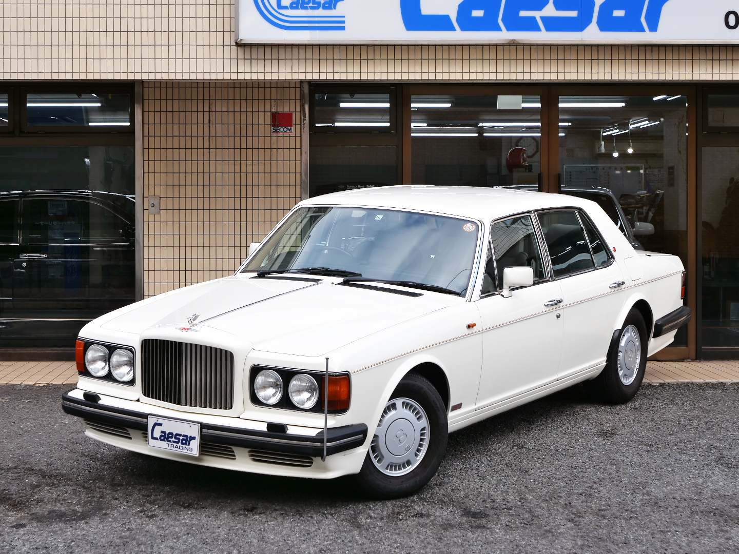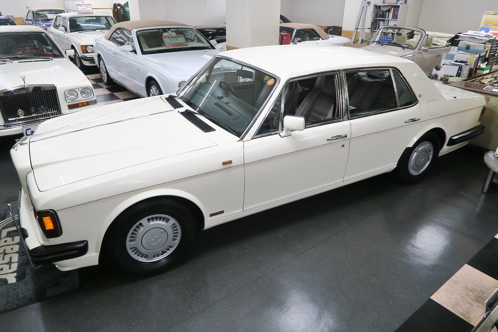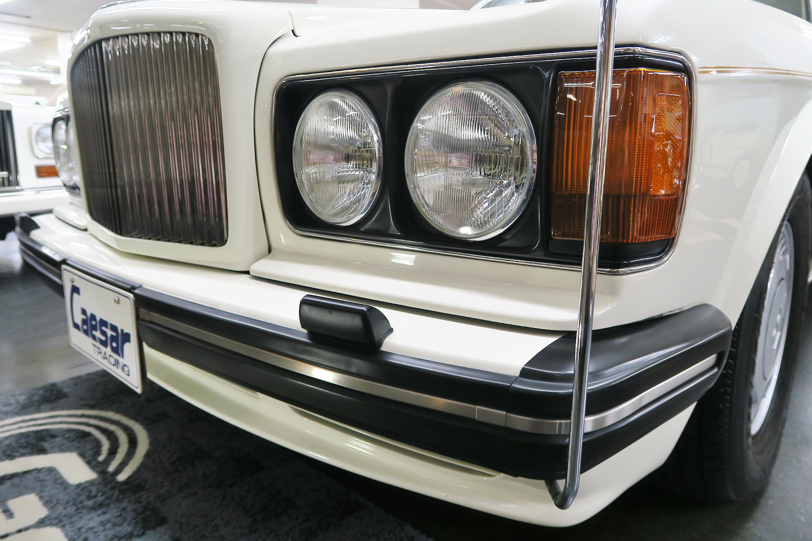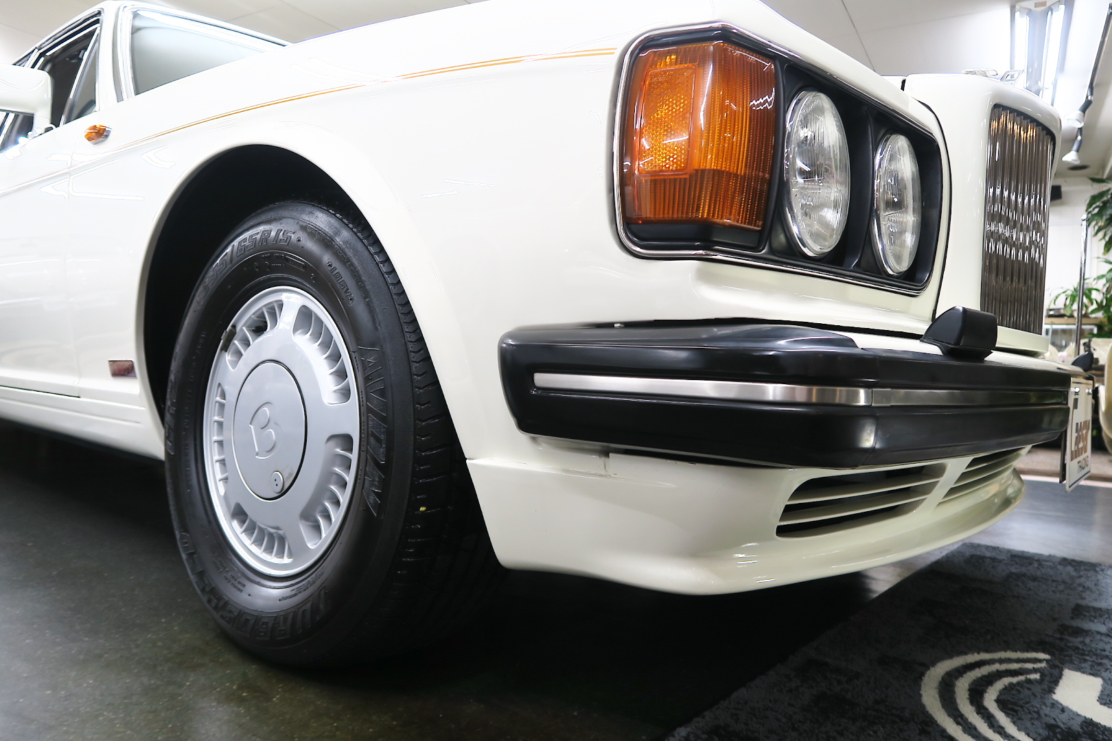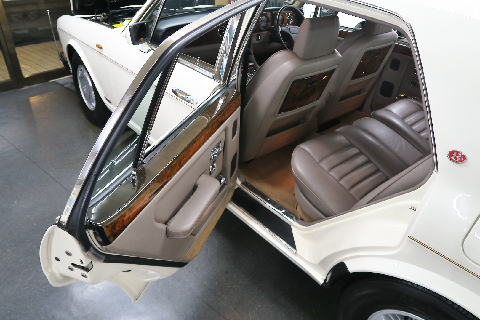 「ベントレー・ターボR」物語 「ロールス・ロイス」と「ベントレー」の生産比率(オーダー数)を逆転させた伝説の ホームラン王「ターボR」。 1965年から1980年の間に生産された「ロールス・ロイス」の4ドア・サルーン 「シャドウ」の生産台数は、「30.057台」、これに対し、ベントレーの4ドア・サルー ン、「T」は、その10分の1にも満たない、僅かに「2.289台」であった。 もはや、誰もが、ベントレーブランド自体を忘れそうになっていた。 おそらく、日本でも「ターボR」発売以前に「ベントレー」というブランドをよく知っ ていたのは、一部のエンスーな方だけであったろう。 この生産比率を逆転させる奇跡の原動力となったのが「ターボR」。 只者ではない。 ターボRの原点は、1982年に発表された「ミルザンヌ・ターボ」から始まる。 82年から85年の間に生産された、このモデルは、キャブ車のターボで、正直、 よろしくない。 トータル 516台生産されたらしいが、今となっては、当社も扱わない。 85年からは、名称を「ベントレー・ターボ」とし、インジェクション式のターボ付き となるが、本当の快進撃が始まるのは、1989年式モデルから、、 この年、エンブレムが「TURBO」から「TURBO R」に、、 外装を大型エアロパーツで武装、ヘッドライトが丸め四灯となる。 シートはバケットシート、タイヤは、ロールスの235サイズに対し、255サイズ、サス、 ショック共に「硬め」、最高速度は軽く200kmを超える、、明らかに、ロールスとは 違う、スポーツサルーン、、オーナードライバーズカーであることを強調。 しかも、時は、正にバブル絶頂期! これが 大ホームラン、名門「ベントレー」ブランドを復活してみせた。 1989年、ロールス社は年間生産台数が3000台を超えた(3254台)。 ハンドメイドの超高額モデルとしては大変な台数である。 1990年には、更に大掛かりな改良が行われ、シリーズ2へ進化、これが当車両、、 実際にベントレーがロールスの生産比率を超えたのは、この1990年のことである。 これは、「ベントレーS1」以来、実に45年ぶりの快挙であった。 この年のロールス社の年間生産台数(3274台)は、89年をも上回り、ベントレー 全盛期を迎えることになる。 90年当時のディーラー新車価格は、 ・ベントレーターボR 3100万円(税別) ・ベントレーラーボRL 3400万円(税別) ・R・RスパーU 3050万円(税別) ・R・RスピリットU 2750万円(税別) この価格設定からも、ロールスよりベントレーの方が高級、のイメージができあがる。 89年から91年にかけては、日本もバブル景気の全盛期、多くのベントレーが、正規 ディーラーのみならず、民間業者により並行車として輸入された。 当時は弊社とて、新車の「ターボR」を輸入したものだ。 が、流石に時間が経ってしまった、、近年では、この年式の極上個体のR・R、ベント レーは、ほとんど、見なくなった。 車自体は頑丈なのだが、中古車の流通価格が安くなりすぎて大切に扱われなくなったこ とと、仮に売り物がでても、その多くが、この円安で海外の業者に買われてしまってい ることが最大の原因であろう。 それが証拠に、先ほど、日本最大の掲載台数を誇る「カーセンサー」ネットで、 「ベントレー ターボR」と検索したところ、掲載車は、僅かに「4台」、それも、 内、2台は弊社の在庫車、、日本から消えた?? じゃなくても、今や当社の仕入基準を満たす個体は、ほぼない と言ってもよいほど、 さて、当車両のお話: ディーラー車 右ハンドル(90年モデル・90年8月登録) 当時は、「右H」は、完全にオーダー制で、注文される方も、10人にお一人くらい。 まだまだ「外車は左ハンドル」の時代であった。 当個体、複数オーナーであるが、弊社が、「2009年」に仕入れ、販売させて頂いた 元「シーザー認定号」、オーナー様は、2025年まで、16年間ご所有されていた。 今回は 終活の一環として、久しぶりの再入庫。 走行:「49.900km」 もちろん「実走」。 しかも、保管環境はバツグンで、販売させていただいた時と ほぼ変わりなし。 91年までに「ラッカー塗料」にありがちな「塗装クラック」箇所は、すでにリペア 対策済みで、クラックもなし。 ベース・コンディションは、極めて素晴らしい。 外装は、「アクリル・ホワイト」」 ソリッドのホワイト、真っ白ではなく、少し象牙色っぽい。 のちに「コーニッシュ・ホワイト」として復活した 良き時代のホワイト・カラー。 全長:「528cm」 ショートボディ、本来「RL」だけに付く「CピラーにBバッジ」、 純正フライングBマスコット 純正コーナーポール 当時の外装オプション全部付け 内装は、 「マッシュルーム」コノリーレザー。 オリジナル「コノリー」、ノンリペアで、ここまでキレイに残す。 マッシュルームというカラーを選択された方も極めて稀で、まず みない。 このカラー、汚れも目立たず、好きかな。 ウッドもノンリペアで 艶々っ オプションの「両面ウッド張りピクニック・テーブル」 この右テーブルを開いた箇所(ウッド面)