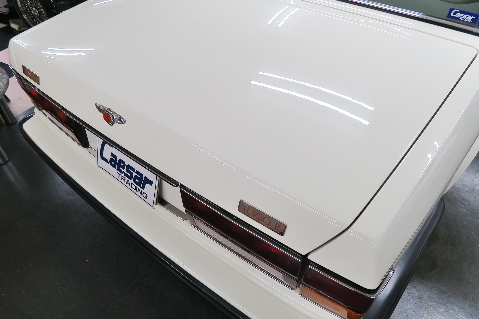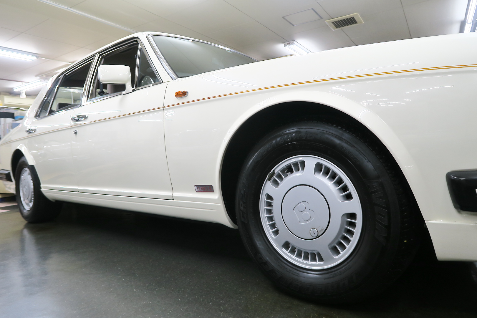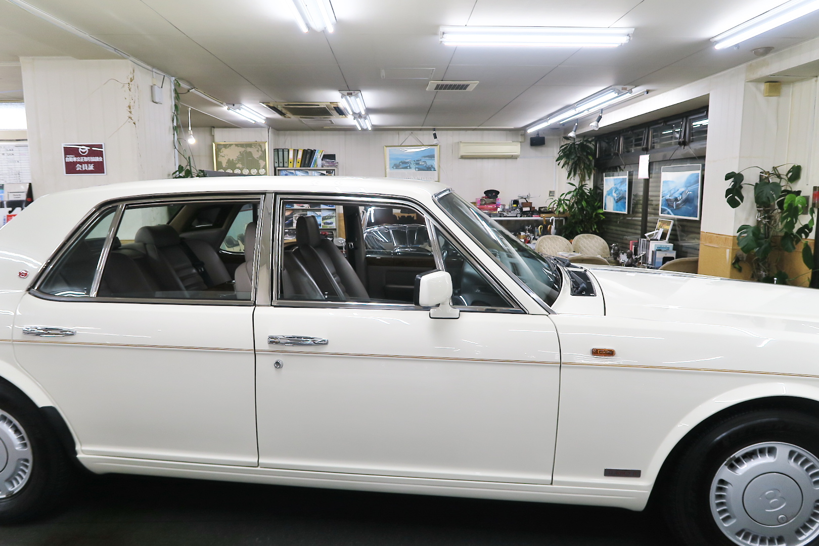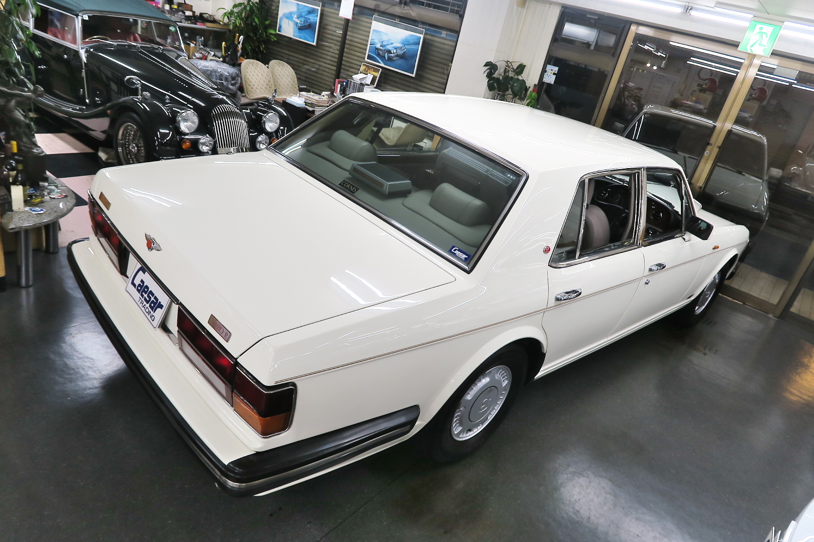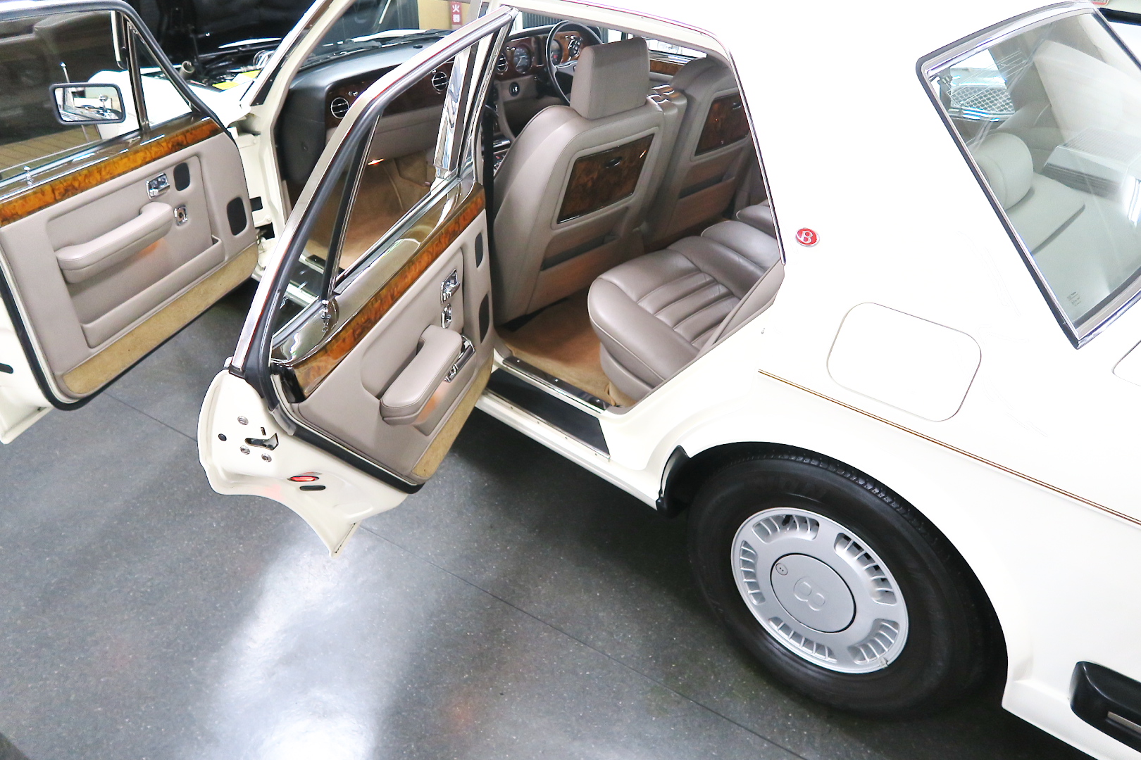 「ベントレー・ターボR」物語 「ロールス・ロイス」と「ベントレー」の生産比率(オーダー数)を逆転させた伝説の ホームラン王「ターボR」。 1965年から1980年の間に生産された「ロールス・ロイス」の4ドア・サルーン 「シャドウ」の生産台数は、「30.057台」、これに対し、ベントレーの4ドア・サルー ン、「T」は、その10分の1にも満たない、僅かに「2.289台」であった。 もはや、誰もが、ベントレーブランド自体を忘れそうになっていた。 おそらく、日本でも「ターボR」発売以前に「ベントレー」というブランドをよく知っ ていたのは、一部のエンスーな方だけであったろう。 この生産比率を逆転させる奇跡の原動力となったのが「ターボR」。 只者ではない。 ターボRの原点は、1982年に発表された「ミルザンヌ・ターボ」から始まる。 82年から85年の間に生産された、このモデルは、キャブ車のターボで、正直、 よろしくない。 トータル 516台生産されたらしいが、今となっては、当社も扱わない。 85年からは、名称を「ベントレー・ターボ」とし、インジェクション式のターボ付き となるが、本当の快進撃が始まるのは、1989年式モデルから、、 この年、エンブレムが「TURBO」から「TURBO R」に、、 外装を大型エアロパーツで武装、ヘッドライトが丸め四灯となる。 シートはバケットシート、タイヤは、ロールスの235サイズに対し、255サイズ、サス、 ショック共に「硬め」、最高速度は軽く200kmを超える、、明らかに、ロールスとは 違う、スポーツサルーン、、オーナードライバーズカーであることを強調。 しかも、時は、正にバブル絶頂期! これが 大ホームラン、名門「ベントレー」ブランドを復活してみせた。 1989年、ロールス社は年間生産台数が3000台を超えた(3254台)。 ハンドメイドの超高額モデルとしては大変な台数である。 1990年には、更に大掛かりな改良が行われ、シリーズ2へ進化、これが当車両、、 実際にベントレーがロールスの生産比率を超えたのは、この1990年のことである。 これは、「ベントレーS1」以来、実に45年ぶりの快挙であった。 この年のロールス社の年間生産台数(3274台)は、89年をも上回り、ベントレー 全盛期を迎えることになる。 90年当時のディーラー新車価格は、 ・ベントレーターボR 3100万円(税別) ・ベントレーラーボRL 3400万円(税別) ・R・RスパーU 3050万円(税別) ・R・RスピリットU 2750万円(税別) この価格設定からも、ロールスよりベントレーの方が高級、のイメージができあがる。 89年から91年にかけては、日本もバブル景気の全盛期、多くのベントレーが、正規 ディーラーのみならず、民間業者により並行車として輸入された。 当時は弊社とて、新車の「ターボR」を輸入したものだ。 が、流石に時間が経ってしまった、、近年では、この年式の極上個体のR・R、ベント レーは、ほとんど、見なくなった。 車自体は頑丈なのだが、中古車の流通価格が安くなりすぎて大切に扱われなくなったこ とと、仮に売り物がでても、その多くが、この円安で海外の業者に買われてしまってい ることが最大の原因であろう。 それが証拠に、先ほど、日本最大の掲載台数を誇る「カーセンサー」ネットで、 「ベントレー ターボR」と検索したところ、掲載車は、僅かに「4台」、それも、 内、2台は弊社の在庫車、、日本から消えた?? じゃなくても、今や当社の仕入基準を満たす個体は、ほぼない と言ってもよいほど、 さて、当車両のお話: ディーラー車 右ハンドル(90年モデル・90年8月登録) 当時は、「右H」は、完全にオーダー制で、注文される方も、10人にお一人くらい。 まだまだ「外車は左ハンドル」の時代であった。 当個体、複数オーナーであるが、弊社が、「2009年」に仕入れ、販売させて頂いた 元「シーザー認定号」、オーナー様は、2025年まで、16年間ご所有されていた。 今回は 終活の一環として、久しぶりの再入庫。 走行:「49.900km」 もちろん「実走」。 しかも、保管環境はバツグンで、販売させていただいた時と ほぼ変わりなし。 91年までに「ラッカー塗料」にありがちな「塗装クラック」箇所は、すでにリペア 対策済みで、クラックもなし。 ベース・コンディションは、極めて素晴らしい。 外装は、「アクリル・ホワイト」」 ソリッドのホワイト、真っ白ではなく、少し象牙色っぽい。 のちに「コーニッシュ・ホワイト」として復活した 良き時代のホワイト・カラー。 全長:「528cm」 ショートボディ、本来「RL」だけに付く「CピラーにBバッジ」、 純正フライングBマスコット 純正コーナーポール 当時の外装オプション全部付け 内装は、 「マッシュルーム」コノリーレザー。 オリジナル「コノリー」、ノンリペアで、ここまでキレイに残す。 マッシュルームというカラーを選択された方も極めて稀で、まず みない。 このカラー、汚れも目立たず、好きかな。 ウッドもノンリペアで 艶々っ オプションの「両面ウッド張りピクニック・テーブル」 この右テーブルを開いた箇所(ウッド面)