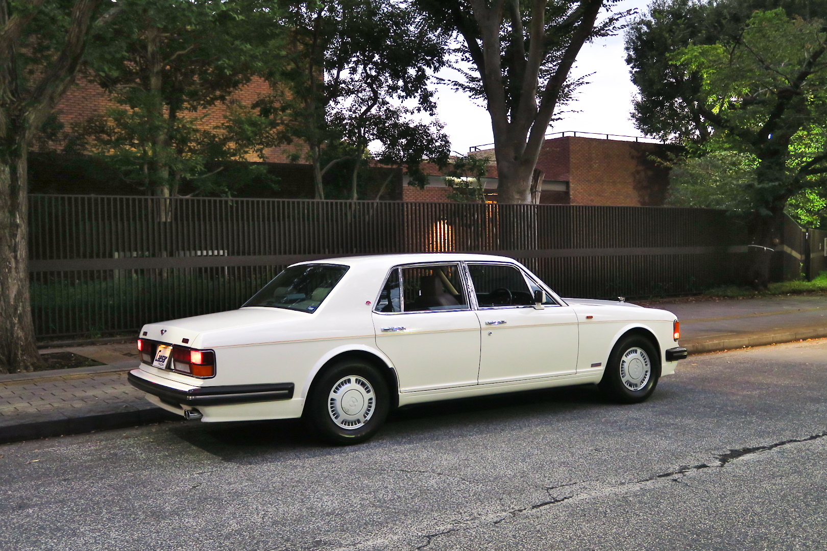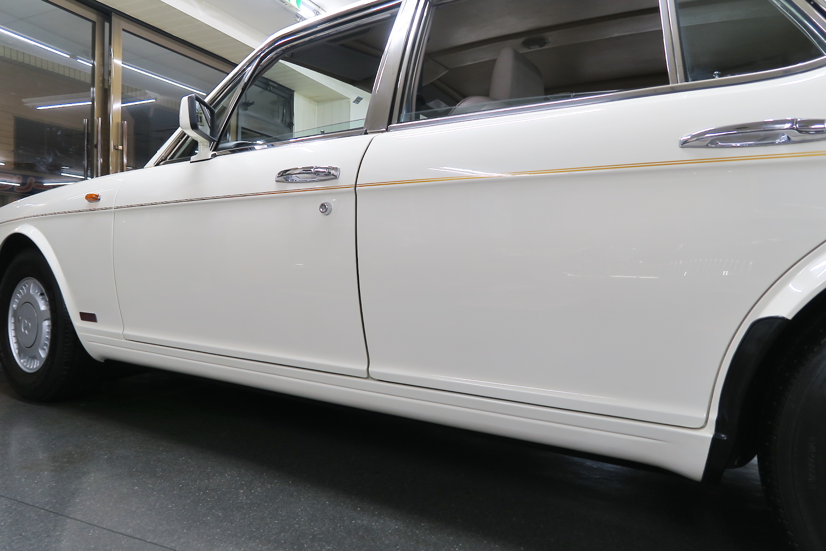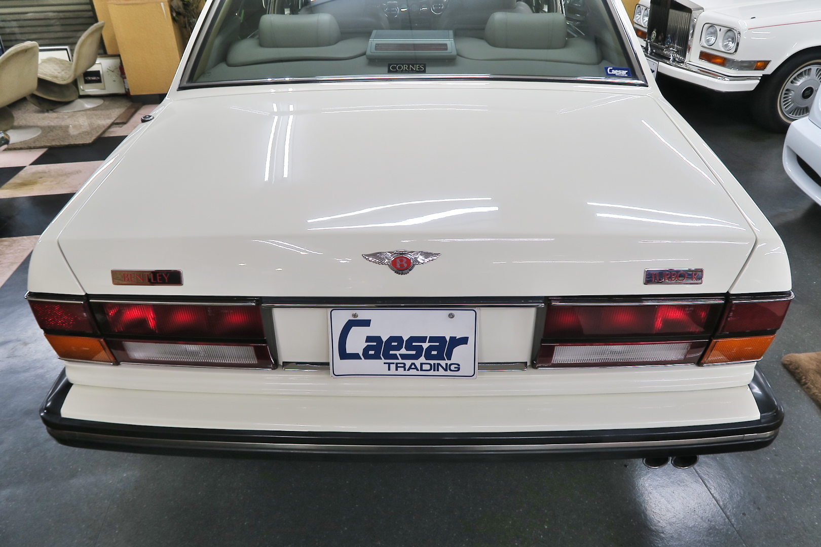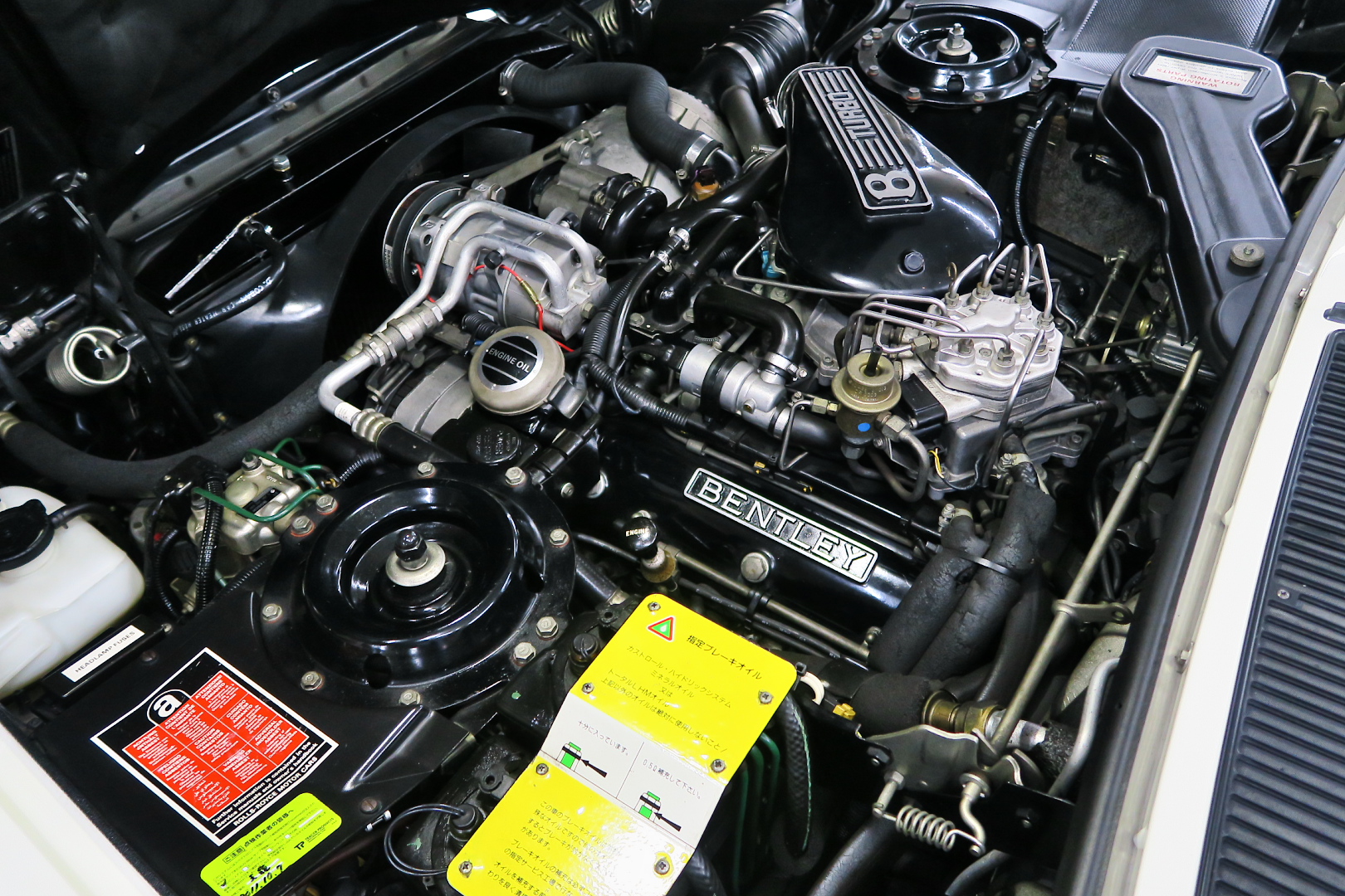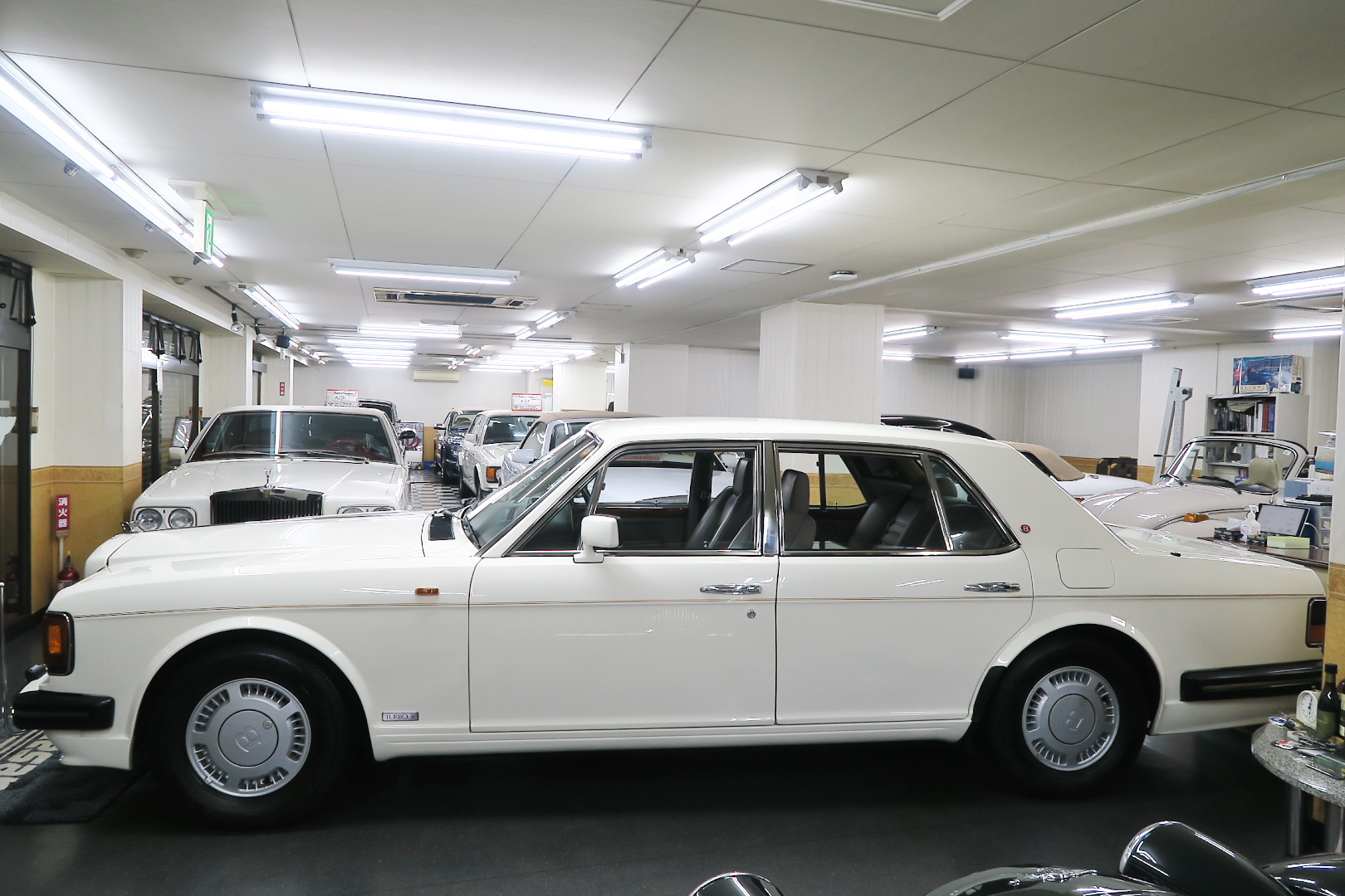 「ベントレー・ターボR」物語 「ロールス・ロイス」と「ベントレー」の生産比率(オーダー数)を逆転させた伝説の ホームラン王「ターボR」。 1965年から1980年の間に生産された「ロールス・ロイス」の4ドア・サルーン 「シャドウ」の生産台数は、「30.057台」、これに対し、ベントレーの4ドア・サルー ン、「T」は、その10分の1にも満たない、僅かに「2.289台」であった。 もはや、誰もが、ベントレーブランド自体を忘れそうになっていた。 おそらく、日本でも「ターボR」発売以前に「ベントレー」というブランドをよく知っ ていたのは、一部のエンスーな方だけであったろう。 この生産比率を逆転させる奇跡の原動力となったのが「ターボR」。 只者ではない。 ターボRの原点は、1982年に発表された「ミルザンヌ・ターボ」から始まる。 82年から85年の間に生産された、このモデルは、キャブ車のターボで、正直、 よろしくない。 トータル 516台生産されたらしいが、今となっては、当社も扱わない。 85年からは、名称を「ベントレー・ターボ」とし、インジェクション式のターボ付き となるが、本当の快進撃が始まるのは、1989年式モデルから、、 この年、エンブレムが「TURBO」から「TURBO R」に、、 外装を大型エアロパーツで武装、ヘッドライトが丸め四灯となる。 シートはバケットシート、タイヤは、ロールスの235サイズに対し、255サイズ、サス、 ショック共に「硬め」、最高速度は軽く200kmを超える、、明らかに、ロールスとは 違う、スポーツサルーン、、オーナードライバーズカーであることを強調。 しかも、時は、正にバブル絶頂期! これが 大ホームラン、名門「ベントレー」ブランドを復活してみせた。 1989年、ロールス社は年間生産台数が3000台を超えた(3254台)。 ハンドメイドの超高額モデルとしては大変な台数である。 1990年には、更に大掛かりな改良が行われ、シリーズ2へ進化、これが当車両、、 実際にベントレーがロールスの生産比率を超えたのは、この1990年のことである。 これは、「ベントレーS1」以来、実に45年ぶりの快挙であった。 この年のロールス社の年間生産台数(3274台)は、89年をも上回り、ベントレー 全盛期を迎えることになる。 90年当時のディーラー新車価格は、 ・ベントレーターボR 3100万円(税別) ・ベントレーラーボRL 3400万円(税別) ・R・RスパーU 3050万円(税別) ・R・RスピリットU 2750万円(税別) この価格設定からも、ロールスよりベントレーの方が高級、のイメージができあがる。 89年から91年にかけては、日本もバブル景気の全盛期、多くのベントレーが、正規 ディーラーのみならず、民間業者により並行車として輸入された。 当時は弊社とて、新車の「ターボR」を輸入したものだ。 が、流石に時間が経ってしまった、、近年では、この年式の極上個体のR・R、ベント レーは、ほとんど、見なくなった。 車自体は頑丈なのだが、中古車の流通価格が安くなりすぎて大切に扱われなくなったこ とと、仮に売り物がでても、その多くが、この円安で海外の業者に買われてしまってい ることが最大の原因であろう。 それが証拠に、先ほど、日本最大の掲載台数を誇る「カーセンサー」ネットで、 「ベントレー ターボR」と検索したところ、掲載車は、僅かに「4台」、それも、 内、2台は弊社の在庫車、、日本から消えた?? じゃなくても、今や当社の仕入基準を満たす個体は、ほぼない と言ってもよいほど、 さて、当車両のお話: ディーラー車 右ハンドル(90年モデル・90年8月登録) 当時は、「右H」は、完全にオーダー制で、注文される方も、10人にお一人くらい。 まだまだ「外車は左ハンドル」の時代であった。 当個体、複数オーナーであるが、弊社が、「2009年」に仕入れ、販売させて頂いた 元「シーザー認定号」、オーナー様は、2025年まで、16年間ご所有されていた。 今回は 終活の一環として、久しぶりの再入庫。 走行:「49.900km」 もちろん「実走」。 しかも、保管環境はバツグンで、販売させていただいた時と ほぼ変わりなし。 91年までに「ラッカー塗料」にありがちな「塗装クラック」箇所は、すでにリペア 対策済みで、クラックもなし。 ベース・コンディションは、極めて素晴らしい。 外装は、「アクリル・ホワイト」」 ソリッドのホワイト、真っ白ではなく、少し象牙色っぽい。 のちに「コーニッシュ・ホワイト」として復活した 良き時代のホワイト・カラー。 全長:「528cm」 ショートボディ、本来「RL」だけに付く「CピラーにBバッジ」、 純正フライングBマスコット 純正コーナーポール 当時の外装オプション全部付け 内装は、 「マッシュルーム」コノリーレザー。 オリジナル「コノリー」、ノンリペアで、ここまでキレイに残す。 マッシュルームというカラーを選択された方も極めて稀で、まず みない。 このカラー、汚れも目立たず、好きかな。 ウッドもノンリペアで 艶々っ オプションの「両面ウッド張りピクニック・テーブル」 この右テーブルを開いた箇所(ウッド面)