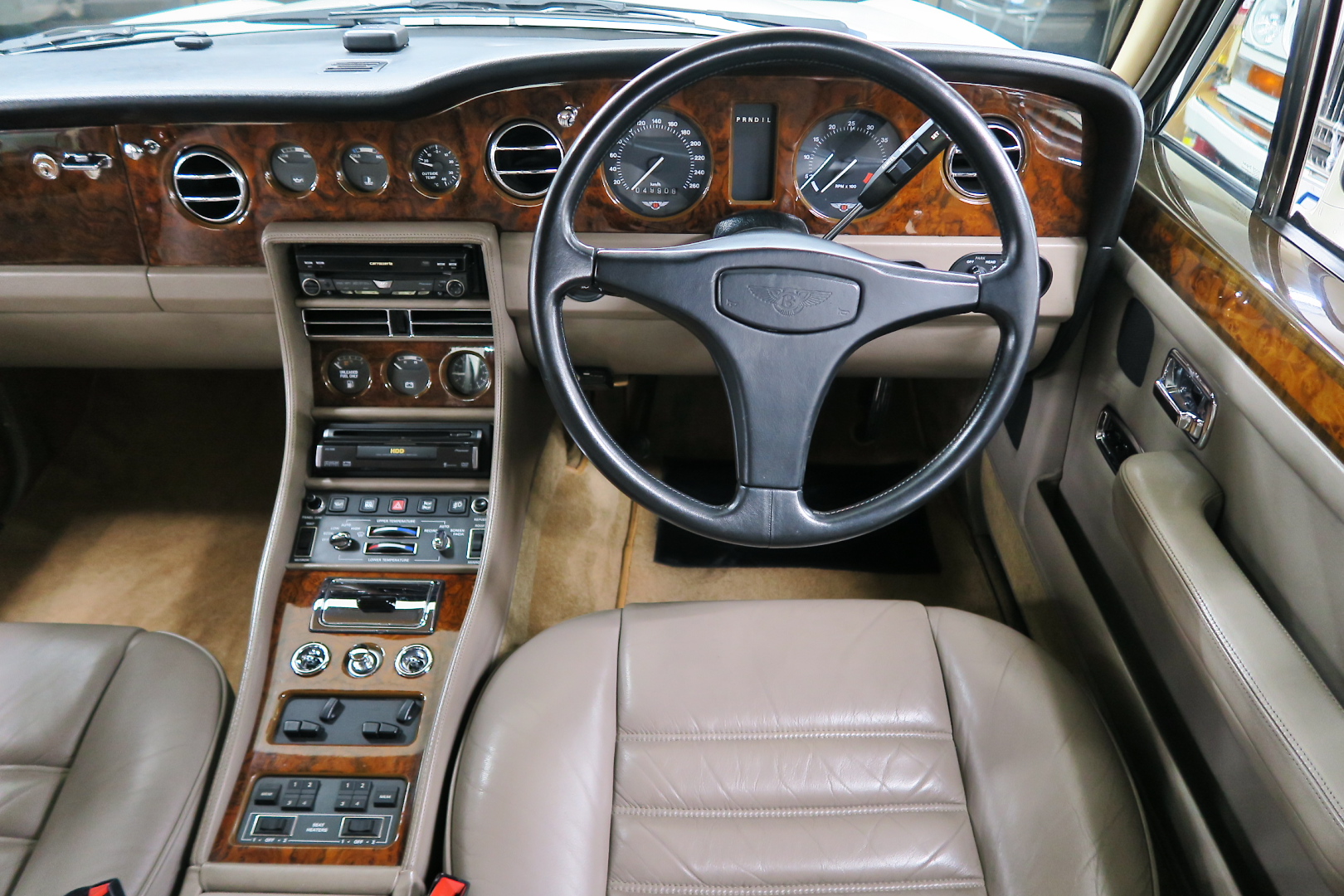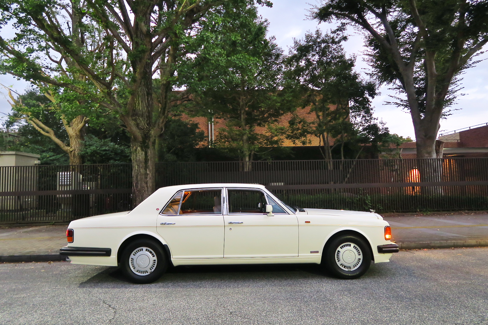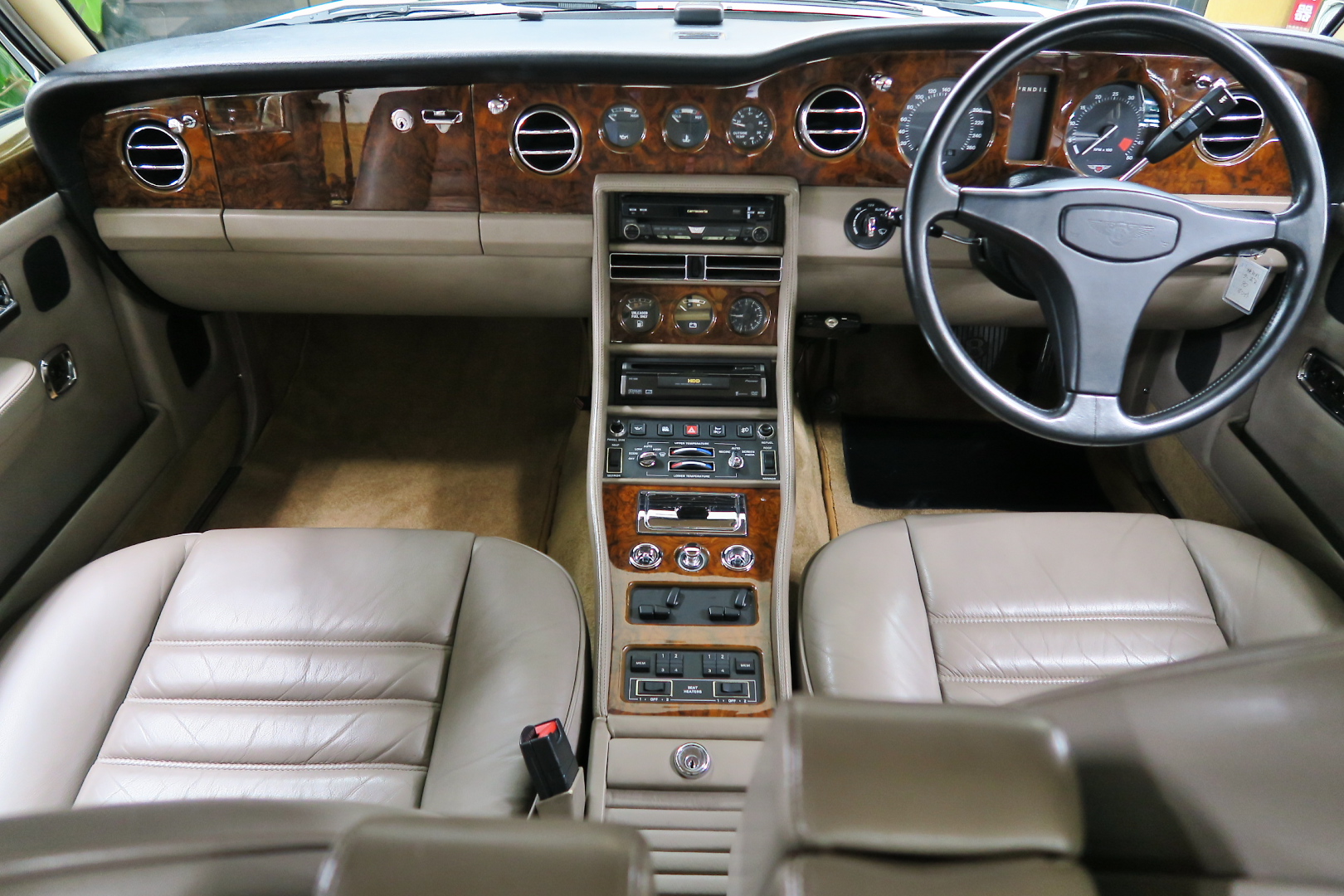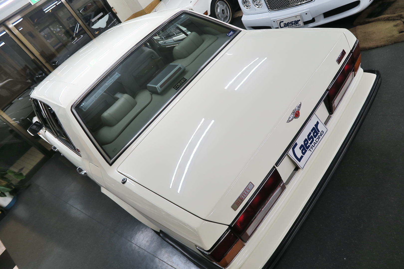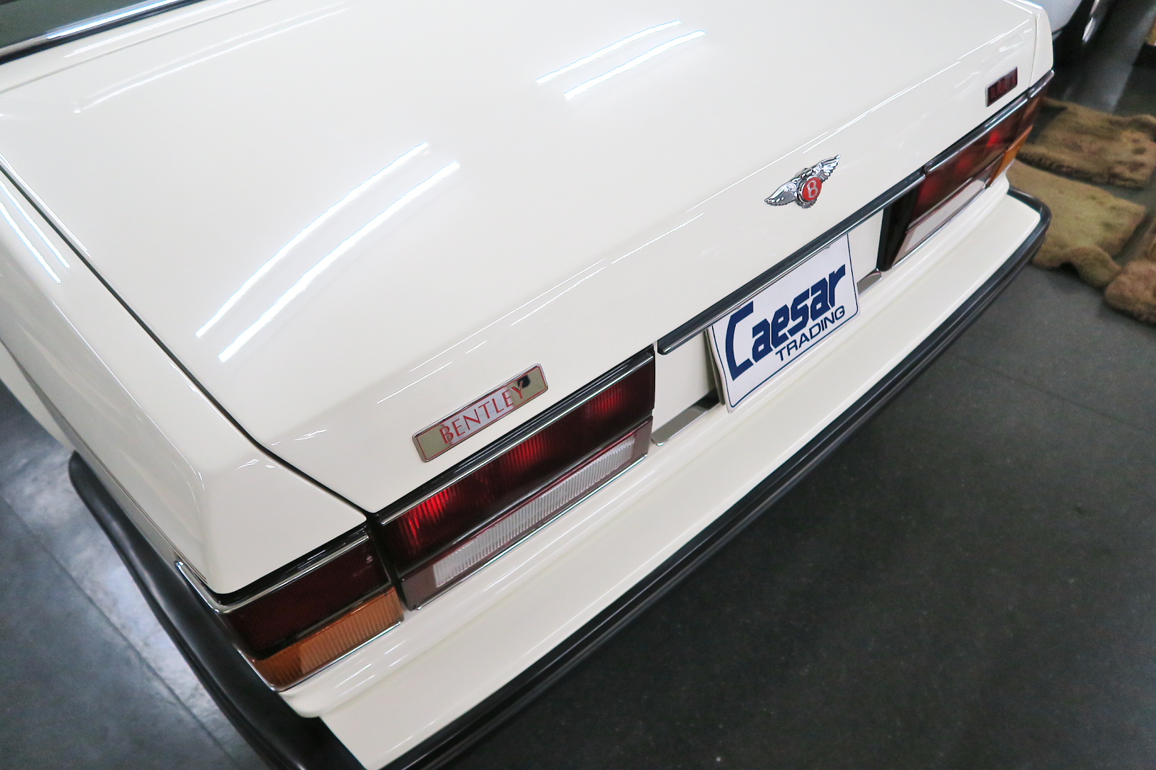 「ベントレー・ターボR」物語 「ロールス・ロイス」と「ベントレー」の生産比率(オーダー数)を逆転させた伝説の ホームラン王「ターボR」。 1965年から1980年の間に生産された「ロールス・ロイス」の4ドア・サルーン 「シャドウ」の生産台数は、「30.057台」、これに対し、ベントレーの4ドア・サルー ン、「T」は、その10分の1にも満たない、僅かに「2.289台」であった。 もはや、誰もが、ベントレーブランド自体を忘れそうになっていた。 おそらく、日本でも「ターボR」発売以前に「ベントレー」というブランドをよく知っ ていたのは、一部のエンスーな方だけであったろう。 この生産比率を逆転させる奇跡の原動力となったのが「ターボR」。 只者ではない。 ターボRの原点は、1982年に発表された「ミルザンヌ・ターボ」から始まる。 82年から85年の間に生産された、このモデルは、キャブ車のターボで、正直、 よろしくない。 トータル 516台生産されたらしいが、今となっては、当社も扱わない。 85年からは、名称を「ベントレー・ターボ」とし、インジェクション式のターボ付き となるが、本当の快進撃が始まるのは、1989年式モデルから、、 この年、エンブレムが「TURBO」から「TURBO R」に、、 外装を大型エアロパーツで武装、ヘッドライトが丸め四灯となる。 シートはバケットシート、タイヤは、ロールスの235サイズに対し、255サイズ、サス、 ショック共に「硬め」、最高速度は軽く200kmを超える、、明らかに、ロールスとは 違う、スポーツサルーン、、オーナードライバーズカーであることを強調。 しかも、時は、正にバブル絶頂期! これが 大ホームラン、名門「ベントレー」ブランドを復活してみせた。 1989年、ロールス社は年間生産台数が3000台を超えた(3254台)。 ハンドメイドの超高額モデルとしては大変な台数である。 1990年には、更に大掛かりな改良が行われ、シリーズ2へ進化、これが当車両、、 実際にベントレーがロールスの生産比率を超えたのは、この1990年のことである。 これは、「ベントレーS1」以来、実に45年ぶりの快挙であった。 この年のロールス社の年間生産台数(3274台)は、89年をも上回り、ベントレー 全盛期を迎えることになる。 90年当時のディーラー新車価格は、 ・ベントレーターボR 3100万円(税別) ・ベントレーラーボRL 3400万円(税別) ・R・RスパーU 3050万円(税別) ・R・RスピリットU 2750万円(税別) この価格設定からも、ロールスよりベントレーの方が高級、のイメージができあがる。 89年から91年にかけては、日本もバブル景気の全盛期、多くのベントレーが、正規 ディーラーのみならず、民間業者により並行車として輸入された。 当時は弊社とて、新車の「ターボR」を輸入したものだ。 が、流石に時間が経ってしまった、、近年では、この年式の極上個体のR・R、ベント レーは、ほとんど、見なくなった。 車自体は頑丈なのだが、中古車の流通価格が安くなりすぎて大切に扱われなくなったこ とと、仮に売り物がでても、その多くが、この円安で海外の業者に買われてしまってい ることが最大の原因であろう。 それが証拠に、先ほど、日本最大の掲載台数を誇る「カーセンサー」ネットで、 「ベントレー ターボR」と検索したところ、掲載車は、僅かに「4台」、それも、 内、2台は弊社の在庫車、、日本から消えた?? じゃなくても、今や当社の仕入基準を満たす個体は、ほぼない と言ってもよいほど、 さて、当車両のお話: ディーラー車 右ハンドル(90年モデル・90年8月登録) 当時は、「右H」は、完全にオーダー制で、注文される方も、10人にお一人くらい。 まだまだ「外車は左ハンドル」の時代であった。 当個体、複数オーナーであるが、弊社が、「2009年」に仕入れ、販売させて頂いた 元「シーザー認定号」、オーナー様は、2025年まで、16年間ご所有されていた。 今回は 終活の一環として、久しぶりの再入庫。 走行:「49.900km」 もちろん「実走」。 しかも、保管環境はバツグンで、販売させていただいた時と ほぼ変わりなし。 91年までに「ラッカー塗料」にありがちな「塗装クラック」箇所は、すでにリペア 対策済みで、クラックもなし。 ベース・コンディションは、極めて素晴らしい。 外装は、「アクリル・ホワイト」」 ソリッドのホワイト、真っ白ではなく、少し象牙色っぽい。 のちに「コーニッシュ・ホワイト」として復活した 良き時代のホワイト・カラー。 全長:「528cm」 ショートボディ、本来「RL」だけに付く「CピラーにBバッジ」、 純正フライングBマスコット 純正コーナーポール 当時の外装オプション全部付け 内装は、 「マッシュルーム」コノリーレザー。 オリジナル「コノリー」、ノンリペアで、ここまでキレイに残す。 マッシュルームというカラーを選択された方も極めて稀で、まず みない。 このカラー、汚れも目立たず、好きかな。 ウッドもノンリペアで 艶々っ オプションの「両面ウッド張りピクニック・テーブル」 この右テーブルを開いた箇所(ウッド面)