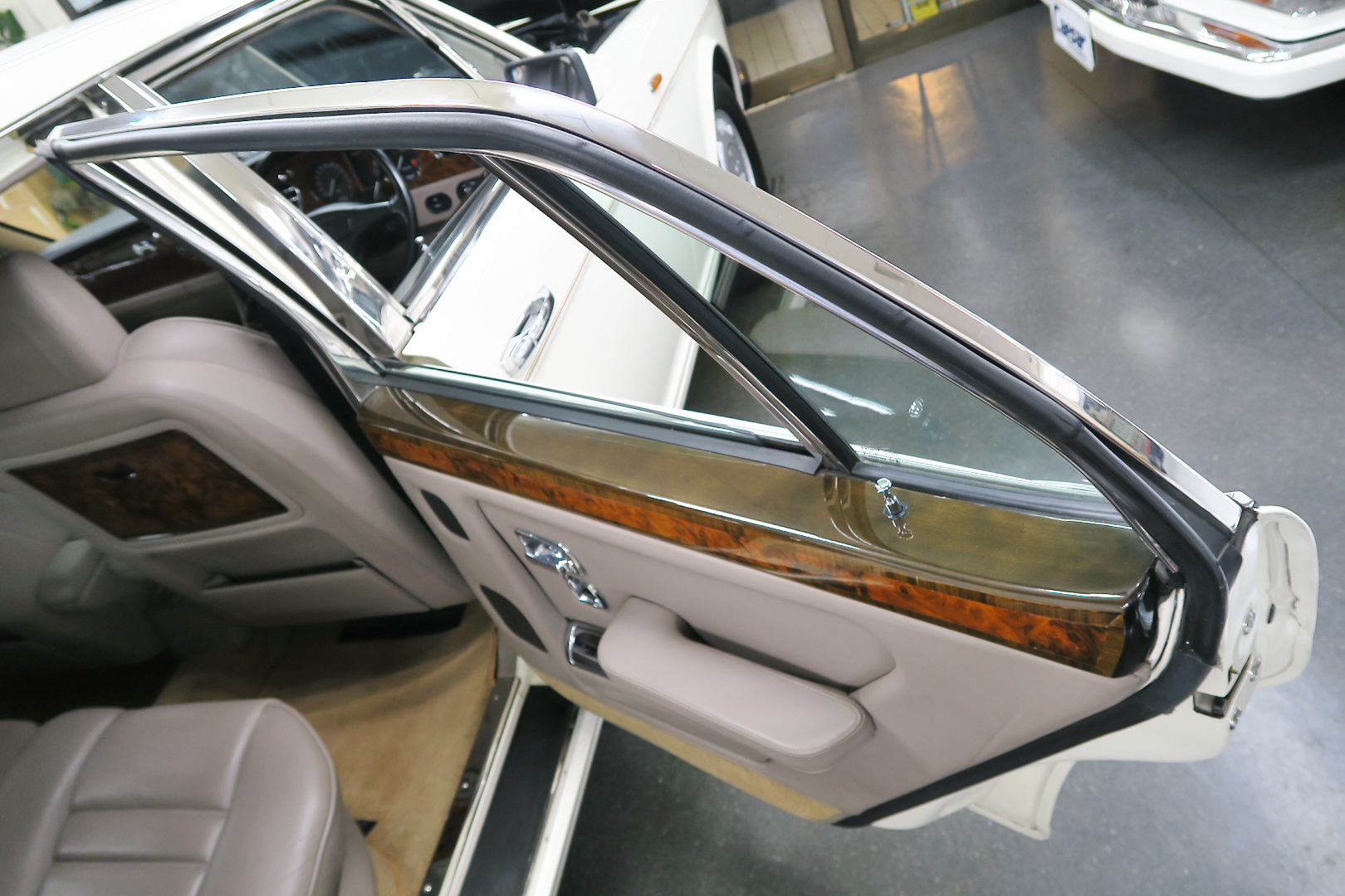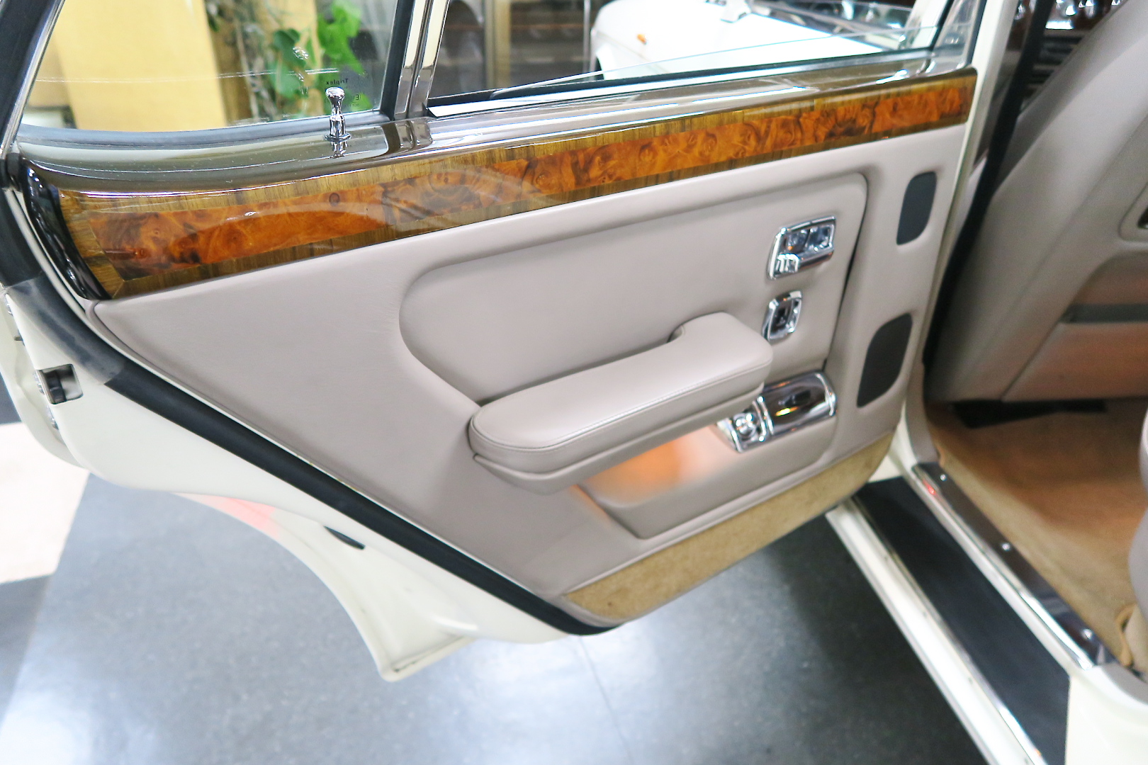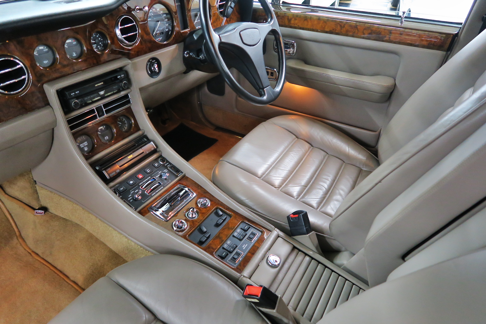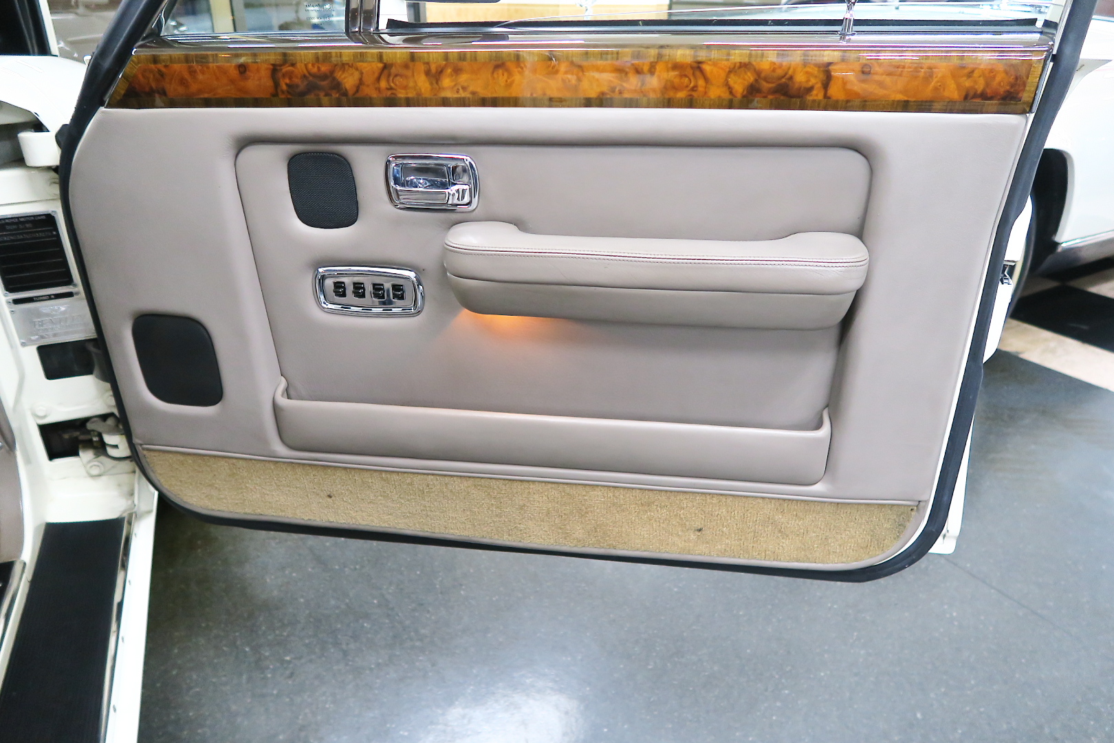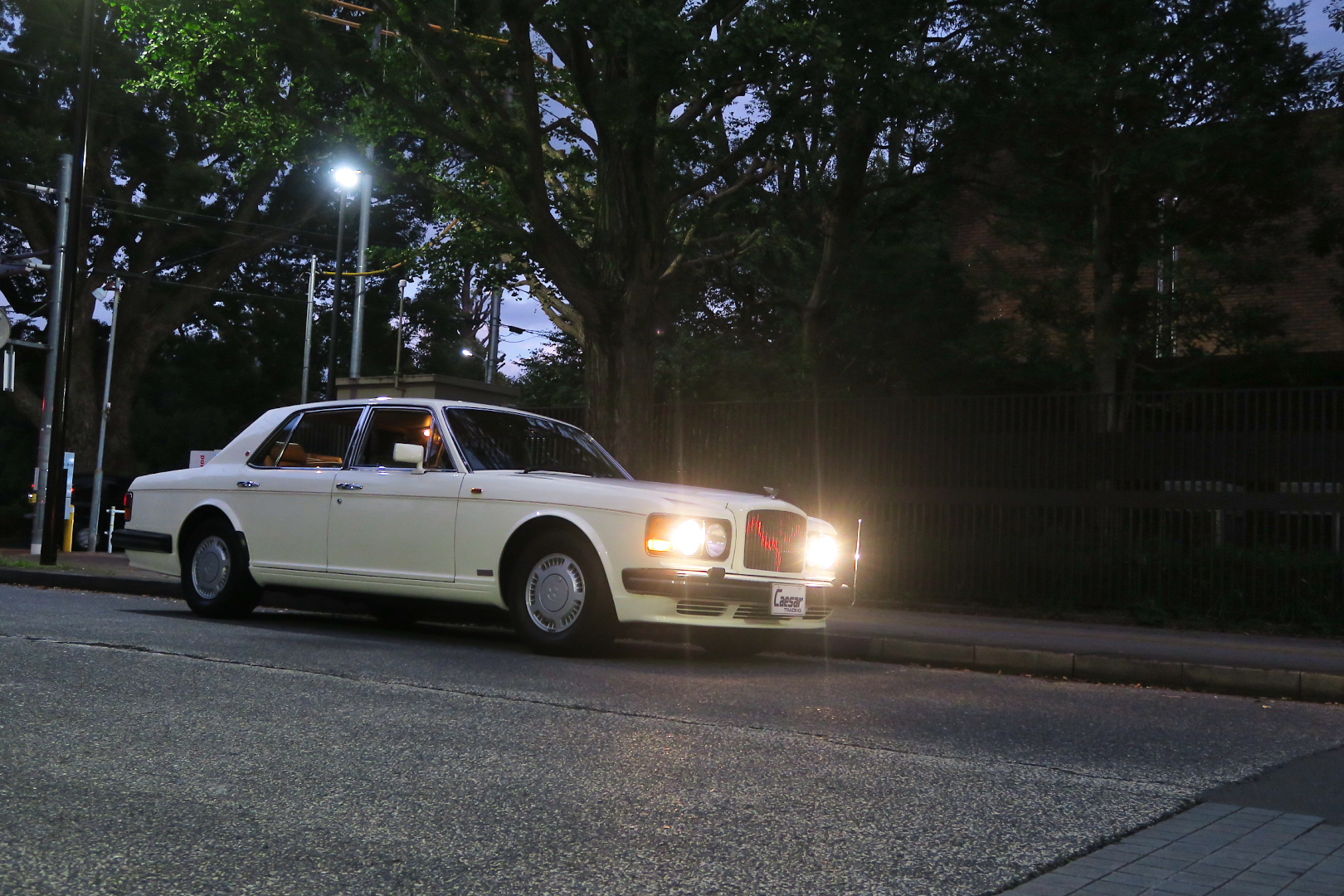 「ベントレー・ターボR」物語 「ロールス・ロイス」と「ベントレー」の生産比率(オーダー数)を逆転させた伝説の ホームラン王「ターボR」。 1965年から1980年の間に生産された「ロールス・ロイス」の4ドア・サルーン 「シャドウ」の生産台数は、「30.057台」、これに対し、ベントレーの4ドア・サルー ン、「T」は、その10分の1にも満たない、僅かに「2.289台」であった。 もはや、誰もが、ベントレーブランド自体を忘れそうになっていた。 おそらく、日本でも「ターボR」発売以前に「ベントレー」というブランドをよく知っ ていたのは、一部のエンスーな方だけであったろう。 この生産比率を逆転させる奇跡の原動力となったのが「ターボR」。 只者ではない。 ターボRの原点は、1982年に発表された「ミルザンヌ・ターボ」から始まる。 82年から85年の間に生産された、このモデルは、キャブ車のターボで、正直、 よろしくない。 トータル 516台生産されたらしいが、今となっては、当社も扱わない。 85年からは、名称を「ベントレー・ターボ」とし、インジェクション式のターボ付き となるが、本当の快進撃が始まるのは、1989年式モデルから、、 この年、エンブレムが「TURBO」から「TURBO R」に、、 外装を大型エアロパーツで武装、ヘッドライトが丸め四灯となる。 シートはバケットシート、タイヤは、ロールスの235サイズに対し、255サイズ、サス、 ショック共に「硬め」、最高速度は軽く200kmを超える、、明らかに、ロールスとは 違う、スポーツサルーン、、オーナードライバーズカーであることを強調。 しかも、時は、正にバブル絶頂期! これが 大ホームラン、名門「ベントレー」ブランドを復活してみせた。 1989年、ロールス社は年間生産台数が3000台を超えた(3254台)。 ハンドメイドの超高額モデルとしては大変な台数である。 1990年には、更に大掛かりな改良が行われ、シリーズ2へ進化、これが当車両、、 実際にベントレーがロールスの生産比率を超えたのは、この1990年のことである。 これは、「ベントレーS1」以来、実に45年ぶりの快挙であった。 この年のロールス社の年間生産台数(3274台)は、89年をも上回り、ベントレー 全盛期を迎えることになる。 90年当時のディーラー新車価格は、 ・ベントレーターボR 3100万円(税別) ・ベントレーラーボRL 3400万円(税別) ・R・RスパーU 3050万円(税別) ・R・RスピリットU 2750万円(税別) この価格設定からも、ロールスよりベントレーの方が高級、のイメージができあがる。 89年から91年にかけては、日本もバブル景気の全盛期、多くのベントレーが、正規 ディーラーのみならず、民間業者により並行車として輸入された。 当時は弊社とて、新車の「ターボR」を輸入したものだ。 が、流石に時間が経ってしまった、、近年では、この年式の極上個体のR・R、ベント レーは、ほとんど、見なくなった。 車自体は頑丈なのだが、中古車の流通価格が安くなりすぎて大切に扱われなくなったこ とと、仮に売り物がでても、その多くが、この円安で海外の業者に買われてしまってい ることが最大の原因であろう。 それが証拠に、先ほど、日本最大の掲載台数を誇る「カーセンサー」ネットで、 「ベントレー ターボR」と検索したところ、掲載車は、僅かに「4台」、それも、 内、2台は弊社の在庫車、、日本から消えた?? じゃなくても、今や当社の仕入基準を満たす個体は、ほぼない と言ってもよいほど、 さて、当車両のお話: ディーラー車 右ハンドル(90年モデル・90年8月登録) 当時は、「右H」は、完全にオーダー制で、注文される方も、10人にお一人くらい。 まだまだ「外車は左ハンドル」の時代であった。 当個体、複数オーナーであるが、弊社が、「2009年」に仕入れ、販売させて頂いた 元「シーザー認定号」、オーナー様は、2025年まで、16年間ご所有されていた。 今回は 終活の一環として、久しぶりの再入庫。 走行:「49.900km」 もちろん「実走」。 しかも、保管環境はバツグンで、販売させていただいた時と ほぼ変わりなし。 91年までに「ラッカー塗料」にありがちな「塗装クラック」箇所は、すでにリペア 対策済みで、クラックもなし。 ベース・コンディションは、極めて素晴らしい。 外装は、「アクリル・ホワイト」」 ソリッドのホワイト、真っ白ではなく、少し象牙色っぽい。 のちに「コーニッシュ・ホワイト」として復活した 良き時代のホワイト・カラー。 全長:「528cm」 ショートボディ、本来「RL」だけに付く「CピラーにBバッジ」、 純正フライングBマスコット 純正コーナーポール 当時の外装オプション全部付け 内装は、 「マッシュルーム」コノリーレザー。 オリジナル「コノリー」、ノンリペアで、ここまでキレイに残す。 マッシュルームというカラーを選択された方も極めて稀で、まず みない。 このカラー、汚れも目立たず、好きかな。 ウッドもノンリペアで 艶々っ オプションの「両面ウッド張りピクニック・テーブル」 この右テーブルを開いた箇所(ウッド面)