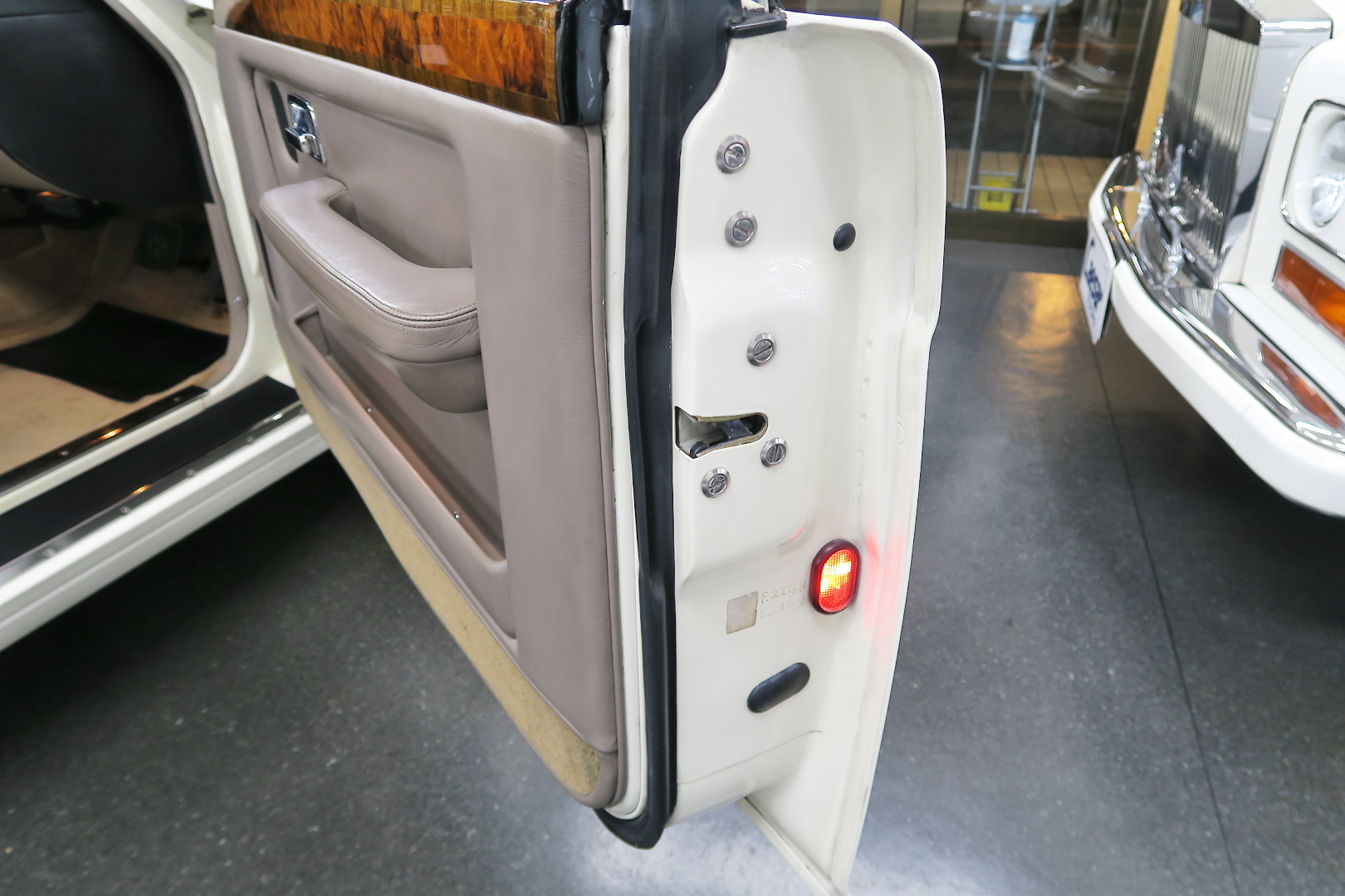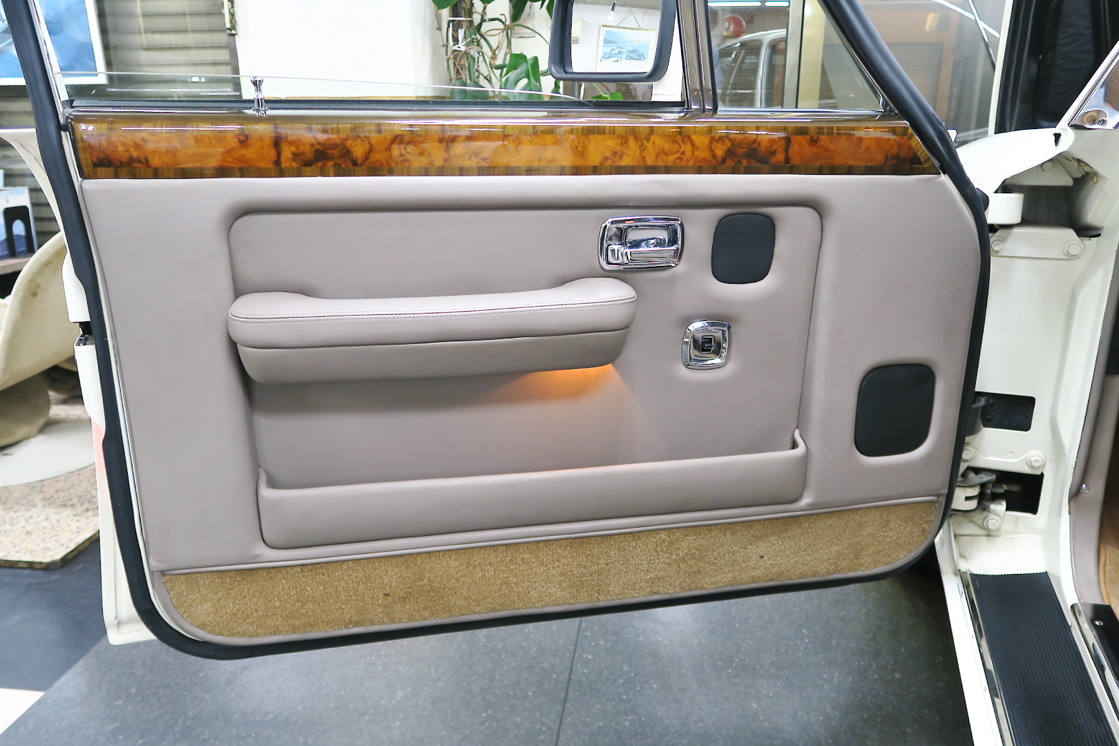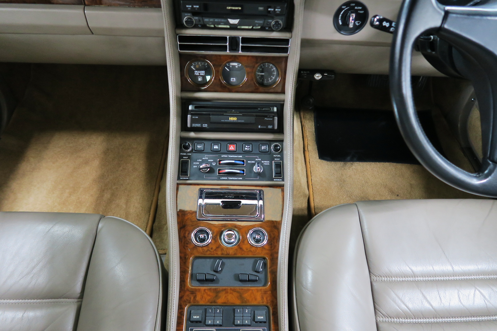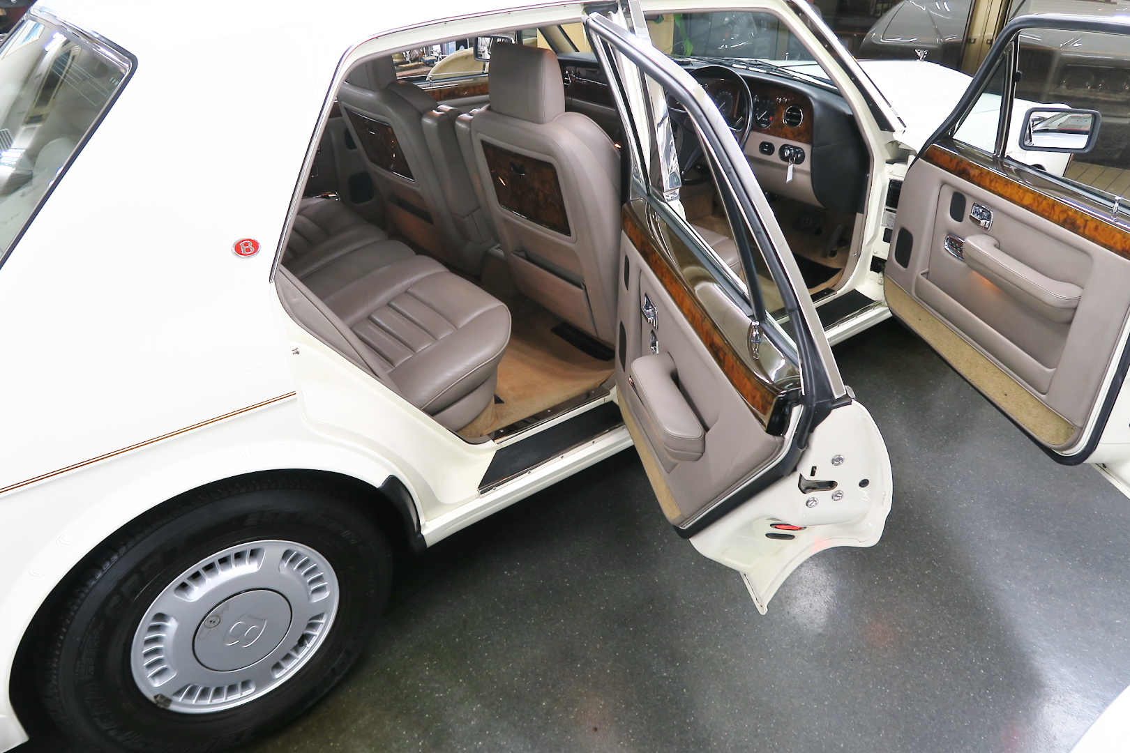 「ベントレー・ターボR」物語 「ロールス・ロイス」と「ベントレー」の生産比率(オーダー数)を逆転させた伝説の ホームラン王「ターボR」。 1965年から1980年の間に生産された「ロールス・ロイス」の4ドア・サルーン 「シャドウ」の生産台数は、「30.057台」、これに対し、ベントレーの4ドア・サルー ン、「T」は、その10分の1にも満たない、僅かに「2.289台」であった。 もはや、誰もが、ベントレーブランド自体を忘れそうになっていた。 おそらく、日本でも「ターボR」発売以前に「ベントレー」というブランドをよく知っ ていたのは、一部のエンスーな方だけであったろう。 この生産比率を逆転させる奇跡の原動力となったのが「ターボR」。 只者ではない。 ターボRの原点は、1982年に発表された「ミルザンヌ・ターボ」から始まる。 82年から85年の間に生産された、このモデルは、キャブ車のターボで、正直、 よろしくない。 トータル 516台生産されたらしいが、今となっては、当社も扱わない。 85年からは、名称を「ベントレー・ターボ」とし、インジェクション式のターボ付き となるが、本当の快進撃が始まるのは、1989年式モデルから、、 この年、エンブレムが「TURBO」から「TURBO R」に、、 外装を大型エアロパーツで武装、ヘッドライトが丸め四灯となる。 シートはバケットシート、タイヤは、ロールスの235サイズに対し、255サイズ、サス、 ショック共に「硬め」、最高速度は軽く200kmを超える、、明らかに、ロールスとは 違う、スポーツサルーン、、オーナードライバーズカーであることを強調。 しかも、時は、正にバブル絶頂期! これが 大ホームラン、名門「ベントレー」ブランドを復活してみせた。 1989年、ロールス社は年間生産台数が3000台を超えた(3254台)。 ハンドメイドの超高額モデルとしては大変な台数である。 1990年には、更に大掛かりな改良が行われ、シリーズ2へ進化、これが当車両、、 実際にベントレーがロールスの生産比率を超えたのは、この1990年のことである。 これは、「ベントレーS1」以来、実に45年ぶりの快挙であった。 この年のロールス社の年間生産台数(3274台)は、89年をも上回り、ベントレー 全盛期を迎えることになる。 90年当時のディーラー新車価格は、 ・ベントレーターボR 3100万円(税別) ・ベントレーラーボRL 3400万円(税別) ・R・RスパーU 3050万円(税別) ・R・RスピリットU 2750万円(税別) この価格設定からも、ロールスよりベントレーの方が高級、のイメージができあがる。 89年から91年にかけては、日本もバブル景気の全盛期、多くのベントレーが、正規 ディーラーのみならず、民間業者により並行車として輸入された。 当時は弊社とて、新車の「ターボR」を輸入したものだ。 が、流石に時間が経ってしまった、、近年では、この年式の極上個体のR・R、ベント レーは、ほとんど、見なくなった。 車自体は頑丈なのだが、中古車の流通価格が安くなりすぎて大切に扱われなくなったこ とと、仮に売り物がでても、その多くが、この円安で海外の業者に買われてしまってい ることが最大の原因であろう。 それが証拠に、先ほど、日本最大の掲載台数を誇る「カーセンサー」ネットで、 「ベントレー ターボR」と検索したところ、掲載車は、僅かに「4台」、それも、 内、2台は弊社の在庫車、、日本から消えた?? じゃなくても、今や当社の仕入基準を満たす個体は、ほぼない と言ってもよいほど、 さて、当車両のお話: ディーラー車 右ハンドル(90年モデル・90年8月登録) 当時は、「右H」は、完全にオーダー制で、注文される方も、10人にお一人くらい。 まだまだ「外車は左ハンドル」の時代であった。 当個体、複数オーナーであるが、弊社が、「2009年」に仕入れ、販売させて頂いた 元「シーザー認定号」、オーナー様は、2025年まで、16年間ご所有されていた。 今回は 終活の一環として、久しぶりの再入庫。 走行:「49.900km」 もちろん「実走」。 しかも、保管環境はバツグンで、販売させていただいた時と ほぼ変わりなし。 91年までに「ラッカー塗料」にありがちな「塗装クラック」箇所は、すでにリペア 対策済みで、クラックもなし。 ベース・コンディションは、極めて素晴らしい。 外装は、「アクリル・ホワイト」」 ソリッドのホワイト、真っ白ではなく、少し象牙色っぽい。 のちに「コーニッシュ・ホワイト」として復活した 良き時代のホワイト・カラー。 全長:「528cm」 ショートボディ、本来「RL」だけに付く「CピラーにBバッジ」、 純正フライングBマスコット 純正コーナーポール 当時の外装オプション全部付け 内装は、 「マッシュルーム」コノリーレザー。 オリジナル「コノリー」、ノンリペアで、ここまでキレイに残す。 マッシュルームというカラーを選択された方も極めて稀で、まず みない。 このカラー、汚れも目立たず、好きかな。 ウッドもノンリペアで 艶々っ オプションの「両面ウッド張りピクニック・テーブル」 この右テーブルを開いた箇所(ウッド面)