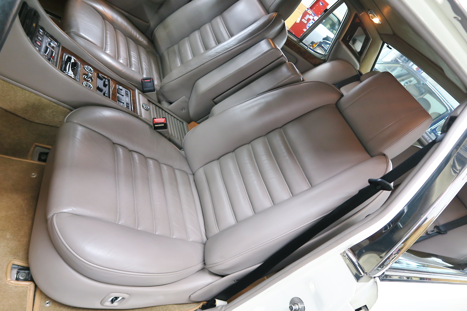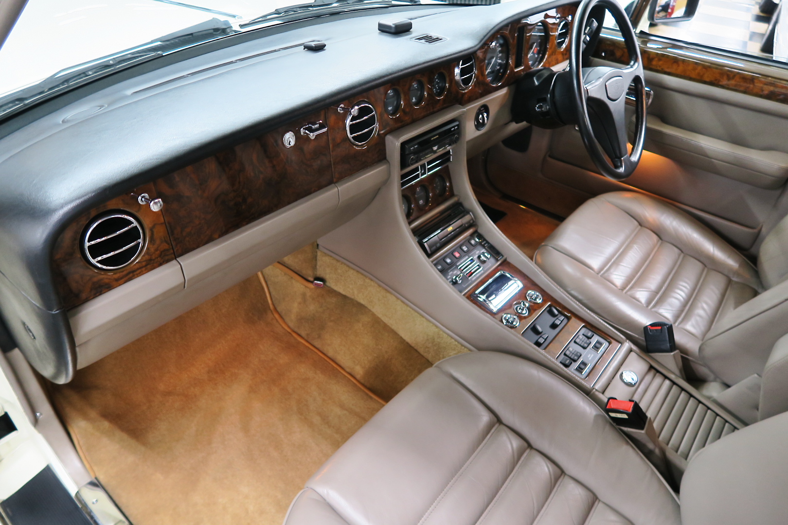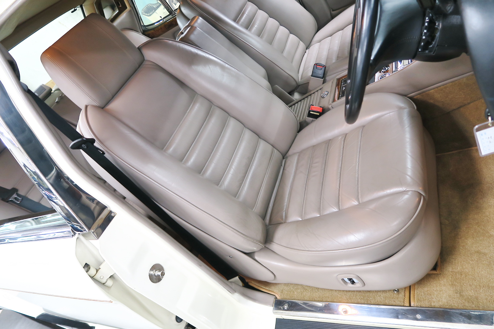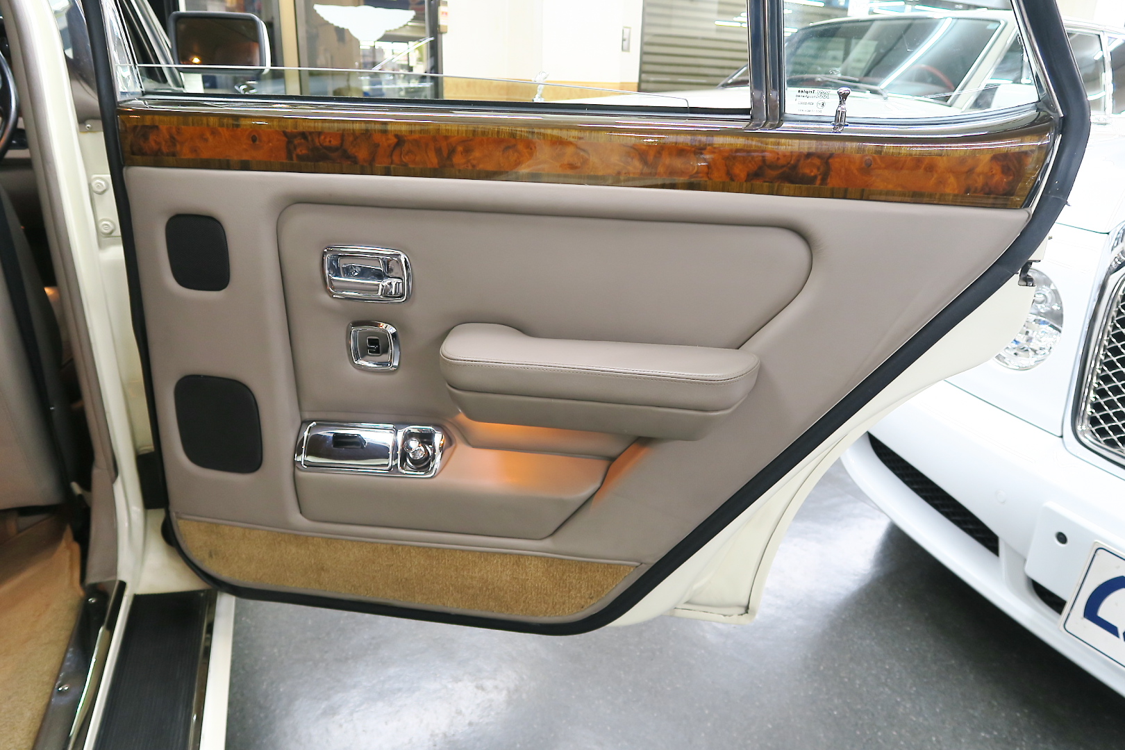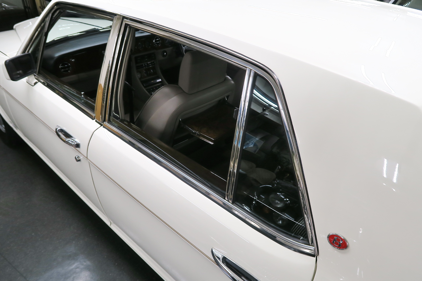 「ベントレー・ターボR」物語 「ロールス・ロイス」と「ベントレー」の生産比率(オーダー数)を逆転させた伝説の ホームラン王「ターボR」。 1965年から1980年の間に生産された「ロールス・ロイス」の4ドア・サルーン 「シャドウ」の生産台数は、「30.057台」、これに対し、ベントレーの4ドア・サルー ン、「T」は、その10分の1にも満たない、僅かに「2.289台」であった。 もはや、誰もが、ベントレーブランド自体を忘れそうになっていた。 おそらく、日本でも「ターボR」発売以前に「ベントレー」というブランドをよく知っ ていたのは、一部のエンスーな方だけであったろう。 この生産比率を逆転させる奇跡の原動力となったのが「ターボR」。 只者ではない。 ターボRの原点は、1982年に発表された「ミルザンヌ・ターボ」から始まる。 82年から85年の間に生産された、このモデルは、キャブ車のターボで、正直、 よろしくない。 トータル 516台生産されたらしいが、今となっては、当社も扱わない。 85年からは、名称を「ベントレー・ターボ」とし、インジェクション式のターボ付き となるが、本当の快進撃が始まるのは、1989年式モデルから、、 この年、エンブレムが「TURBO」から「TURBO R」に、、 外装を大型エアロパーツで武装、ヘッドライトが丸め四灯となる。 シートはバケットシート、タイヤは、ロールスの235サイズに対し、255サイズ、サス、 ショック共に「硬め」、最高速度は軽く200kmを超える、、明らかに、ロールスとは 違う、スポーツサルーン、、オーナードライバーズカーであることを強調。 しかも、時は、正にバブル絶頂期! これが 大ホームラン、名門「ベントレー」ブランドを復活してみせた。 1989年、ロールス社は年間生産台数が3000台を超えた(3254台)。 ハンドメイドの超高額モデルとしては大変な台数である。 1990年には、更に大掛かりな改良が行われ、シリーズ2へ進化、これが当車両、、 実際にベントレーがロールスの生産比率を超えたのは、この1990年のことである。 これは、「ベントレーS1」以来、実に45年ぶりの快挙であった。 この年のロールス社の年間生産台数(3274台)は、89年をも上回り、ベントレー 全盛期を迎えることになる。 90年当時のディーラー新車価格は、 ・ベントレーターボR 3100万円(税別) ・ベントレーラーボRL 3400万円(税別) ・R・RスパーU 3050万円(税別) ・R・RスピリットU 2750万円(税別) この価格設定からも、ロールスよりベントレーの方が高級、のイメージができあがる。 89年から91年にかけては、日本もバブル景気の全盛期、多くのベントレーが、正規 ディーラーのみならず、民間業者により並行車として輸入された。 当時は弊社とて、新車の「ターボR」を輸入したものだ。 が、流石に時間が経ってしまった、、近年では、この年式の極上個体のR・R、ベント レーは、ほとんど、見なくなった。 車自体は頑丈なのだが、中古車の流通価格が安くなりすぎて大切に扱われなくなったこ とと、仮に売り物がでても、その多くが、この円安で海外の業者に買われてしまってい ることが最大の原因であろう。 それが証拠に、先ほど、日本最大の掲載台数を誇る「カーセンサー」ネットで、 「ベントレー ターボR」と検索したところ、掲載車は、僅かに「4台」、それも、 内、2台は弊社の在庫車、、日本から消えた?? じゃなくても、今や当社の仕入基準を満たす個体は、ほぼない と言ってもよいほど、 さて、当車両のお話: ディーラー車 右ハンドル(90年モデル・90年8月登録) 当時は、「右H」は、完全にオーダー制で、注文される方も、10人にお一人くらい。 まだまだ「外車は左ハンドル」の時代であった。 当個体、複数オーナーであるが、弊社が、「2009年」に仕入れ、販売させて頂いた 元「シーザー認定号」、オーナー様は、2025年まで、16年間ご所有されていた。 今回は 終活の一環として、久しぶりの再入庫。 走行:「49.900km」 もちろん「実走」。 しかも、保管環境はバツグンで、販売させていただいた時と ほぼ変わりなし。 91年までに「ラッカー塗料」にありがちな「塗装クラック」箇所は、すでにリペア 対策済みで、クラックもなし。 ベース・コンディションは、極めて素晴らしい。 外装は、「アクリル・ホワイト」」 ソリッドのホワイト、真っ白ではなく、少し象牙色っぽい。 のちに「コーニッシュ・ホワイト」として復活した 良き時代のホワイト・カラー。 全長:「528cm」 ショートボディ、本来「RL」だけに付く「CピラーにBバッジ」、 純正フライングBマスコット 純正コーナーポール 当時の外装オプション全部付け 内装は、 「マッシュルーム」コノリーレザー。 オリジナル「コノリー」、ノンリペアで、ここまでキレイに残す。 マッシュルームというカラーを選択された方も極めて稀で、まず みない。 このカラー、汚れも目立たず、好きかな。 ウッドもノンリペアで 艶々っ オプションの「両面ウッド張りピクニック・テーブル」 この右テーブルを開いた箇所(ウッド面)