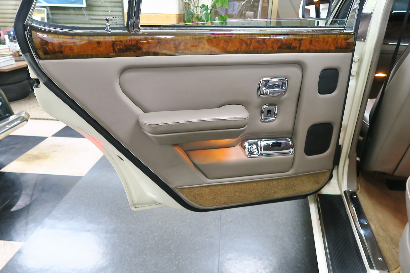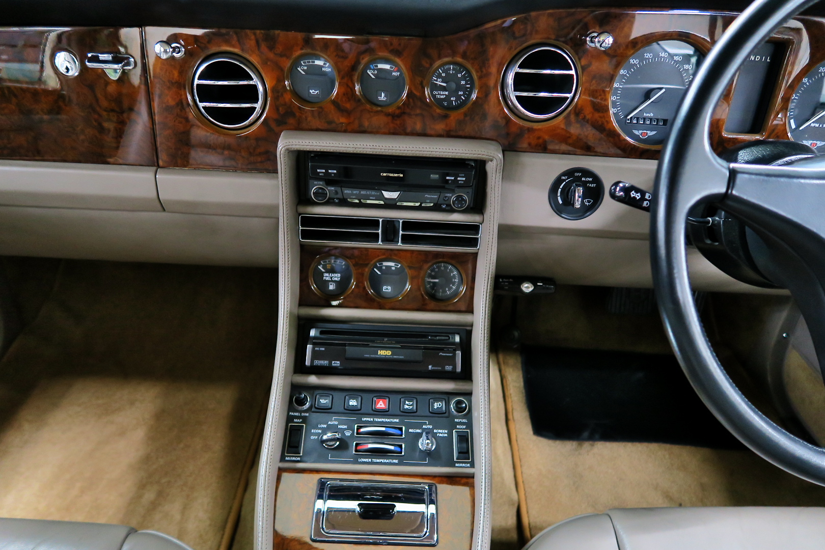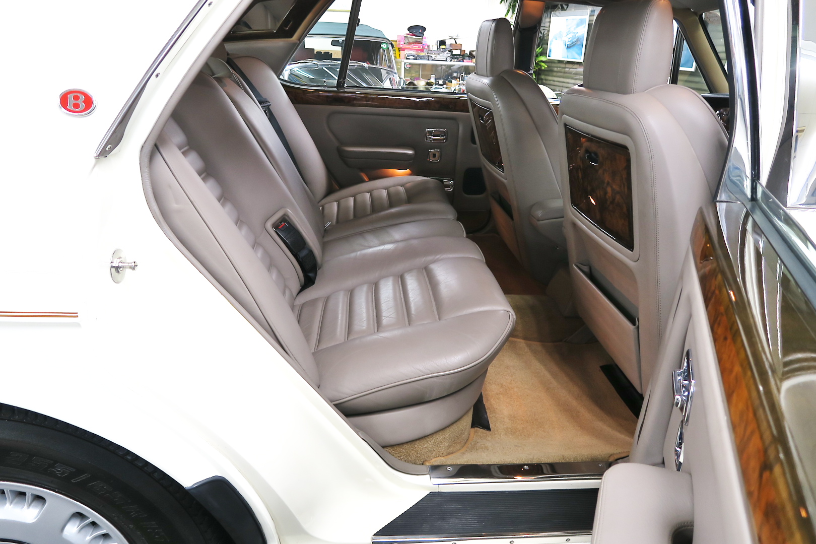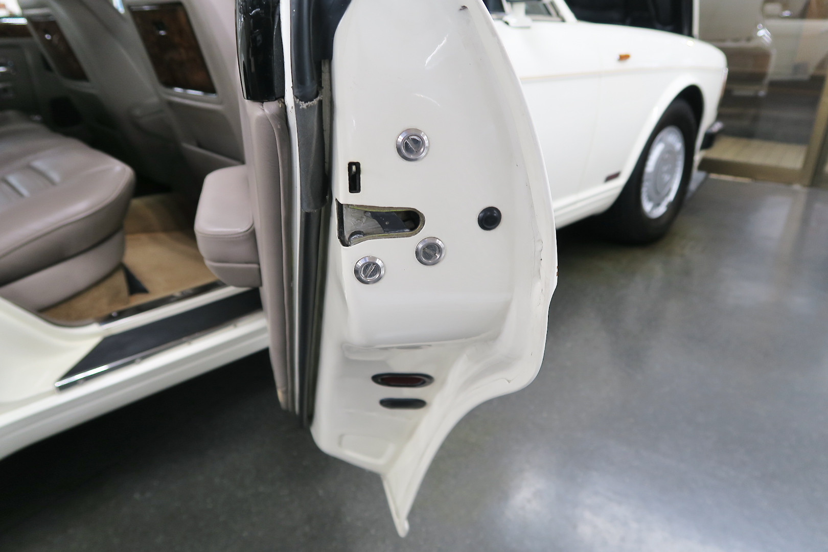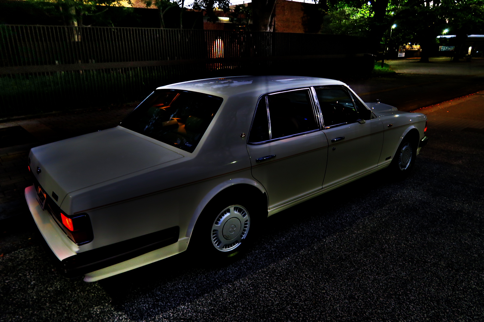 「ベントレー・ターボR」物語 「ロールス・ロイス」と「ベントレー」の生産比率(オーダー数)を逆転させた伝説の ホームラン王「ターボR」。 1965年から1980年の間に生産された「ロールス・ロイス」の4ドア・サルーン 「シャドウ」の生産台数は、「30.057台」、これに対し、ベントレーの4ドア・サルー ン、「T」は、その10分の1にも満たない、僅かに「2.289台」であった。 もはや、誰もが、ベントレーブランド自体を忘れそうになっていた。 おそらく、日本でも「ターボR」発売以前に「ベントレー」というブランドをよく知っ ていたのは、一部のエンスーな方だけであったろう。 この生産比率を逆転させる奇跡の原動力となったのが「ターボR」。 只者ではない。 ターボRの原点は、1982年に発表された「ミルザンヌ・ターボ」から始まる。 82年から85年の間に生産された、このモデルは、キャブ車のターボで、正直、 よろしくない。 トータル 516台生産されたらしいが、今となっては、当社も扱わない。 85年からは、名称を「ベントレー・ターボ」とし、インジェクション式のターボ付き となるが、本当の快進撃が始まるのは、1989年式モデルから、、 この年、エンブレムが「TURBO」から「TURBO R」に、、 外装を大型エアロパーツで武装、ヘッドライトが丸め四灯となる。 シートはバケットシート、タイヤは、ロールスの235サイズに対し、255サイズ、サス、 ショック共に「硬め」、最高速度は軽く200kmを超える、、明らかに、ロールスとは 違う、スポーツサルーン、、オーナードライバーズカーであることを強調。 しかも、時は、正にバブル絶頂期! これが 大ホームラン、名門「ベントレー」ブランドを復活してみせた。 1989年、ロールス社は年間生産台数が3000台を超えた(3254台)。 ハンドメイドの超高額モデルとしては大変な台数である。 1990年には、更に大掛かりな改良が行われ、シリーズ2へ進化、これが当車両、、 実際にベントレーがロールスの生産比率を超えたのは、この1990年のことである。 これは、「ベントレーS1」以来、実に45年ぶりの快挙であった。 この年のロールス社の年間生産台数(3274台)は、89年をも上回り、ベントレー 全盛期を迎えることになる。 90年当時のディーラー新車価格は、 ・ベントレーターボR 3100万円(税別) ・ベントレーラーボRL 3400万円(税別) ・R・RスパーU 3050万円(税別) ・R・RスピリットU 2750万円(税別) この価格設定からも、ロールスよりベントレーの方が高級、のイメージができあがる。 89年から91年にかけては、日本もバブル景気の全盛期、多くのベントレーが、正規 ディーラーのみならず、民間業者により並行車として輸入された。 当時は弊社とて、新車の「ターボR」を輸入したものだ。 が、流石に時間が経ってしまった、、近年では、この年式の極上個体のR・R、ベント レーは、ほとんど、見なくなった。 車自体は頑丈なのだが、中古車の流通価格が安くなりすぎて大切に扱われなくなったこ とと、仮に売り物がでても、その多くが、この円安で海外の業者に買われてしまってい ることが最大の原因であろう。 それが証拠に、先ほど、日本最大の掲載台数を誇る「カーセンサー」ネットで、 「ベントレー ターボR」と検索したところ、掲載車は、僅かに「4台」、それも、 内、2台は弊社の在庫車、、日本から消えた?? じゃなくても、今や当社の仕入基準を満たす個体は、ほぼない と言ってもよいほど、 さて、当車両のお話: ディーラー車 右ハンドル(90年モデル・90年8月登録) 当時は、「右H」は、完全にオーダー制で、注文される方も、10人にお一人くらい。 まだまだ「外車は左ハンドル」の時代であった。 当個体、複数オーナーであるが、弊社が、「2009年」に仕入れ、販売させて頂いた 元「シーザー認定号」、オーナー様は、2025年まで、16年間ご所有されていた。 今回は 終活の一環として、久しぶりの再入庫。 走行:「49.900km」 もちろん「実走」。 しかも、保管環境はバツグンで、販売させていただいた時と ほぼ変わりなし。 91年までに「ラッカー塗料」にありがちな「塗装クラック」箇所は、すでにリペア 対策済みで、クラックもなし。 ベース・コンディションは、極めて素晴らしい。 外装は、「アクリル・ホワイト」」 ソリッドのホワイト、真っ白ではなく、少し象牙色っぽい。 のちに「コーニッシュ・ホワイト」として復活した 良き時代のホワイト・カラー。 全長:「528cm」 ショートボディ、本来「RL」だけに付く「CピラーにBバッジ」、 純正フライングBマスコット 純正コーナーポール 当時の外装オプション全部付け 内装は、 「マッシュルーム」コノリーレザー。 オリジナル「コノリー」、ノンリペアで、ここまでキレイに残す。 マッシュルームというカラーを選択された方も極めて稀で、まず みない。 このカラー、汚れも目立たず、好きかな。 ウッドもノンリペアで 艶々っ オプションの「両面ウッド張りピクニック・テーブル」 この右テーブルを開いた箇所(ウッド面)