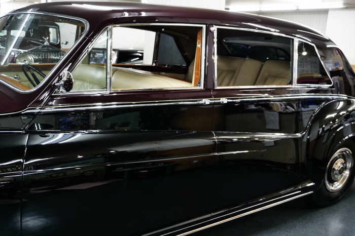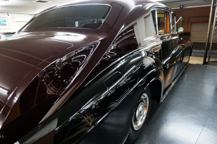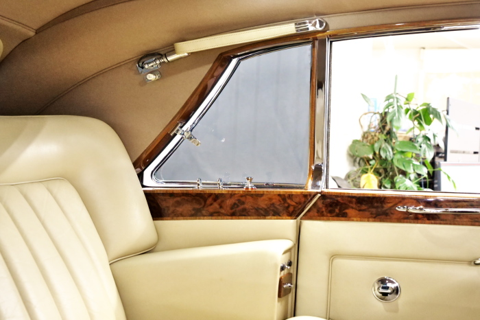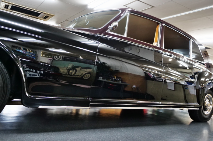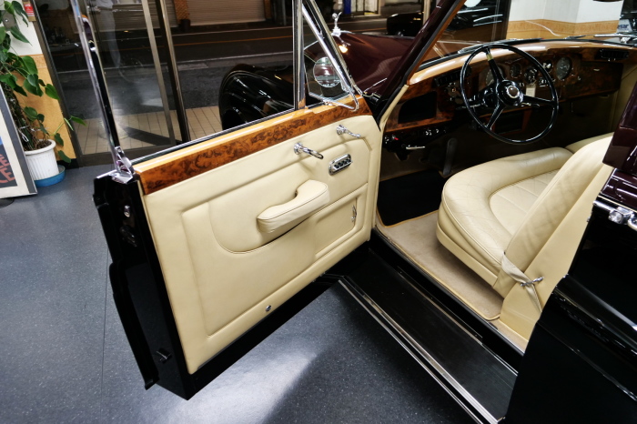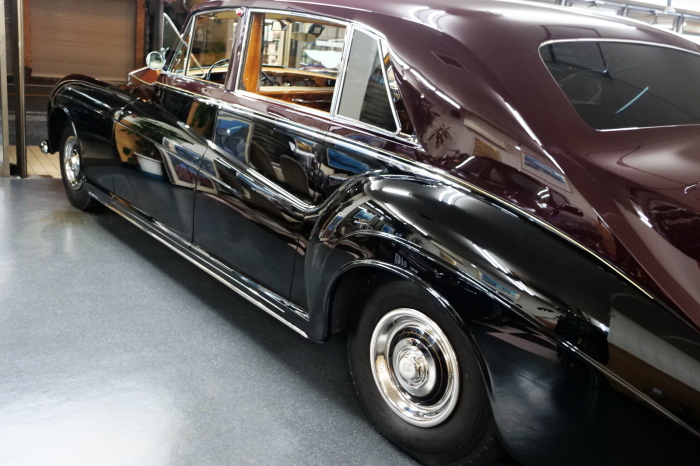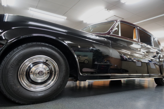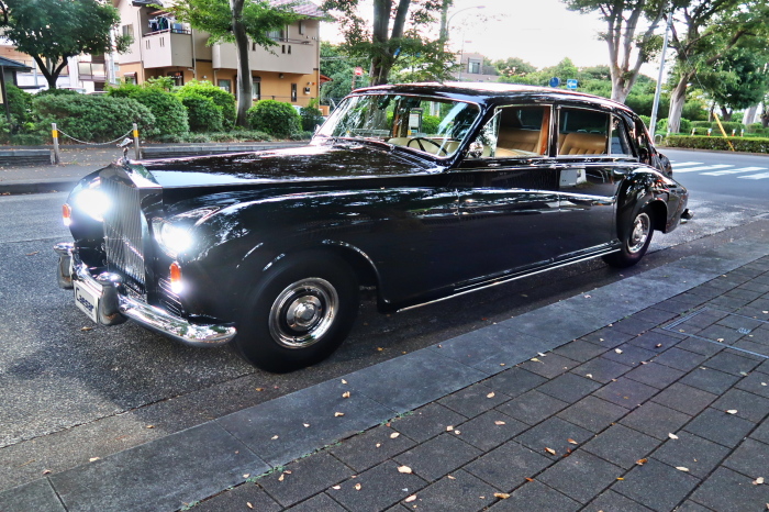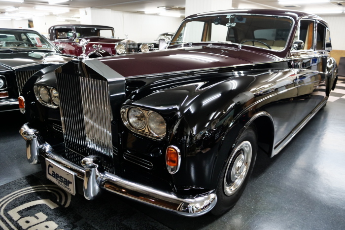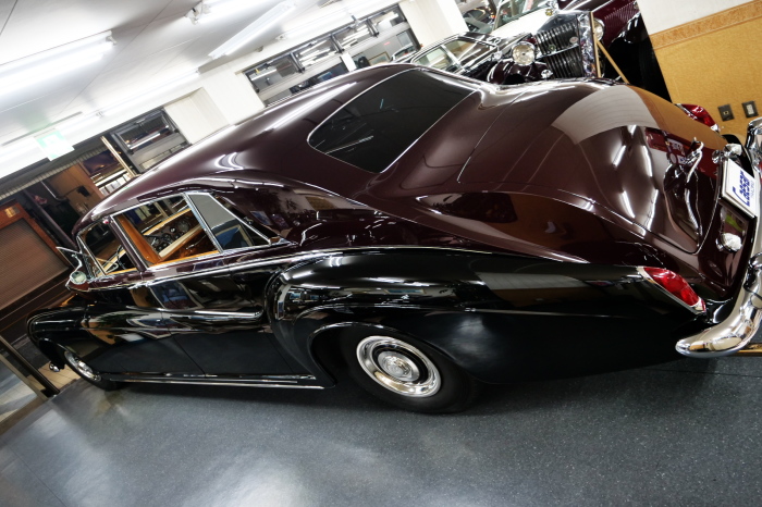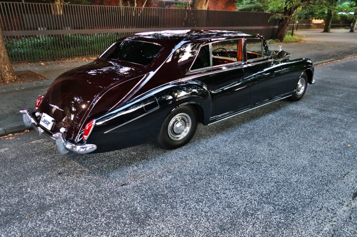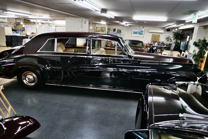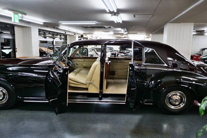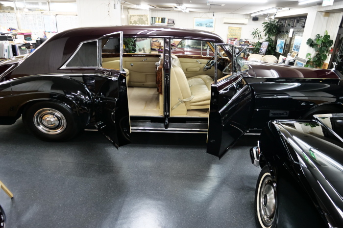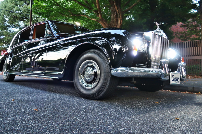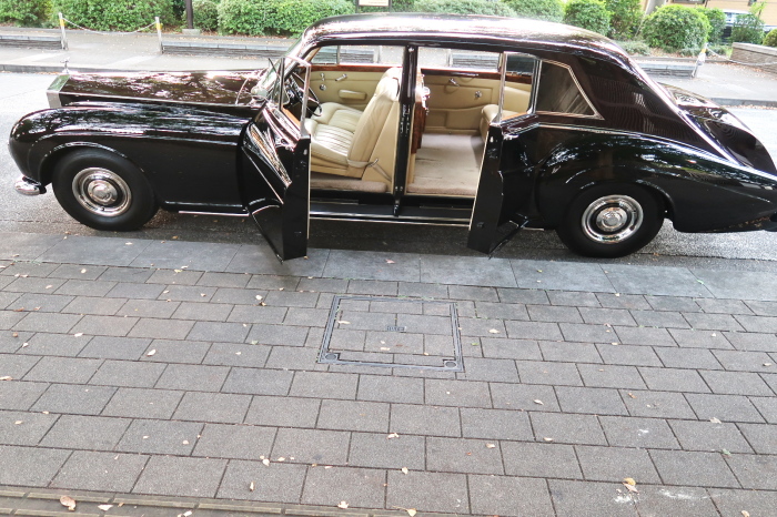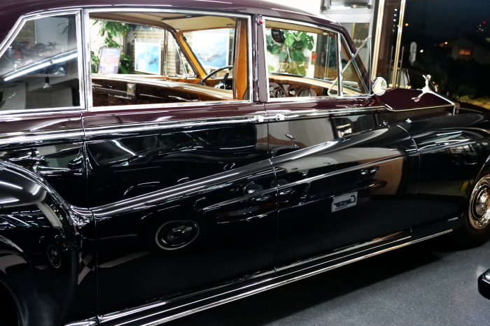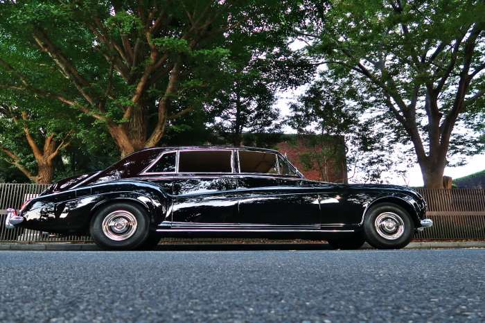 「ジェームス・ヤング」コーチビルドの傑作! 「ファンタム5」の 「PV23」! 解説: 1925年発表の「ファンタム1」から続く、ロールス・ロイス頂点モデル・・ つまりは、世界の自動車の頂点モデルに君臨する「ファンタム」の5代目である。 今回は、ちょいと時代を さかのぼって「ファンタム」自体の歴史から簡単にご解説したい。 1904年創業の「ロールス・ロイス」が最初に、その名を世界に知らしめた傑作モデルが、 1906年に発表した「40/50馬力」である。 直列6気筒・7036cc(後に7428ccに)、「ロイス」設計の自信作、、 このモデルの優れた性能をアピールするため、翌 1907年、「ロンドン〜グラスゴー間 ノンストップ・ラン」に挑戦する。 それまでの記録は、シドレーという車の「11.272km」 「40/50」は大人4人を乗せ昼夜を問わずノン・ストップ(給油を除き)で走り、、 叩き出した記録は、、「23.315km」! ノンストップで東京・福岡間を 12往復くらい、、今でも凄い、 しかも、走行直後の検査(機関を元の正常状態に戻すのに、いくらのパーツ代が必要か?) の結果、パーツ費用は、僅かに「2ポンド2シリング」にすぎなかった。 この驚異的な記録は、当時の人々を驚愕させると共に、ロールス・ロイスの ずば抜けた性能 を世に知らしめる。 この段階で、すでにロールス社は世界一の自動車メーカーと賞賛されている。 この記録を出した「40/50」は、シルバーにオールペイントされ、音もなく走行することか ら「シルバーゴースト」のプレートが張られていた。 この後、「40/50」は、「シルバーゴースト」のモデル名で販売されることとなる。 「シルバーゴースト」は、永きに渡って生産されたが、1925年、改良ともに新型モデル となる。 モデル名「ファンタム」! 中身は事実上のゴーストであったが、ここから「ファンタム」の神話が始まる 伝説の頂点モデル「シルバーゴースト」の正当な後継モデルが「ファンタム」なのだ。 ・1929年には、更なる改良が施され「ファンタム2」に (直列6気筒OHV/7668cc) ・1936年には、ついに飛行機のエンジンと形容された(実際には違うが) 12気筒・7340ccエンジンを積み「ファンタム3」に、 1939年、第2次世界大戦の始まりで一旦「ファンタム」の歴史は途絶える 第2次大戦後、ロールス社が本社「クルー」工場で再開、生産・販売を始めたのは、 1946年からのことである。 当初、ベントレー「マーク6」とロールス「シルバーレイス」の販売でスタートしていた ものの、ロールス社としては、戦前の「格」を取り戻すため、頂点モデル「ファンタム」 をも復活させる必要があった。 そこで、1950年に登場したのが「ファンタム4」であるが、このモデル (直8気筒エンジンを積む)は、王族、皇族にしか販売されず、1950年から56年の間 に、僅か「18台」しか生産・販売されていない。 詳しくは割愛させて頂くが、要は「ファンタム」と名の付くモデルは、 「そういう車」ってこと、、。 「格」を取り戻したロールス社が次ぎに発表した「ファンタム」が、 アルミ合金製・新型V8エンジンを積む、ファンタム5。 では、ここから、やっと、、 「ファンタム5」物語 登場は、1958年、実際のデリバリーは、1959年から、 同じエンジンを積む、クラウド2(ベントレーS2)と同時に発表された。 「ファンタム5」のシャーシは、「クラウド」をベースに延長・補強されたもので、 そのメイン・シャーシは、10tトラックのごとし、、。 新設計アルミ合金製 V8 OHV 6230cc ミッションは、GM製を改良し、ロールス社自身で作られた「4速コラムAT」 ロールス社というのは、飛行機のエンジンをも作れる研磨に特出した技術を持つわけだから、 エンジンもミッションも尋常じゃない耐久性を誇る。 ブレーキは、全輪ドラム式ながら、「イスパノ・スイザ社」の特許「メカニカル・サーボ・ ブレーキ」により、効き は、現在の交通事情の中でも、まったく問題ない。 正確には、、 バブル期くらいまでは、このブレーキ・システムは怖かった、 当時、このシステムを完璧に理解し、整備できるメカニックが、ほとんど日本にいなかった からだ。 現在でも少ないが、弊社のメカニックなら、 楽勝、正しい整備(オーバーホールなど)を施せば、これほど信頼性の高いブレーキもない。 普通に効く。 ロールス社も、信頼して採用したようで、当時の インタビュー記事: 記者:「どうして、ディスク・ブレーキを 採用しないのですか?」 RR:「メカニカル・サーボ・ブレーキより、優れたディスク・ブレーキが あるなら採用してますが」 「ファンタム5」は、前期型と後期型があり、1959年〜1962年までは、「クラウド2」ベース 後期型は、1962年〜1968年までは、「クラウド3」ベースである。 圧縮比が違うなど、若干の機関的違いがあり、後期型のが好ましい。 *ロールス社では、もっと細かくシリーズ分けしていて、全9シリーズ、、 これは、覚える必要はない。 「ファンタム」のボディはロールス社の自社製(スタンダード・モデル)ではなく、 全て、社外の「