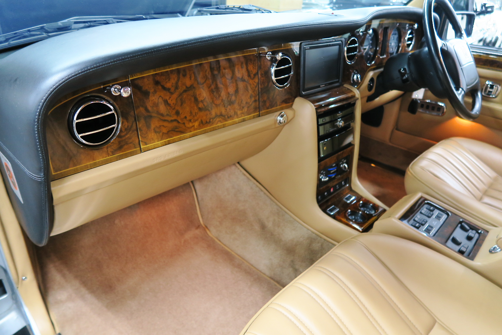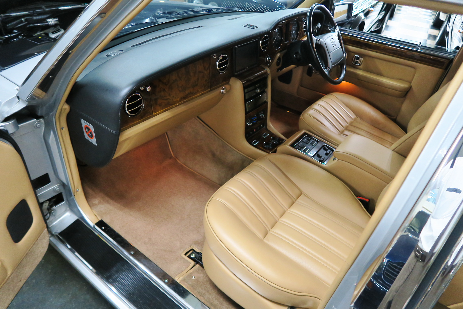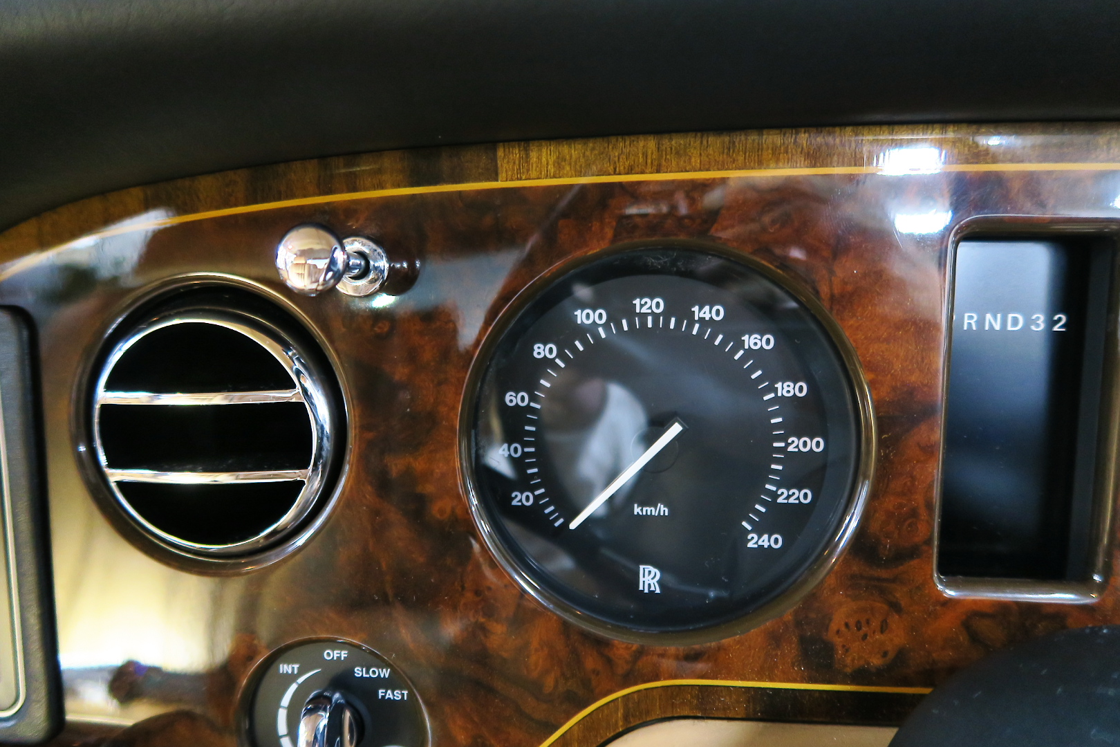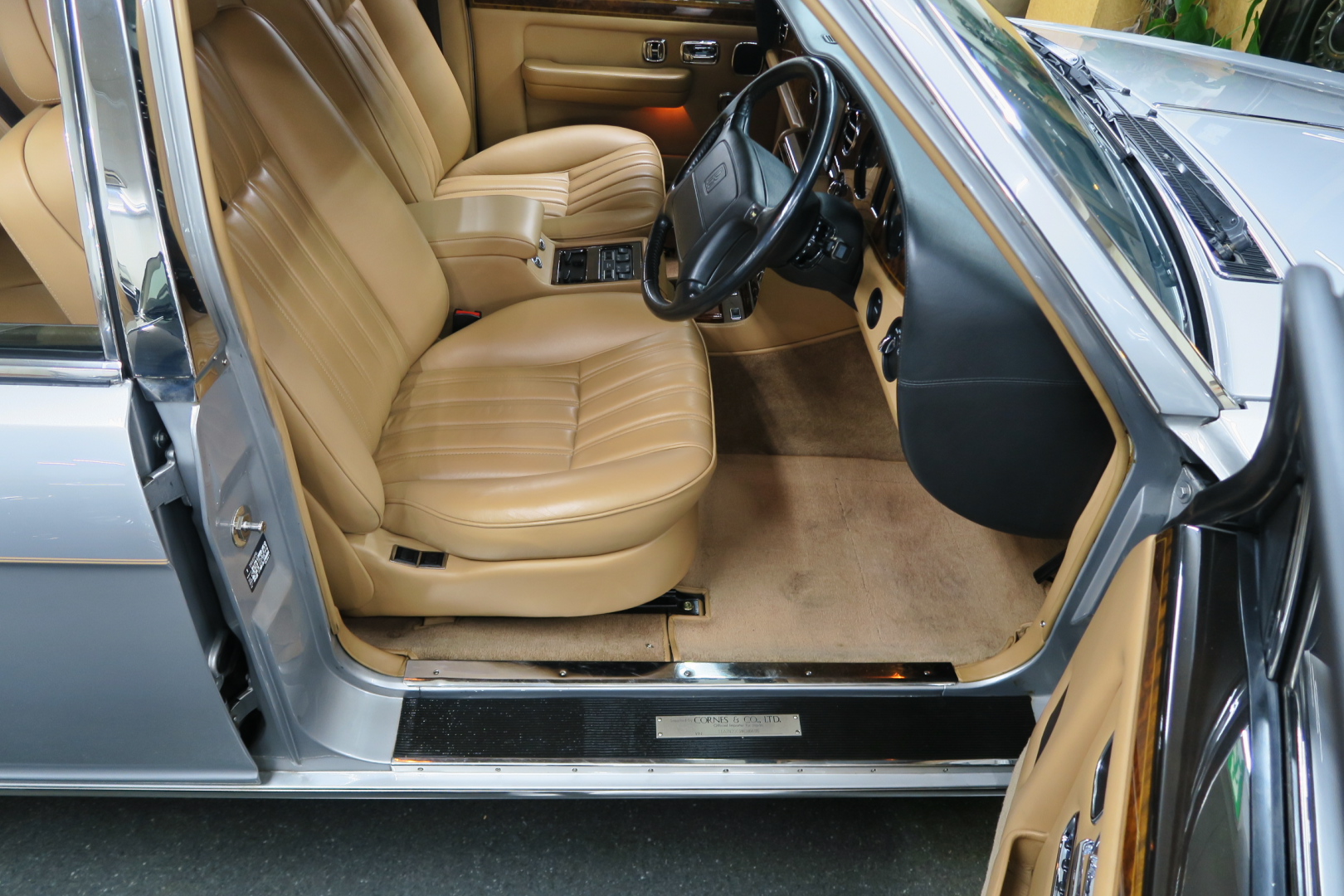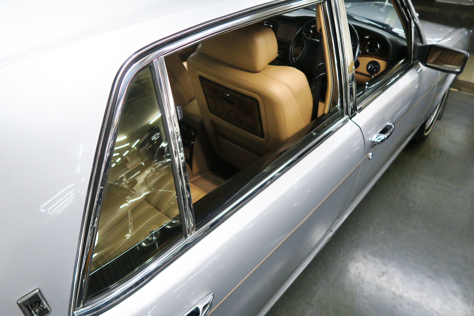 外装は、「シルバー・パール」。 当時の新色、薄い色目のシルバーメタリック パールって名がつくカラーであるから、塗料に「パールマイカ」が含まれていて、確かに、パールっぽい 輝きをみせる。 塗装コンディションも申し分なし。バリビカっ。 ボディサイドには、内装カラーに合わせた タン系色のコーチラインが2本入ってる。 SZ系ロールスに コーチラインは、つきものだ。 98年モデルだけの外見上の特徴は、 *前後バンパーが、ボディ同色塗装 *トランクのエンブレムが、「ブルー」カラー 一目で「98’ ファイナル」と分かる。 全長:541cm、、ロングホイール・ベース。 98年時には、ターボ無しモデルの「シルバードーン」も存在したが、98’「ドーン」は、世界で「11台」 しか売れていない。 大半の方が、「ターボ付き」を選択したようだ。 リアのドアが10cm短い「スピリット」は、97年時コーンズのカタログから消え、特別オーダー受付のみ の扱いとなる。 「ターボ付き」は、特注しない限り、「スピリット」には設定がなかった。 この特注をオーダーした人は、世界に6人しかいない。 「スピリット」は、97年モデル(6台)が、最終モデルとなった。 ロングホイールと聞くと、長いと思われる方も多かろうが、やたらハンドルが切れるので、 驚くほど取り廻しが良い。 メルセデスのSクラスが入れる道なら、困らず ついていけるはず。 96年時の大幅改良は、初めて、ボディにまで及び、 ・フロント廻りのボディプレス(左右フェンダー形状など)、 ・前後のバンパー・一体式エアロスポイラー、 ・ミラーがボディと一体式に、 ・グリルの縦横比(縦が少し短くなった)、 ・アルミホイール(16インチ)デザイン、 ・マドガラス枠サッシにウェザーストリップが、、 などが変更に、 これは、全て 空力を計算した上での結果で、高速走行時の風切り音は、明らかに激減した。 ベントレーのモデルについては戦前から「空力」を考えたボディ作りがなされてきたが、こと ロールスの モデルでは、この96年モデルで初めて考えてみたのではなかろうか?? 95年以前モデルを上記改良がなされた96’以降モデル仕様に後から改造するには莫大な費用を要す、、 一般的には不可能である。 SZ系までのモデルは、スタンダード・サルーンでも、開閉部(ボンネット・トランク・ドア4枚・給油口 )は全て「アルミ」製、 戦後モデルの伝統であったが、、この後のモデル(セラフ・アルナージ)から総スチィール・ボディとなる。 コスト・ダウンは、まず、見えない箇所から 行われるのだ。 |