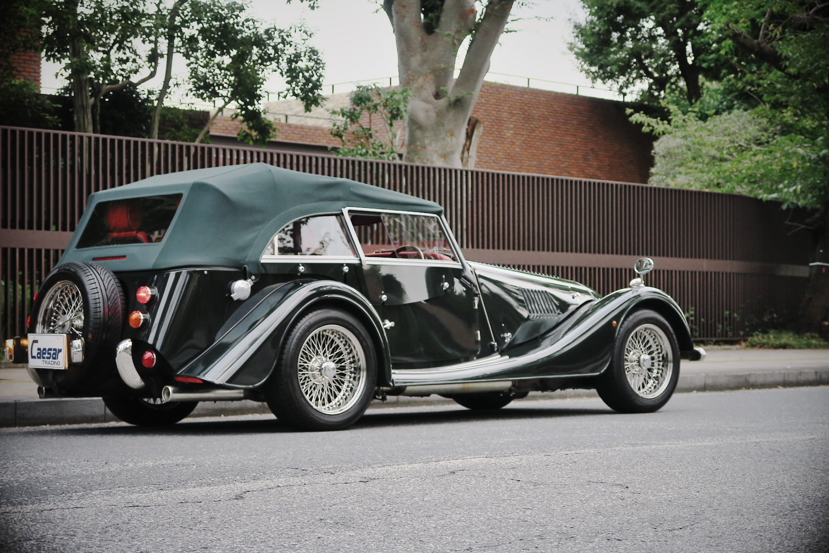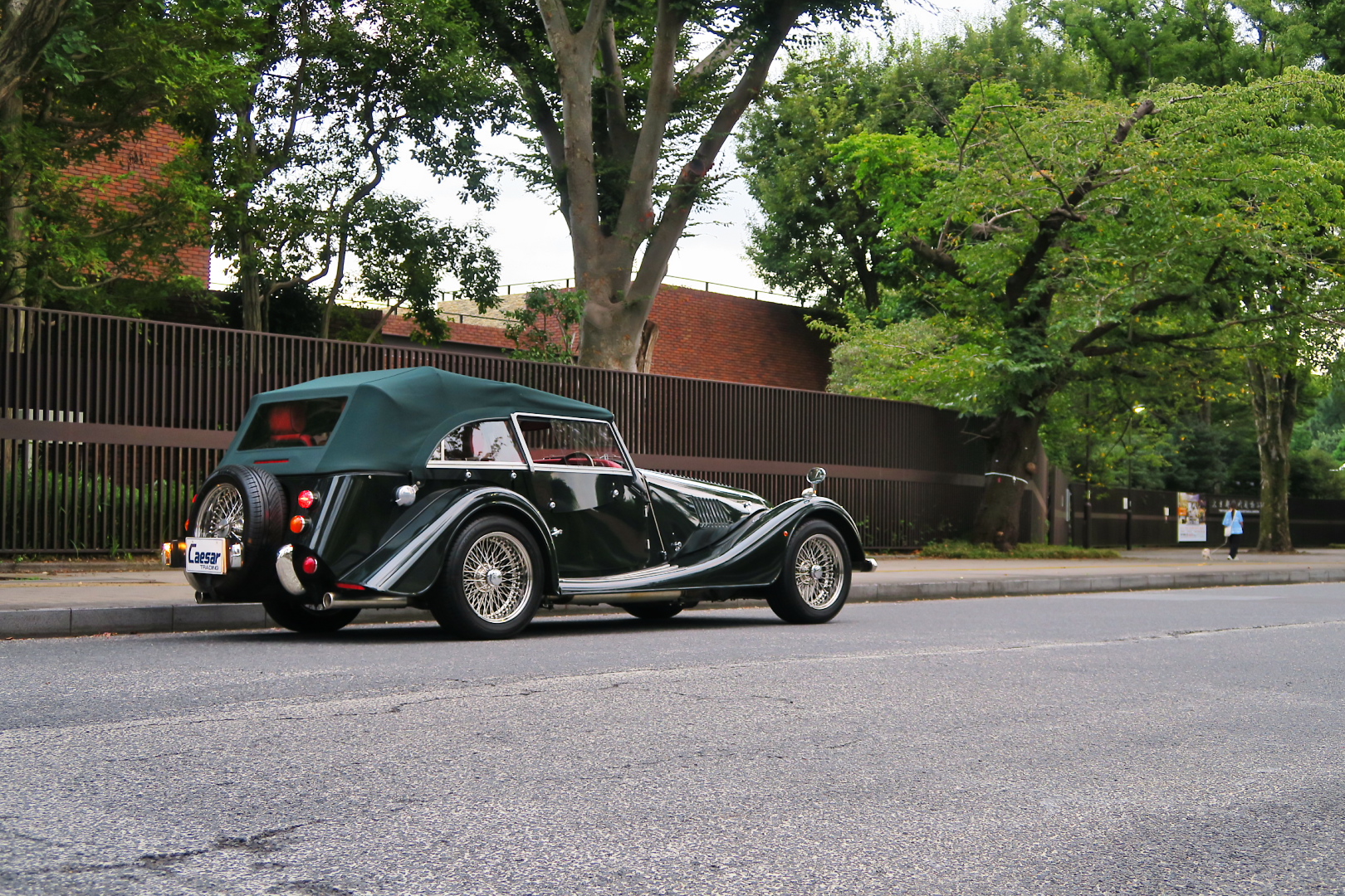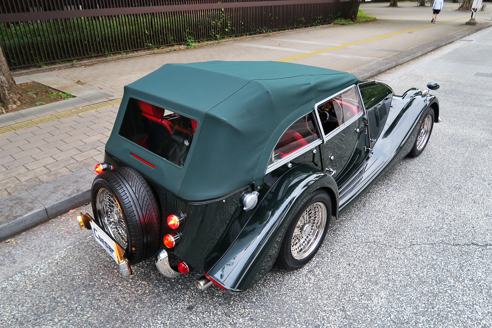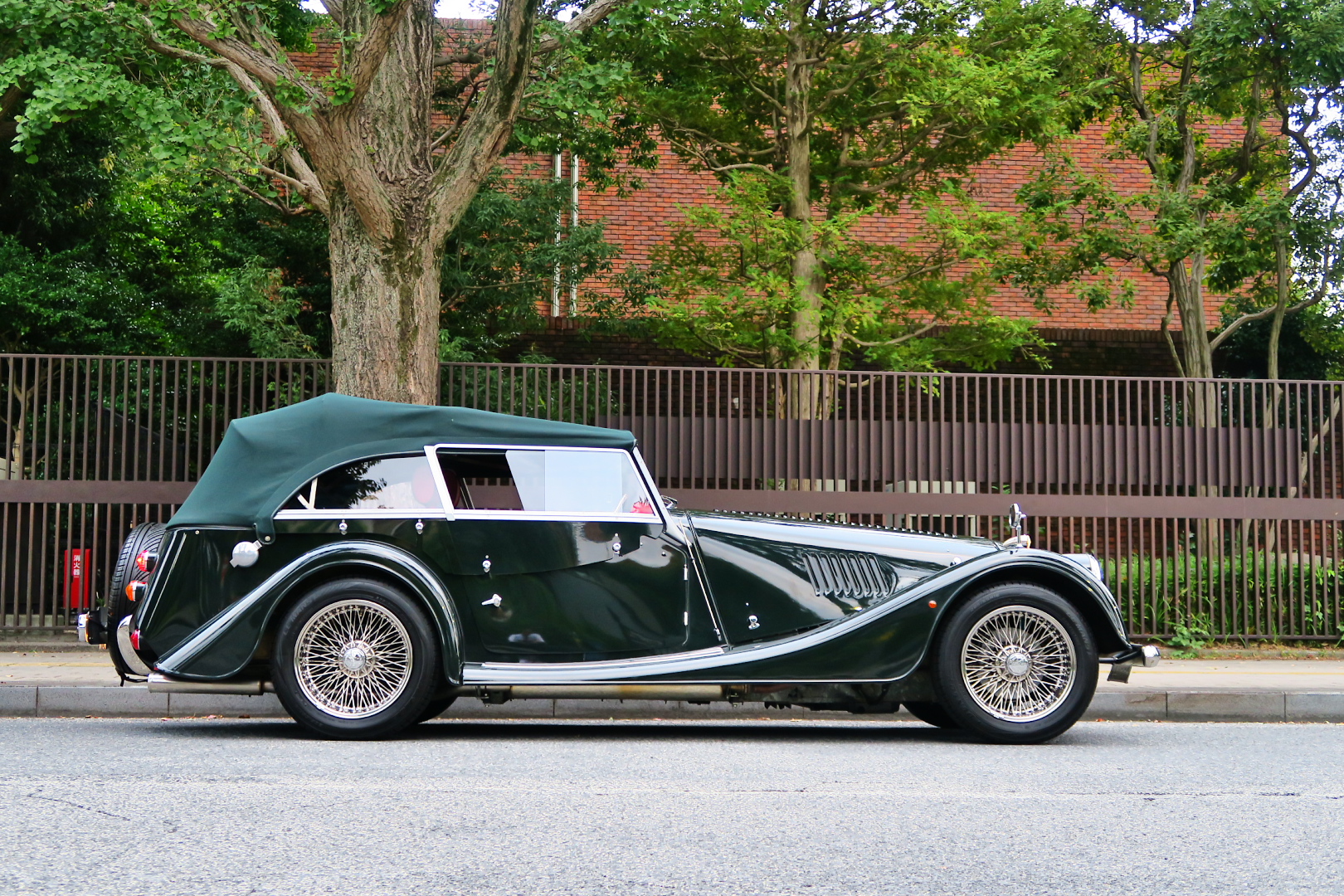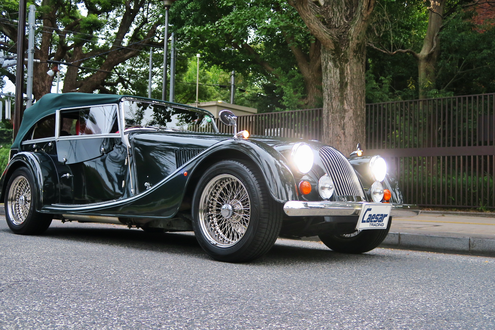 モーガン「ロードスター」! 2004年から登場した新型モデル「ロードスター」。 「プラス4」と「プラス8」の中間に位置するモデルである。 1930年代のクラシック・カーを現在でも生産しつづけている世界で唯一の自動車メーカー ・・「モーガン」。 この車に乗る前に、その歴史を簡単に、ご紹介しておきたい。 イギリスは、ウースター州マルヴァーン・リンクという小さな街にあるレンガ作りの古風な 工場・・「モーガン・モーター・カンパニー」の誕生は、100年以上も前にさかのぼる。 1907年に初代「モーガン」氏が、自身のために1台の3輪自動車(スリーホイラー) を作ったことから始まる。 1910年のモーターショーに出品されたオートバイ・エンジンを積む、フロント2輪、 リア1輪のスリーホイラーは、税金面での優遇性と驚くほどの加速性能で、人気を得る。 瞬く間に多数のオーダーが入り、1912年には、正式に「モーガン・モーター・カンパニー 」を設立することになる。 顧客の好みに応じ、当時人気のオートバイエンジンを積んだスリーホイラーは、2人乗りから 4人乗りまで、数年ごとに数々のバリエーションが発表され、会社の基盤を作る。 そして、 市場の要求という時代の波に乗り1936年秋、満を持して4輪自動車を発表する。 モデル名:モーガン「4/4」・・・モーガン4輪ファーストモデルである。 4気筒の4輪車という意味の4/4という名称で、「Four・Four」と発音したほうが よい。 Z型スチール製のラダーフレームに叩き出しのスチール・パネル(アルミ製も有る)を ボディに貼り付ける・・といった製作方法は、全モデル共通で、それは当モデルでも変わって いない。 よく、「木骨フレーム」の・・なんて書かれていることがあるが、本当の意味でのフレーム は、上記の通り、頑丈なスチール製であり、あくまでも、ボディの一部、例えば、ドア枠、 リアホイールアーチ、ダッシュボードを留めるための土台などの造作内部に木材が使われて いるにすぎない。 使われている木材は、「アッシュ材」と「松」。 これも、英国流の基本のまま、、。 戦前のイギリス車の大半は、ロールス・ベントレーも含めて見えない部分には木材が使われ ていたが、現在に、その技法を残すのは、世界広しといえど、モーガンだけだ。 「4/4」は、その後、数年おきにエンジンが、新しいものに変更され、1963年には 「シリーズ5」まで進む。 国内に正規輸入されるようになったのは、このモデルからではなかろうか? この「シリーズ5」は、1968年まで生産されるが、、正直、こんな古い時代の正規 輸入物モーガンは、国内に、ほとんど存在しない・・・ なにせ、正規で輸入されたモーガンは、当時のディーラーにより(1966年から1967年 にかけて輸入元:セール・チルニー・ジャパン)、4台しか輸入されていないという。 1968年からは、「モーガン・オート・タカノ」さんが正規ディーラーとなり、2005年 10月には、「モーガン・オート・イワセ」さんが後継となり、近年まで続けていた。 モーガンは、「4/4」モデル、1L代の排気量の非力感を補うため1950年 2.1Lの直4エンジンを積む「プラス4」を発表する。 「4/4」のハイパワーバージョンであるが、その後、 1968年、さらに V型8気筒を積む「プラス8」を追加。 そうして モーガンは、しばらくの間(2004年まで) 「4/4」、「プラス4」、「プラス8」の3つのラインナップを揃えていた。 ところが、2004年 「プラス8」に替わり、久方振りに新型モデルが登場する。 FORDのV型6気筒3Lを積む「ロードスター」 それが、当個体である。 前述の通り、戦前と変わらぬハンドメイド ボディは、総アルミで、「プラス8」と同じくワイド・ボディ。 全幅は、169cmもあり、全高は、僅かに122cm(当・4シーターは、137cm) 広くて低い。 見た目は、あくまでクラシックカー ただし、中身は、 最新のFORD製「モンデオ」などに積まれ好評価を受けた「V6」である。 4ドア・サルーンのモンデオでさえ、その走りの良さを称えられたほどのエンジンである から、それを 車輌重量 1トンほどのクルマに積んでしまえば、、ご想像の通り 236馬力! 0−99kmを5.0秒、 最高速は、200kmをゆうに超える。 ギアBOXも信頼のFORD製で、その5速MTは、お約束どおり、ショート・ストローク、 実に小気味良い。 ハンドル操作にパワステはないが、それに気が付かないほど取り回しがよい。 パワーに見合うブレーキも抜かりなし、 リアは、相変らずのドラム式ながら、フロントは、「ロッキード」製のディスク・ブレーキ 大径ローターで、効きも最新鋭。 その後のMORGAN社は、いつのまにか、また「プラス8」を復活させ、 「4/4」、「プラス4」、「ロードスター」、「プラス8」、「エアロ8」と いう5つのモデルを持つ時代もあった(今は、プラス4とプラス6のみ) あえて、「ロードスター」を褒めるなら、「4/4」と「プラス4」は非力、 「プラス8」は、直線道路仕様のドラッグスター = アメリカ向けモデル。 =「ロードスター」は日本で乗るベスト・モデル。 ご存