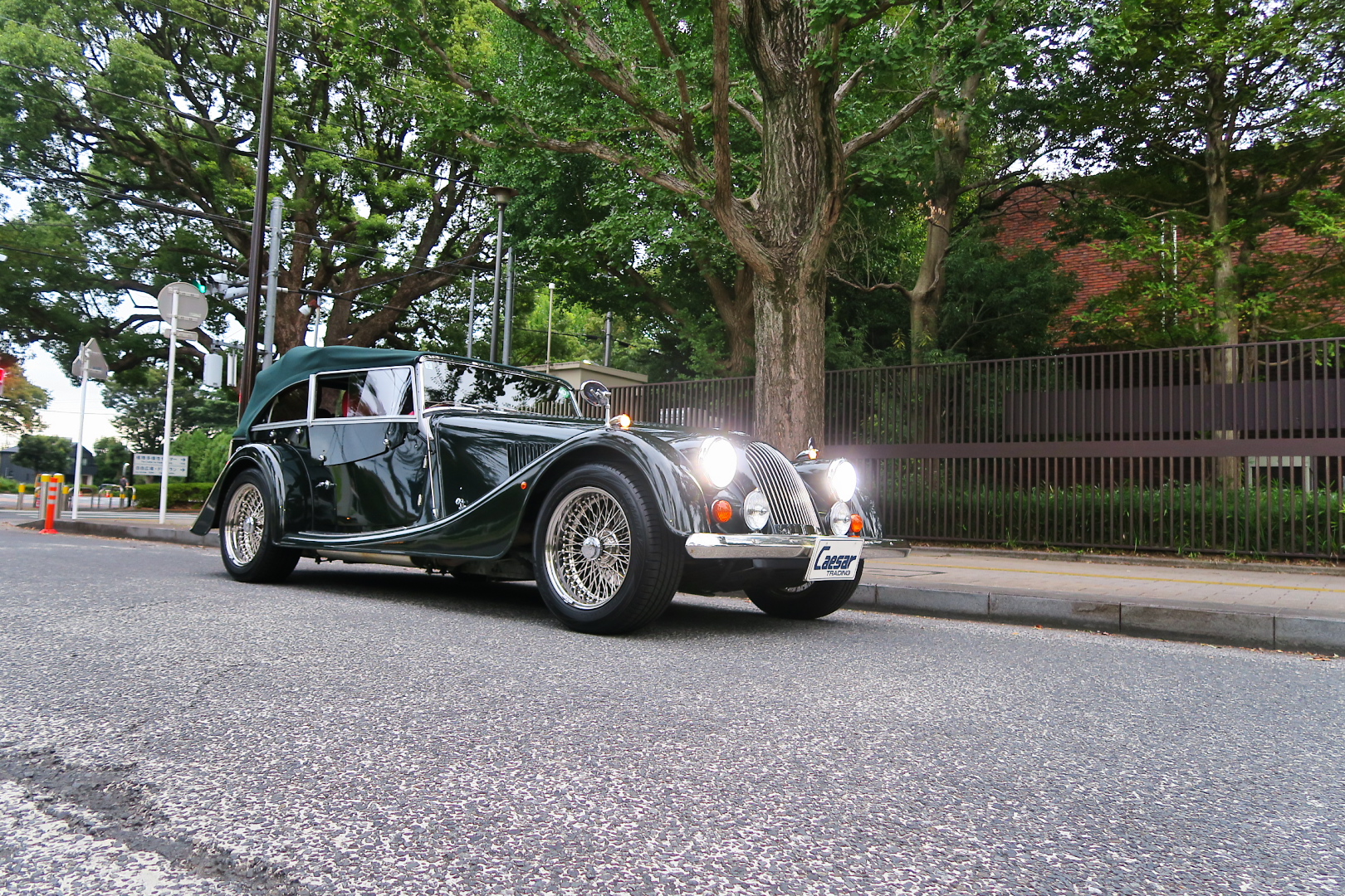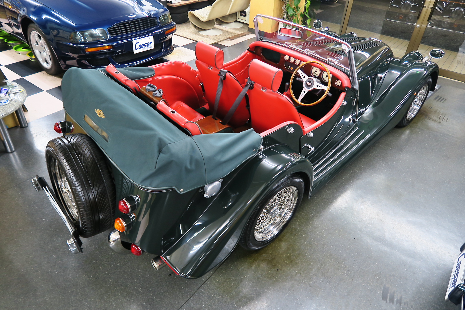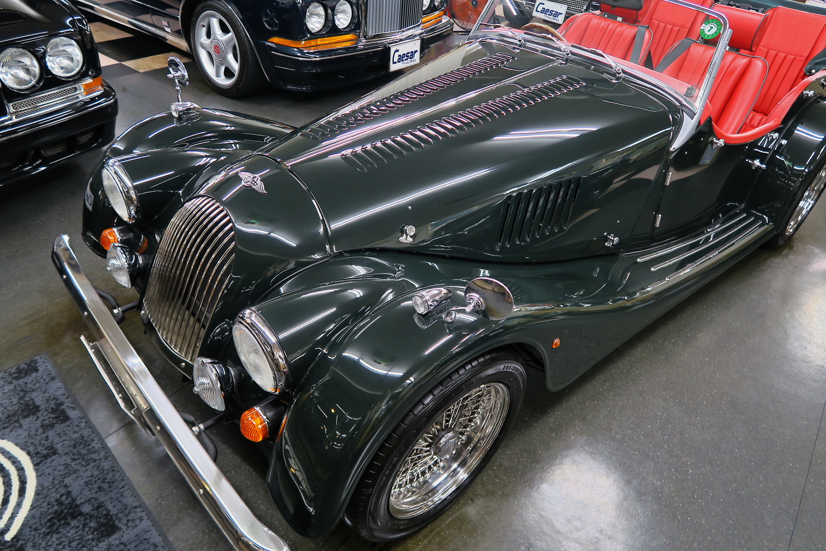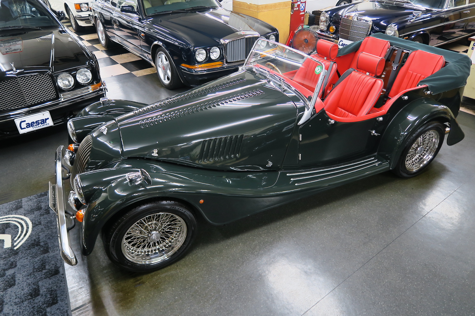 モーガン「ロードスター」! 2004年から登場した新型モデル「ロードスター」。 「プラス4」と「プラス8」の中間に位置するモデルである。 1930年代のクラシック・カーを現在でも生産しつづけている世界で唯一の自動車メーカー ・・「モーガン」。 この車に乗る前に、その歴史を簡単に、ご紹介しておきたい。 イギリスは、ウースター州マルヴァーン・リンクという小さな街にあるレンガ作りの古風な 工場・・「モーガン・モーター・カンパニー」の誕生は、100年以上も前にさかのぼる。 1907年に初代「モーガン」氏が、自身のために1台の3輪自動車(スリーホイラー) を作ったことから始まる。 1910年のモーターショーに出品されたオートバイ・エンジンを積む、フロント2輪、 リア1輪のスリーホイラーは、税金面での優遇性と驚くほどの加速性能で、人気を得る。 瞬く間に多数のオーダーが入り、1912年には、正式に「モーガン・モーター・カンパニー 」を設立することになる。 顧客の好みに応じ、当時人気のオートバイエンジンを積んだスリーホイラーは、2人乗りから 4人乗りまで、数年ごとに数々のバリエーションが発表され、会社の基盤を作る。 そして、 市場の要求という時代の波に乗り1936年秋、満を持して4輪自動車を発表する。 モデル名:モーガン「4/4」・・・モーガン4輪ファーストモデルである。 4気筒の4輪車という意味の4/4という名称で、「Four・Four」と発音したほうが よい。 Z型スチール製のラダーフレームに叩き出しのスチール・パネル(アルミ製も有る)を ボディに貼り付ける・・といった製作方法は、全モデル共通で、それは当モデルでも変わって いない。 よく、「木骨フレーム」の・・なんて書かれていることがあるが、本当の意味でのフレーム は、上記の通り、頑丈なスチール製であり、あくまでも、ボディの一部、例えば、ドア枠、 リアホイールアーチ、ダッシュボードを留めるための土台などの造作内部に木材が使われて いるにすぎない。 使われている木材は、「アッシュ材」と「松」。 これも、英国流の基本のまま、、。 戦前のイギリス車の大半は、ロールス・ベントレーも含めて見えない部分には木材が使われ ていたが、現在に、その技法を残すのは、世界広しといえど、モーガンだけだ。 「4/4」は、その後、数年おきにエンジンが、新しいものに変更され、1963年には 「シリーズ5」まで進む。 国内に正規輸入されるようになったのは、このモデルからではなかろうか? この「シリーズ5」は、1968年まで生産されるが、、正直、こんな古い時代の正規 輸入物モーガンは、国内に、ほとんど存在しない・・・ なにせ、正規で輸入されたモーガンは、当時のディーラーにより(1966年から1967年 にかけて輸入元:セール・チルニー・ジャパン)、4台しか輸入されていないという。 1968年からは、「モーガン・オート・タカノ」さんが正規ディーラーとなり、2005年 10月には、「モーガン・オート・イワセ」さんが後継となり、近年まで続けていた。 モーガンは、「4/4」モデル、1L代の排気量の非力感を補うため1950年 2.1Lの直4エンジンを積む「プラス4」を発表する。 「4/4」のハイパワーバージョンであるが、その後、 1968年、さらに V型8気筒を積む「プラス8」を追加。 そうして モーガンは、しばらくの間(2004年まで) 「4/4」、「プラス4」、「プラス8」の3つのラインナップを揃えていた。 ところが、2004年 「プラス8」に替わり、久方振りに新型モデルが登場する。 FORDのV型6気筒3Lを積む「ロードスター」 それが、当個体である。 前述の通り、戦前と変わらぬハンドメイド ボディは、総アルミで、「プラス8」と同じくワイド・ボディ。 全幅は、169cmもあり、全高は、僅かに122cm(当・4シーターは、137cm) 広くて低い。 見た目は、あくまでクラシックカー ただし、中身は、 最新のFORD製「モンデオ」などに積まれ好評価を受けた「V6」である。 4ドア・サルーンのモンデオでさえ、その走りの良さを称えられたほどのエンジンである から、それを 車輌重量 1トンほどのクルマに積んでしまえば、、ご想像の通り 236馬力! 0−99kmを5.0秒、 最高速は、200kmをゆうに超える。 ギアBOXも信頼のFORD製で、その5速MTは、お約束どおり、ショート・ストローク、 実に小気味良い。 ハンドル操作にパワステはないが、それに気が付かないほど取り回しがよい。 パワーに見合うブレーキも抜かりなし、 リアは、相変らずのドラム式ながら、フロントは、「ロッキード」製のディスク・ブレーキ 大径ローターで、効きも最新鋭。 その後のMORGAN社は、いつのまにか、また「プラス8」を復活させ、 「4/4」、「プラス4」、「ロードスター」、「プラス8」、「エアロ8」と いう5つのモデルを持つ時代もあった(今は、プラス4とプラス6のみ) あえて、「ロードスター」を褒めるなら、「4/4」と「プラス4」は非力、 「プラス8」は、直線道路仕様のドラッグスター = アメリカ向けモデル。 =「ロードスター」は日本で乗るベスト・モデル。 ご存