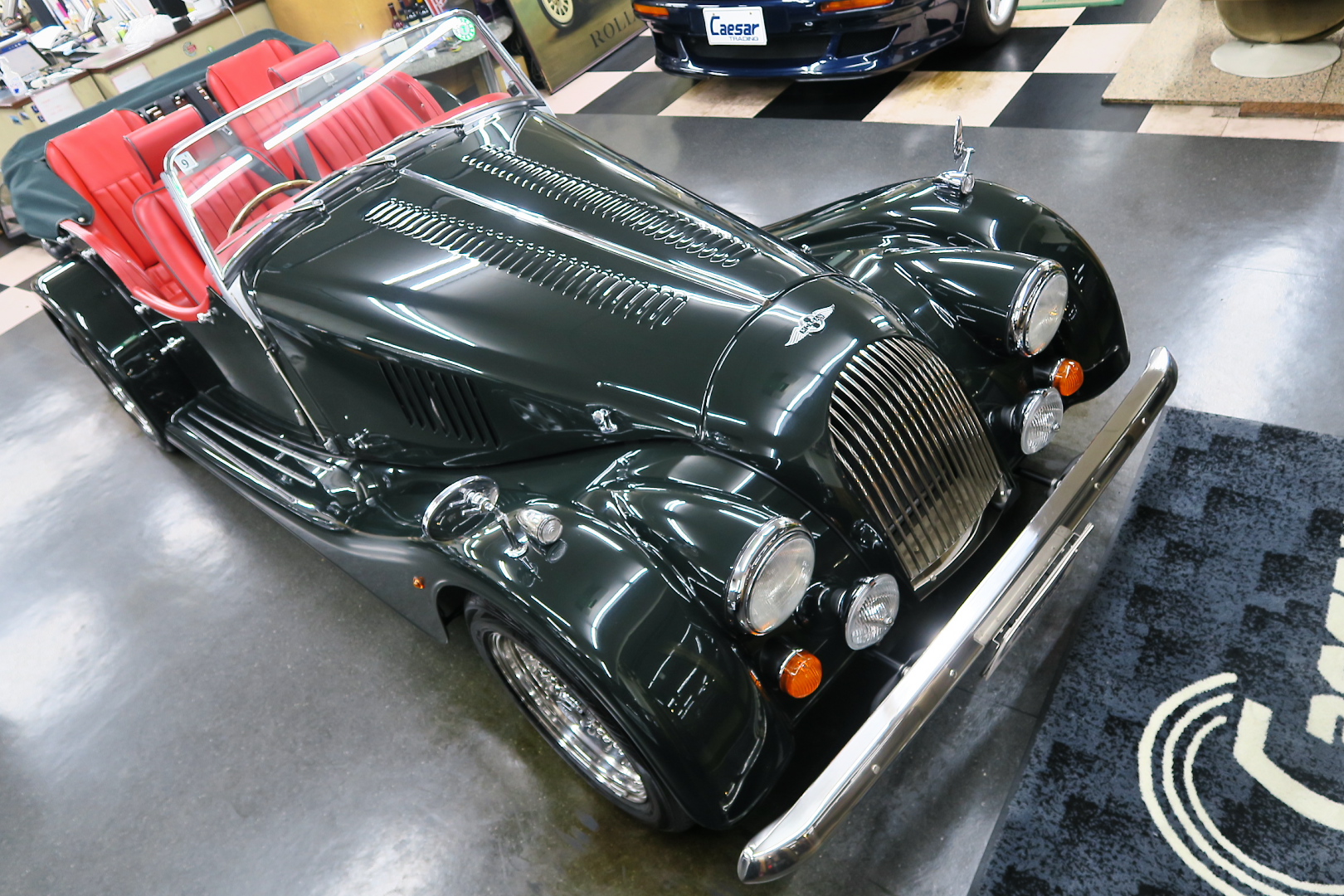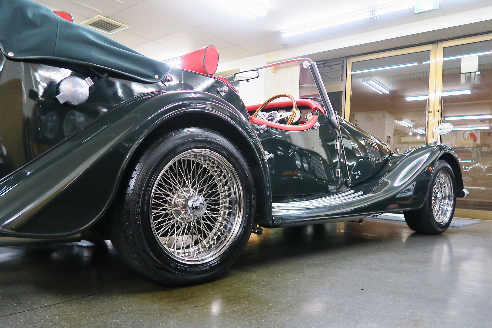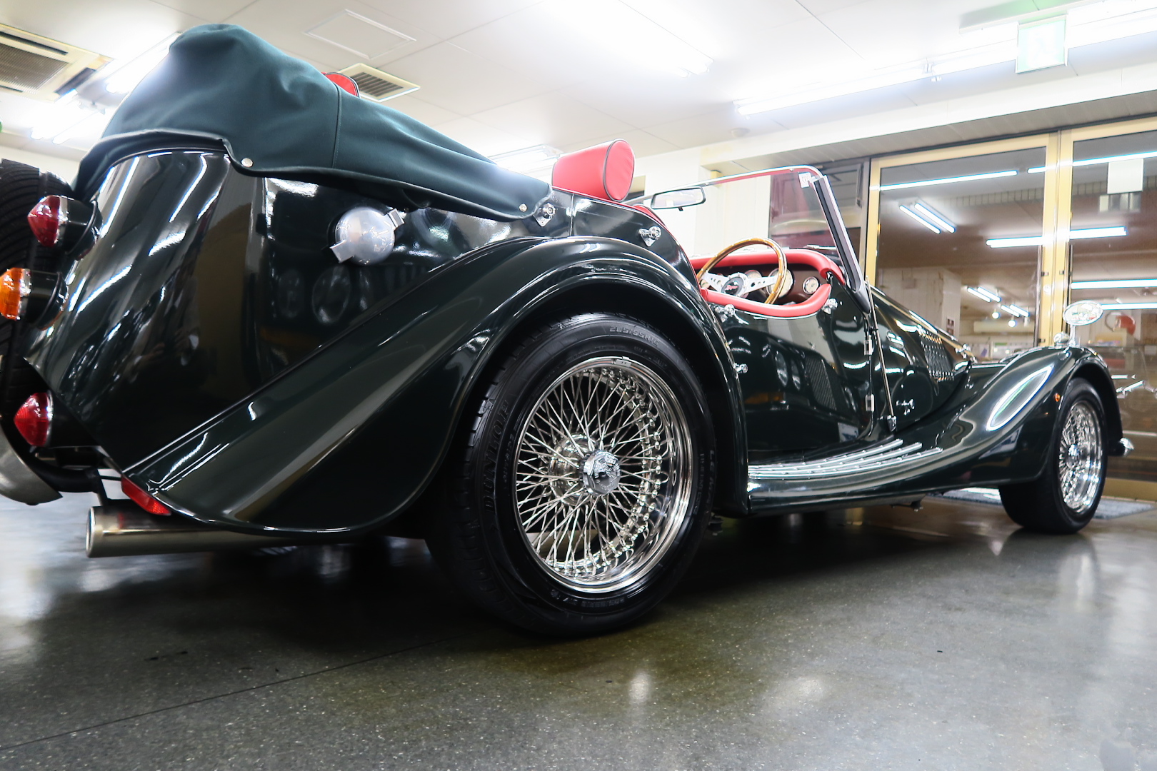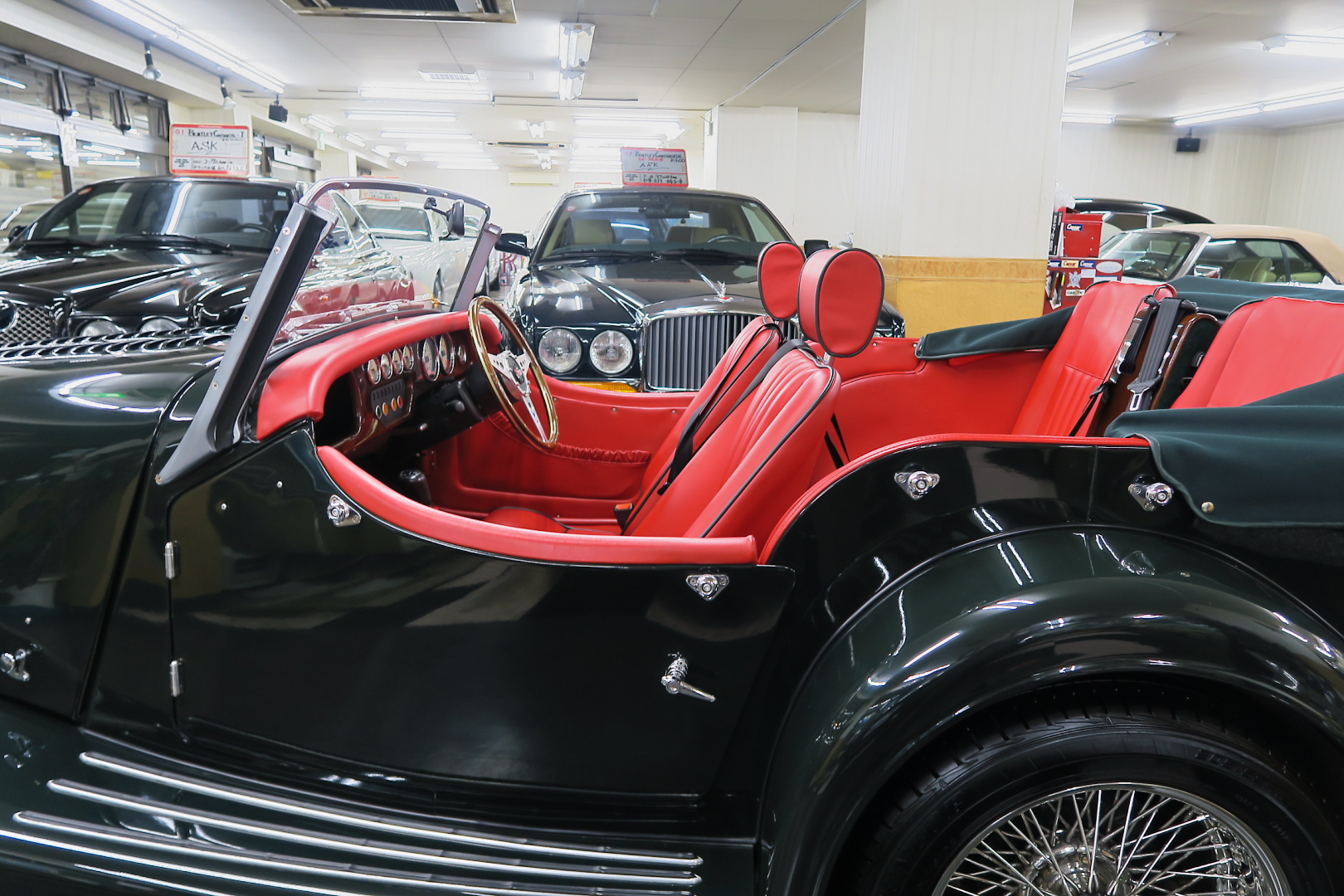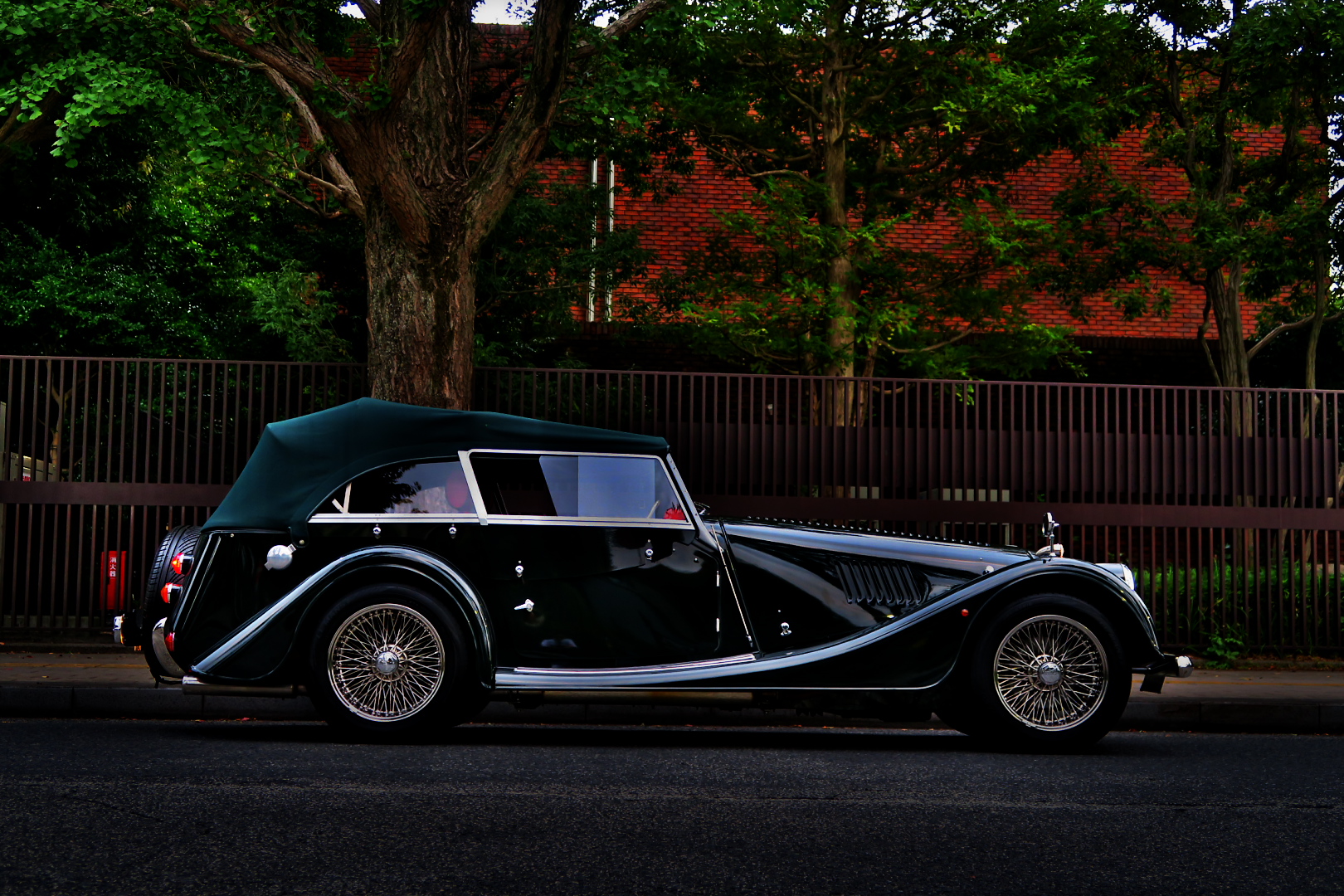 モーガン「ロードスター」! 2004年から登場した新型モデル「ロードスター」。 「プラス4」と「プラス8」の中間に位置するモデルである。 1930年代のクラシック・カーを現在でも生産しつづけている世界で唯一の自動車メーカー ・・「モーガン」。 この車に乗る前に、その歴史を簡単に、ご紹介しておきたい。 イギリスは、ウースター州マルヴァーン・リンクという小さな街にあるレンガ作りの古風な 工場・・「モーガン・モーター・カンパニー」の誕生は、100年以上も前にさかのぼる。 1907年に初代「モーガン」氏が、自身のために1台の3輪自動車(スリーホイラー) を作ったことから始まる。 1910年のモーターショーに出品されたオートバイ・エンジンを積む、フロント2輪、 リア1輪のスリーホイラーは、税金面での優遇性と驚くほどの加速性能で、人気を得る。 瞬く間に多数のオーダーが入り、1912年には、正式に「モーガン・モーター・カンパニー 」を設立することになる。 顧客の好みに応じ、当時人気のオートバイエンジンを積んだスリーホイラーは、2人乗りから 4人乗りまで、数年ごとに数々のバリエーションが発表され、会社の基盤を作る。 そして、 市場の要求という時代の波に乗り1936年秋、満を持して4輪自動車を発表する。 モデル名:モーガン「4/4」・・・モーガン4輪ファーストモデルである。 4気筒の4輪車という意味の4/4という名称で、「Four・Four」と発音したほうが よい。 Z型スチール製のラダーフレームに叩き出しのスチール・パネル(アルミ製も有る)を ボディに貼り付ける・・といった製作方法は、全モデル共通で、それは当モデルでも変わって いない。 よく、「木骨フレーム」の・・なんて書かれていることがあるが、本当の意味でのフレーム は、上記の通り、頑丈なスチール製であり、あくまでも、ボディの一部、例えば、ドア枠、 リアホイールアーチ、ダッシュボードを留めるための土台などの造作内部に木材が使われて いるにすぎない。 使われている木材は、「アッシュ材」と「松」。 これも、英国流の基本のまま、、。 戦前のイギリス車の大半は、ロールス・ベントレーも含めて見えない部分には木材が使われ ていたが、現在に、その技法を残すのは、世界広しといえど、モーガンだけだ。 「4/4」は、その後、数年おきにエンジンが、新しいものに変更され、1963年には 「シリーズ5」まで進む。 国内に正規輸入されるようになったのは、このモデルからではなかろうか? この「シリーズ5」は、1968年まで生産されるが、、正直、こんな古い時代の正規 輸入物モーガンは、国内に、ほとんど存在しない・・・ なにせ、正規で輸入されたモーガンは、当時のディーラーにより(1966年から1967年 にかけて輸入元:セール・チルニー・ジャパン)、4台しか輸入されていないという。 1968年からは、「モーガン・オート・タカノ」さんが正規ディーラーとなり、2005年 10月には、「モーガン・オート・イワセ」さんが後継となり、近年まで続けていた。 モーガンは、「4/4」モデル、1L代の排気量の非力感を補うため1950年 2.1Lの直4エンジンを積む「プラス4」を発表する。 「4/4」のハイパワーバージョンであるが、その後、 1968年、さらに V型8気筒を積む「プラス8」を追加。 そうして モーガンは、しばらくの間(2004年まで) 「4/4」、「プラス4」、「プラス8」の3つのラインナップを揃えていた。 ところが、2004年 「プラス8」に替わり、久方振りに新型モデルが登場する。 FORDのV型6気筒3Lを積む「ロードスター」 それが、当個体である。 前述の通り、戦前と変わらぬハンドメイド ボディは、総アルミで、「プラス8」と同じくワイド・ボディ。 全幅は、169cmもあり、全高は、僅かに122cm(当・4シーターは、137cm) 広くて低い。 見た目は、あくまでクラシックカー ただし、中身は、 最新のFORD製「モンデオ」などに積まれ好評価を受けた「V6」である。 4ドア・サルーンのモンデオでさえ、その走りの良さを称えられたほどのエンジンである から、それを 車輌重量 1トンほどのクルマに積んでしまえば、、ご想像の通り 236馬力! 0−99kmを5.0秒、 最高速は、200kmをゆうに超える。 ギアBOXも信頼のFORD製で、その5速MTは、お約束どおり、ショート・ストローク、 実に小気味良い。 ハンドル操作にパワステはないが、それに気が付かないほど取り回しがよい。 パワーに見合うブレーキも抜かりなし、 リアは、相変らずのドラム式ながら、フロントは、「ロッキード」製のディスク・ブレーキ 大径ローターで、効きも最新鋭。 その後のMORGAN社は、いつのまにか、また「プラス8」を復活させ、 「4/4」、「プラス4」、「ロードスター」、「プラス8」、「エアロ8」と いう5つのモデルを持つ時代もあった(今は、プラス4とプラス6のみ) あえて、「ロードスター」を褒めるなら、「4/4」と「プラス4」は非力、 「プラス8」は、直線道路仕様のドラッグスター = アメリカ向けモデル。 =「ロードスター」は日本で乗るベスト・モデル。 ご存