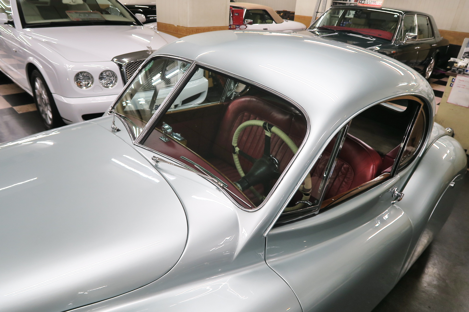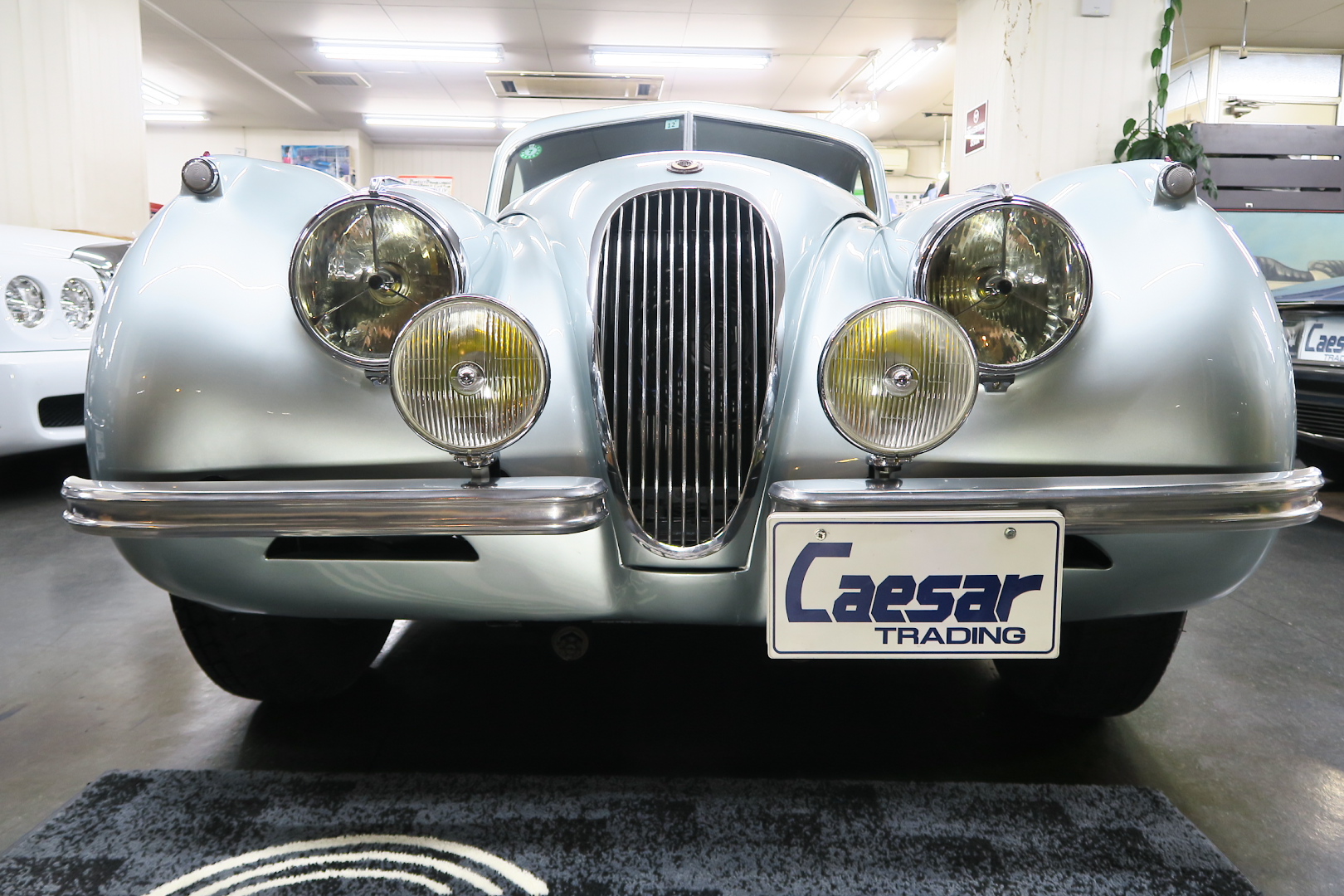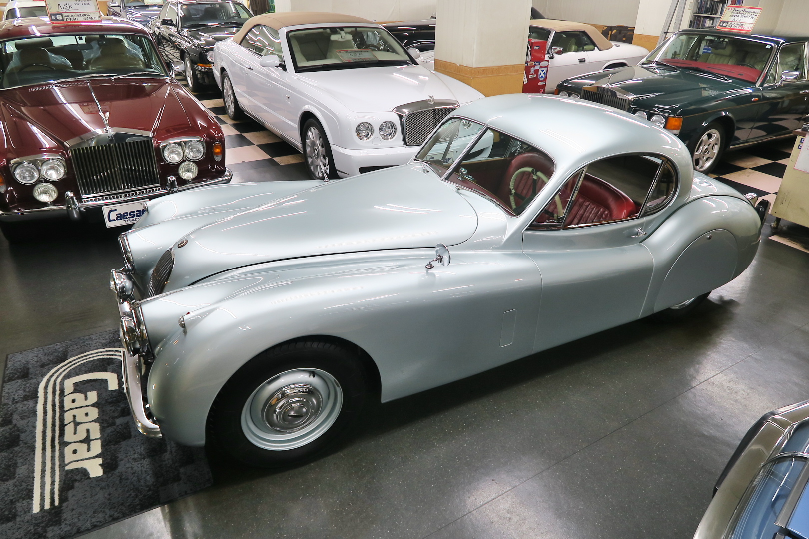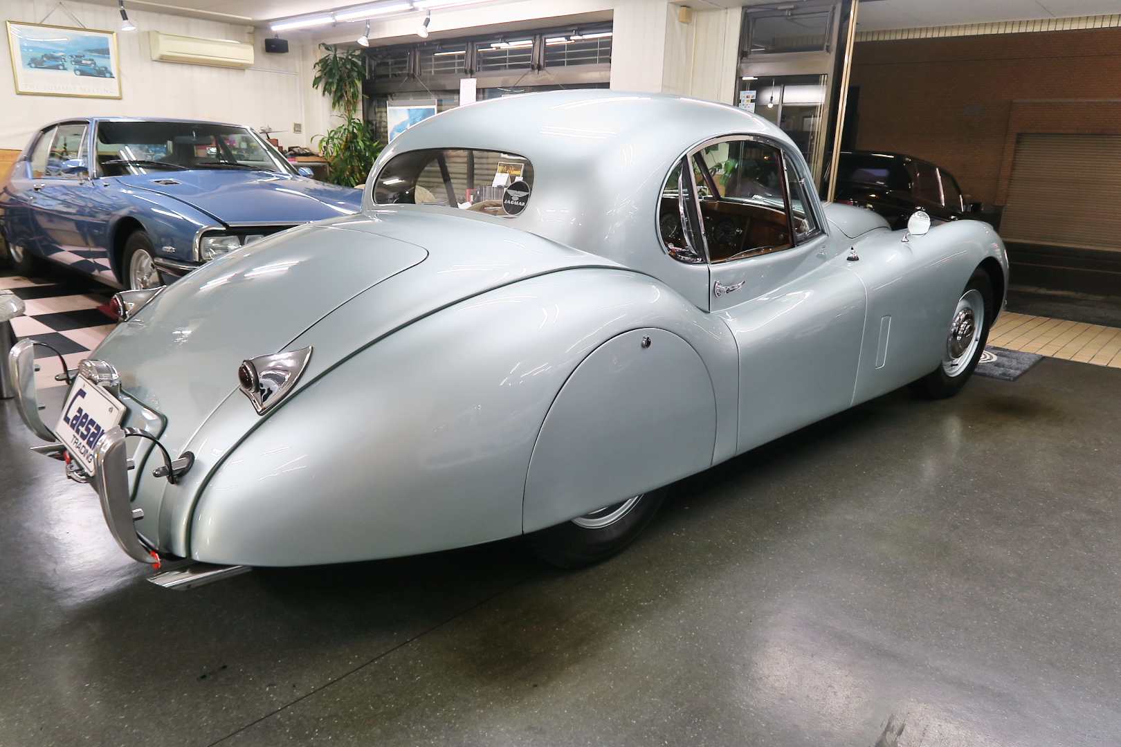 「XK120」物語 1922年、若干21歳だった「ウイリアム・ライオンズ」が創業した「スワローサイド・ カンパニー」、サイドカーの販売から始まった小さな会社を、世界的スポーツカー メーターへと転身させたのが、当「XK120」である。 戦前の名車「SS100」スポーツカーの高性能版・後継モデル。 1948年10月、ロンドン・モーターショーでデビューする。 このショーは、サルーンの「マーク5」が主役のはずだったが、それではインパクトが 弱い、、と考えたライオンズが急きょデザインし、完成させた、いわば客引き用の ワンメイクのコンセプトモデルであったが、、これが大反響、、世界中から注文が 殺到した。 ハリウッドスターがこぞって、、「ハンフリー・ボガート」「クラーク・ゲーブル」 「イングリッド・バークマン」などなど 翌、1949年からカタログモデルとして販売することに。 ただ、このモデル、量産予定がなかったので、1台づつトンテンカンのアルミボディ、 当初(1950年3月まで)の「243台」はアルミで作られたが、その後は、スティール製 ボディ(プレス)に変更される。 「XK120」の「120」は、「120マイルは出る」という意味であったが、実際、 1949年に有名誌「ザ・モーター」が、最高速を計測したところ、実走で、 「124.62マイル」(199.36km)を記録、、マジであった。 しかも、超安価。 かの「WOベントレー」師匠が設計した「直6DOHC」エンジンを積んだ、アストン ・マーティンの「DB2ヴァンテージ」はXK120の1.5倍の価格であったが、性能的 には、125馬力で最高速は、187km、、。 そりゃ 売れるさ。 欠点といえば、、、その あまりに質素な作り、、だって、コンセプカーですから。 デザインと性能は素晴らしいが 豪華さは なし。 そこで、 1951年3月、新型モデルを投入する。 それが、当「XK120 FHC」である。 * FHC「フィクスド・ヘッド・クーペ」は、クーペ。 * DHC「ドロップ・ヘッド・クーペ」は、オープンカー。 こちらは、待ちに待った「豪華版」クーペ! それまでの、パネルは、ビニール張り、FHCは、バーウォールナット張り、 巻き上げ式ウインドに三角窓、ヒーター付きで、本革シートが標準装備。 おまけに、デザインは、かの「ブガッティ・タイプ57・アトランテ」を彷彿させる 丸みをおびた流線形。 こちらも注文殺到、、 ついには、工場が手狭となり、1952年11月 コヴェントリーの「ブラウンズレイン工場」へ移転。 この工場は、それまで、「ディムラー」がいくつか持っていた秘密工場で、 戦時中は、「小型装甲車」(フェレットなどの)を生産していた大工場だ。 この工場の設備のお陰で、生産効率は、飛躍的に向上する。 調子にのって、1953年、「カブリオレ」モデルを投入。 初期モデルは、簡易幌のロードスターといったイメージだったが、こちらは、固定式の ちゃんとした裏地付き幌を持つオープンカー。 ジャガー社的には、カブリオレであるが、世間では、最初に「FHC」があったため 「DHC」と呼ばれる場合も。 こちらも好評であったが、生産は、翌1954年まで 1955年には、後継モデル「XK140」が発売されたからである。 その後、1957年には、「XK150」に とパワーを増す替わりに、、 「XK120」のグラマラスな流線美は、どんどん失われていく。 より室内空間を確保するため らしいが、平たくいうと、どんどん普通〜になる。 その後は、1961年より、あの「Eタイプ」にシリーズを継承するわけだが、 今回は、「XK120」に話を絞ろう。 「XK120」が今もなおモータースポーツ界に その名を残す最大の理由は、 このモデルを元に製作したレースマシン「Cタイプ」「Dタイプ」にある。 機関系もチューン(210馬力)されたが、なにより、「C」「D」のデザイナー、 ちょうど「ブリストル社」から移籍してきたばかりの「マルコム・セイヤー」が担当。 彼が 後に「Eタイプ」をデザインすることになる。 「Cタイプ」は、「1951年」と「1953年」に「ルマン24時間レース」で総合優勝! 1954年には、「Dタイプ」に進化し、「1955年」「56年」「57年」と3年連続 「ルマン」で総合優勝! バケモン この時代には、たいしたスポーツカーがなかった わけではない。 最初の「51年」時、「アストン」も「ベントレー」も「ポルシェ」も参戦していたし、 「55年」時には、全員集合、、「フェラーリ・121LM」、「マセラティ・300S」、 「メルセデス・300SLR」、「アストン・DB3S」、「ラゴンダ」、「トライアンフ」 などなど、今じゃ数億、数十億円する名車ばかり、、その中で、3年連続優勝 って、 夢のような話、、 1958年には、レースの規定が「3L以下」とされたため、参加し ていないが、、参加できなかった「Dタイプ」のパーツを集めて生産したのが、 1957年発売の 市販車「XKSS」である。 「スティーブ・マックイーン」が乗っていたことで有名であるが、 このモデル、生産から僅かして、工場が火災になり、わずか、16台しか作れていない。 「XK120オープン」生産台数:左「6438台」、右「1176台」:計:「7614台」 「XK120 FHC」生産台数:左「2485