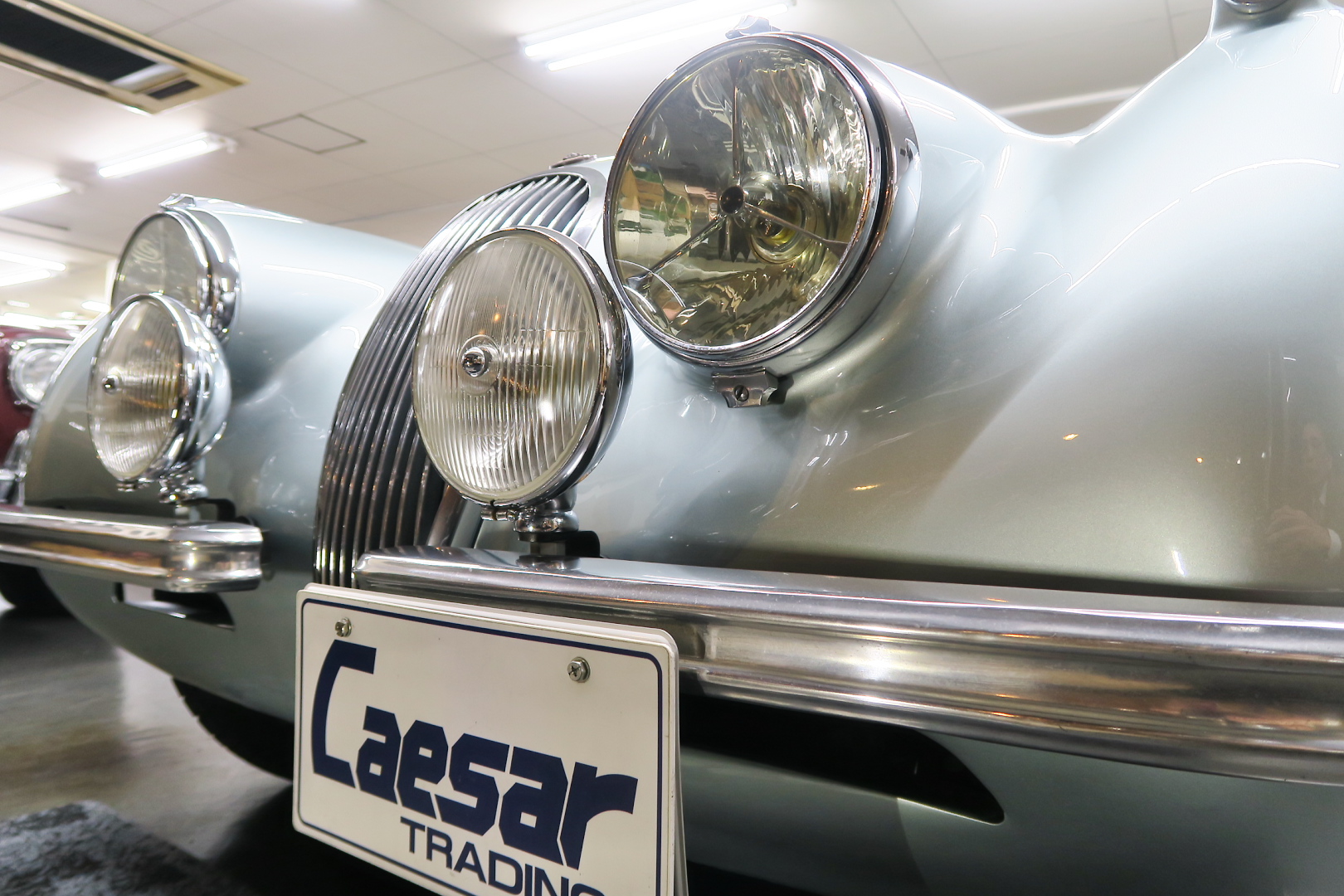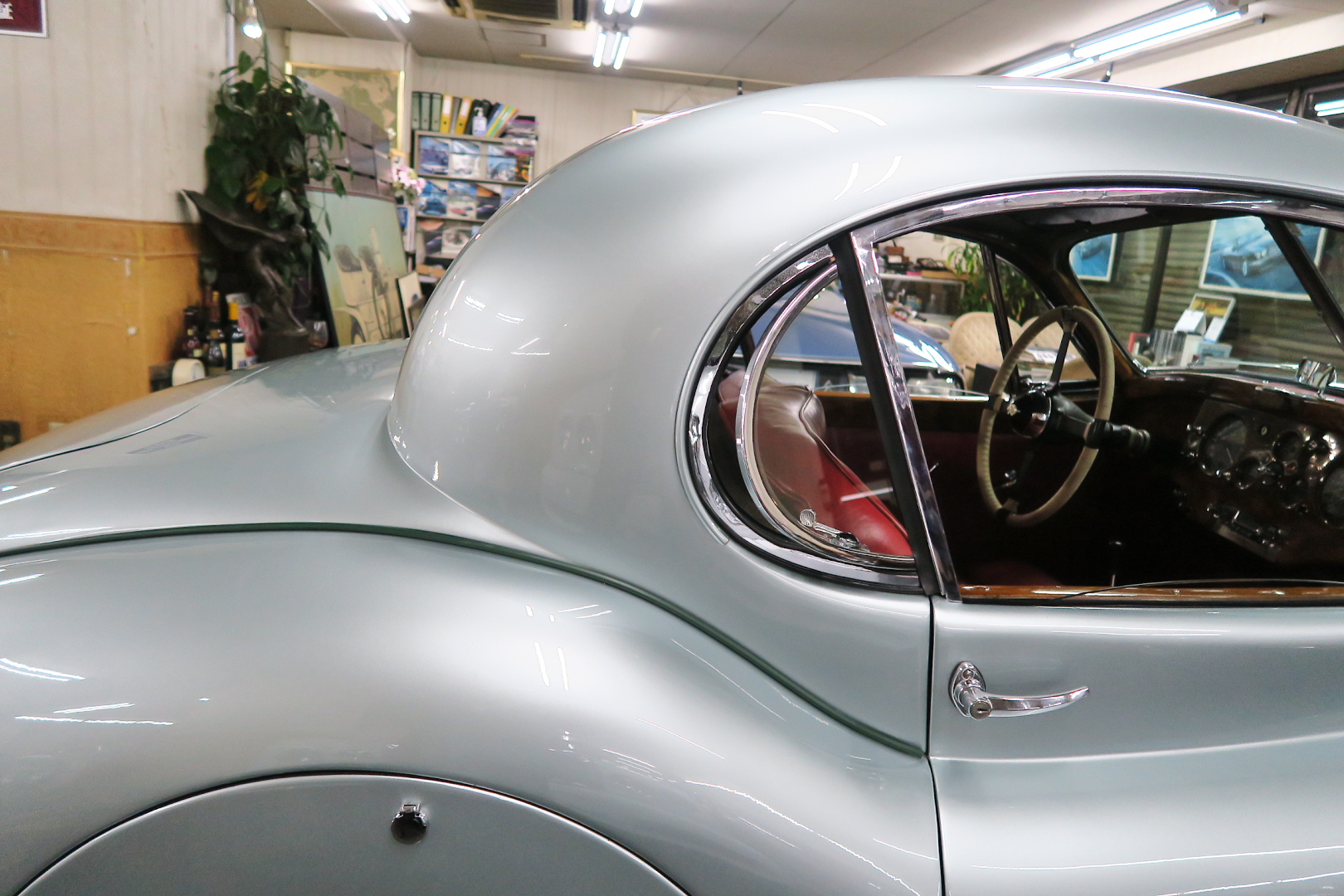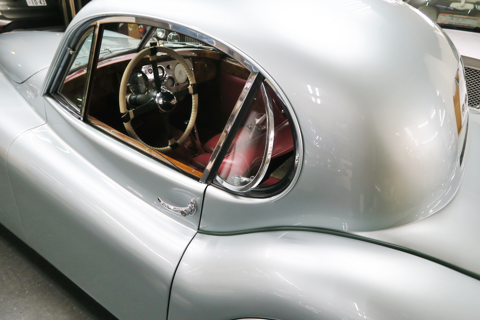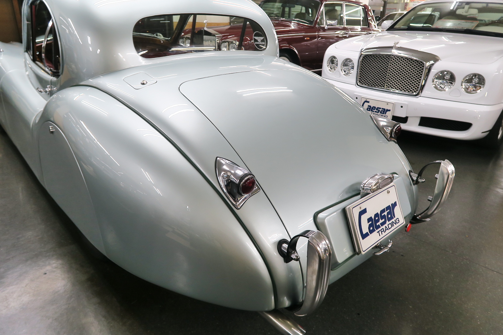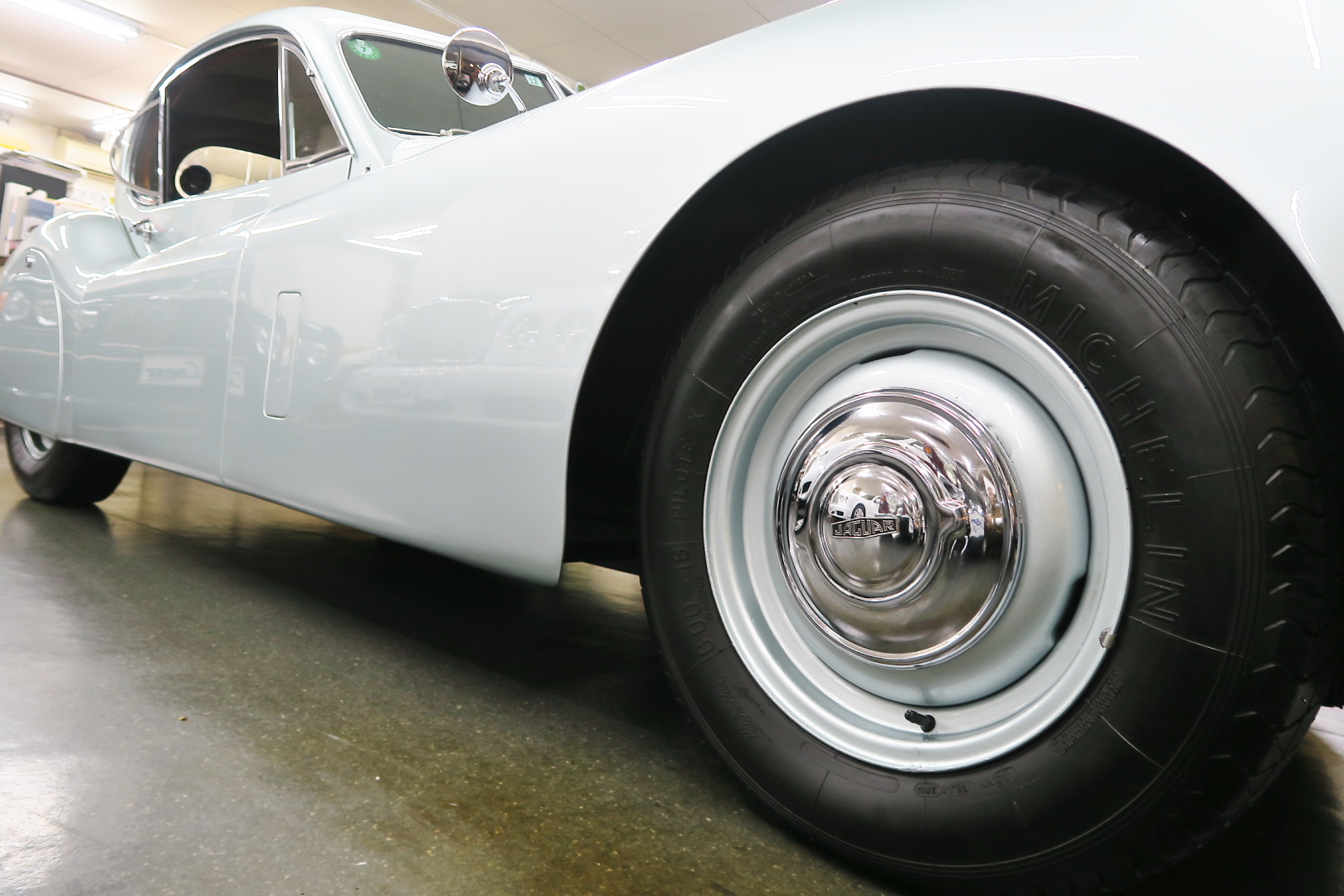 「XK120」物語 1922年、若干21歳だった「ウイリアム・ライオンズ」が創業した「スワローサイド・ カンパニー」、サイドカーの販売から始まった小さな会社を、世界的スポーツカー メーターへと転身させたのが、当「XK120」である。 戦前の名車「SS100」スポーツカーの高性能版・後継モデル。 1948年10月、ロンドン・モーターショーでデビューする。 このショーは、サルーンの「マーク5」が主役のはずだったが、それではインパクトが 弱い、、と考えたライオンズが急きょデザインし、完成させた、いわば客引き用の ワンメイクのコンセプトモデルであったが、、これが大反響、、世界中から注文が 殺到した。 ハリウッドスターがこぞって、、「ハンフリー・ボガート」「クラーク・ゲーブル」 「イングリッド・バークマン」などなど 翌、1949年からカタログモデルとして販売することに。 ただ、このモデル、量産予定がなかったので、1台づつトンテンカンのアルミボディ、 当初(1950年3月まで)の「243台」はアルミで作られたが、その後は、スティール製 ボディ(プレス)に変更される。 「XK120」の「120」は、「120マイルは出る」という意味であったが、実際、 1949年に有名誌「ザ・モーター」が、最高速を計測したところ、実走で、 「124.62マイル」(199.36km)を記録、、マジであった。 しかも、超安価。 かの「WOベントレー」師匠が設計した「直6DOHC」エンジンを積んだ、アストン ・マーティンの「DB2ヴァンテージ」はXK120の1.5倍の価格であったが、性能的 には、125馬力で最高速は、187km、、。 そりゃ 売れるさ。 欠点といえば、、、その あまりに質素な作り、、だって、コンセプカーですから。 デザインと性能は素晴らしいが 豪華さは なし。 そこで、 1951年3月、新型モデルを投入する。 それが、当「XK120 FHC」である。 * FHC「フィクスド・ヘッド・クーペ」は、クーペ。 * DHC「ドロップ・ヘッド・クーペ」は、オープンカー。 こちらは、待ちに待った「豪華版」クーペ! それまでの、パネルは、ビニール張り、FHCは、バーウォールナット張り、 巻き上げ式ウインドに三角窓、ヒーター付きで、本革シートが標準装備。 おまけに、デザインは、かの「ブガッティ・タイプ57・アトランテ」を彷彿させる 丸みをおびた流線形。 こちらも注文殺到、、 ついには、工場が手狭となり、1952年11月 コヴェントリーの「ブラウンズレイン工場」へ移転。 この工場は、それまで、「ディムラー」がいくつか持っていた秘密工場で、 戦時中は、「小型装甲車」(フェレットなどの)を生産していた大工場だ。 この工場の設備のお陰で、生産効率は、飛躍的に向上する。 調子にのって、1953年、「カブリオレ」モデルを投入。 初期モデルは、簡易幌のロードスターといったイメージだったが、こちらは、固定式の ちゃんとした裏地付き幌を持つオープンカー。 ジャガー社的には、カブリオレであるが、世間では、最初に「FHC」があったため 「DHC」と呼ばれる場合も。 こちらも好評であったが、生産は、翌1954年まで 1955年には、後継モデル「XK140」が発売されたからである。 その後、1957年には、「XK150」に とパワーを増す替わりに、、 「XK120」のグラマラスな流線美は、どんどん失われていく。 より室内空間を確保するため らしいが、平たくいうと、どんどん普通〜になる。 その後は、1961年より、あの「Eタイプ」にシリーズを継承するわけだが、 今回は、「XK120」に話を絞ろう。 「XK120」が今もなおモータースポーツ界に その名を残す最大の理由は、 このモデルを元に製作したレースマシン「Cタイプ」「Dタイプ」にある。 機関系もチューン(210馬力)されたが、なにより、「C」「D」のデザイナー、 ちょうど「ブリストル社」から移籍してきたばかりの「マルコム・セイヤー」が担当。 彼が 後に「Eタイプ」をデザインすることになる。 「Cタイプ」は、「1951年」と「1953年」に「ルマン24時間レース」で総合優勝! 1954年には、「Dタイプ」に進化し、「1955年」「56年」「57年」と3年連続 「ルマン」で総合優勝! バケモン この時代には、たいしたスポーツカーがなかった わけではない。 最初の「51年」時、「アストン」も「ベントレー」も「ポルシェ」も参戦していたし、 「55年」時には、全員集合、、「フェラーリ・121LM」、「マセラティ・300S」、 「メルセデス・300SLR」、「アストン・DB3S」、「ラゴンダ」、「トライアンフ」 などなど、今じゃ数億、数十億円する名車ばかり、、その中で、3年連続優勝 って、 夢のような話、、 1958年には、レースの規定が「3L以下」とされたため、参加し ていないが、、参加できなかった「Dタイプ」のパーツを集めて生産したのが、 1957年発売の 市販車「XKSS」である。 「スティーブ・マックイーン」が乗っていたことで有名であるが、 このモデル、生産から僅かして、工場が火災になり、わずか、16台しか作れていない。 「XK120オープン」生産台数:左「6438台」、右「1176台」:計:「7614台」 「XK120 FHC」生産台数:左「2485