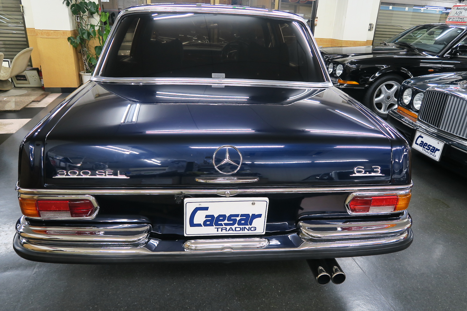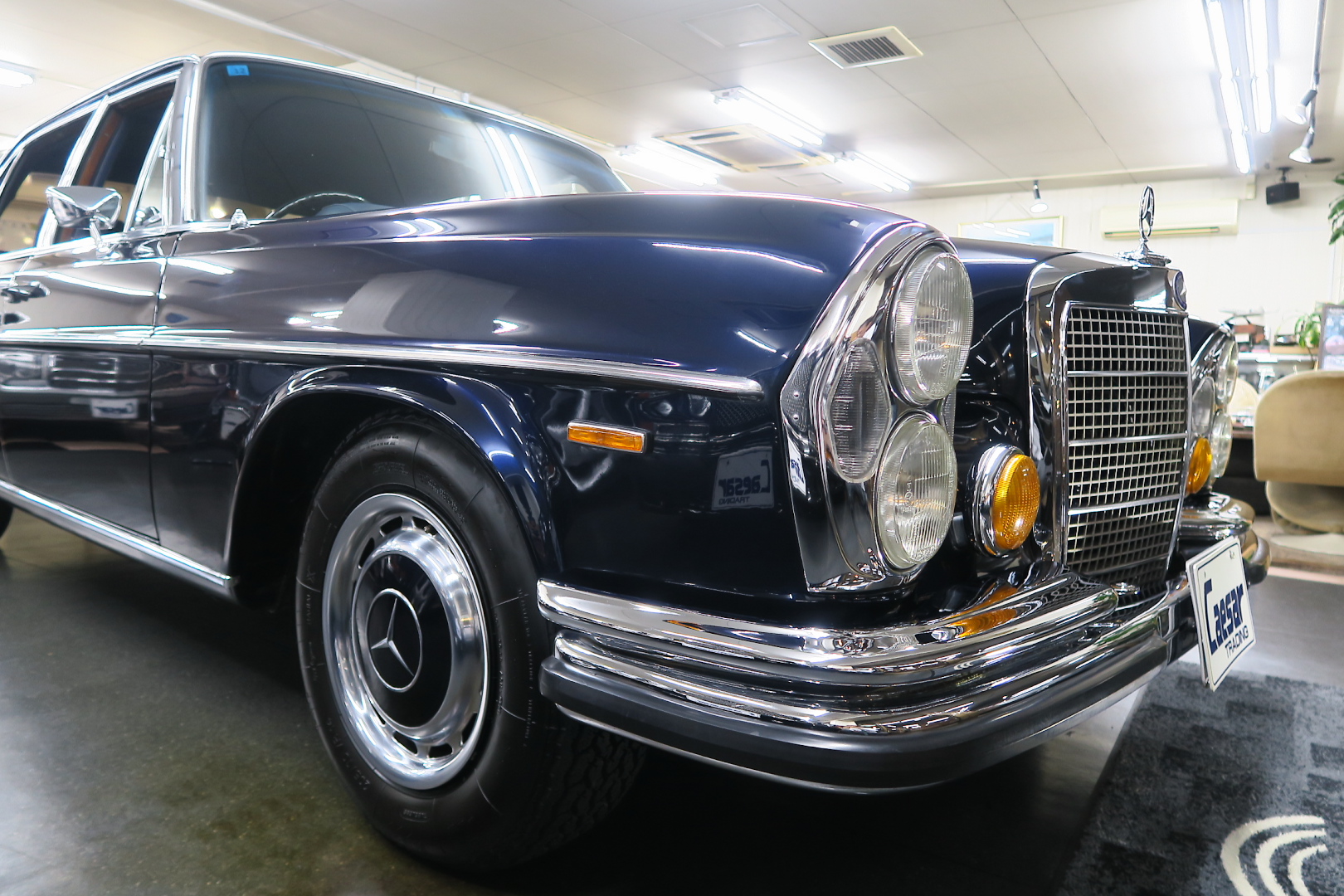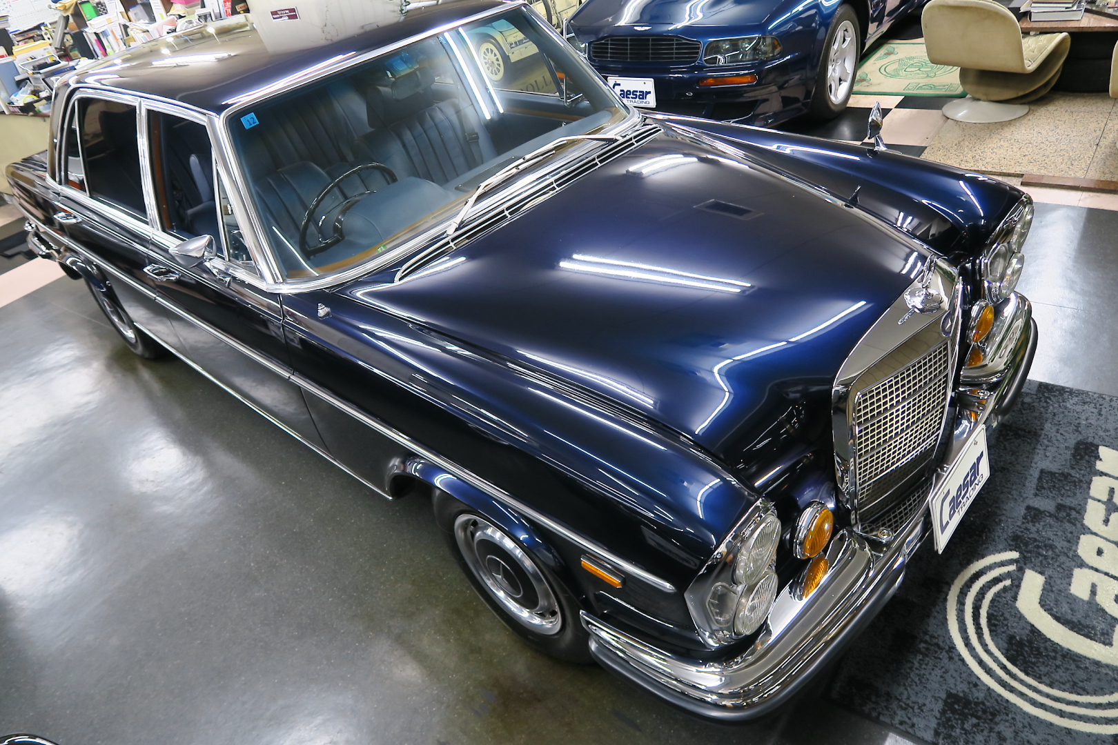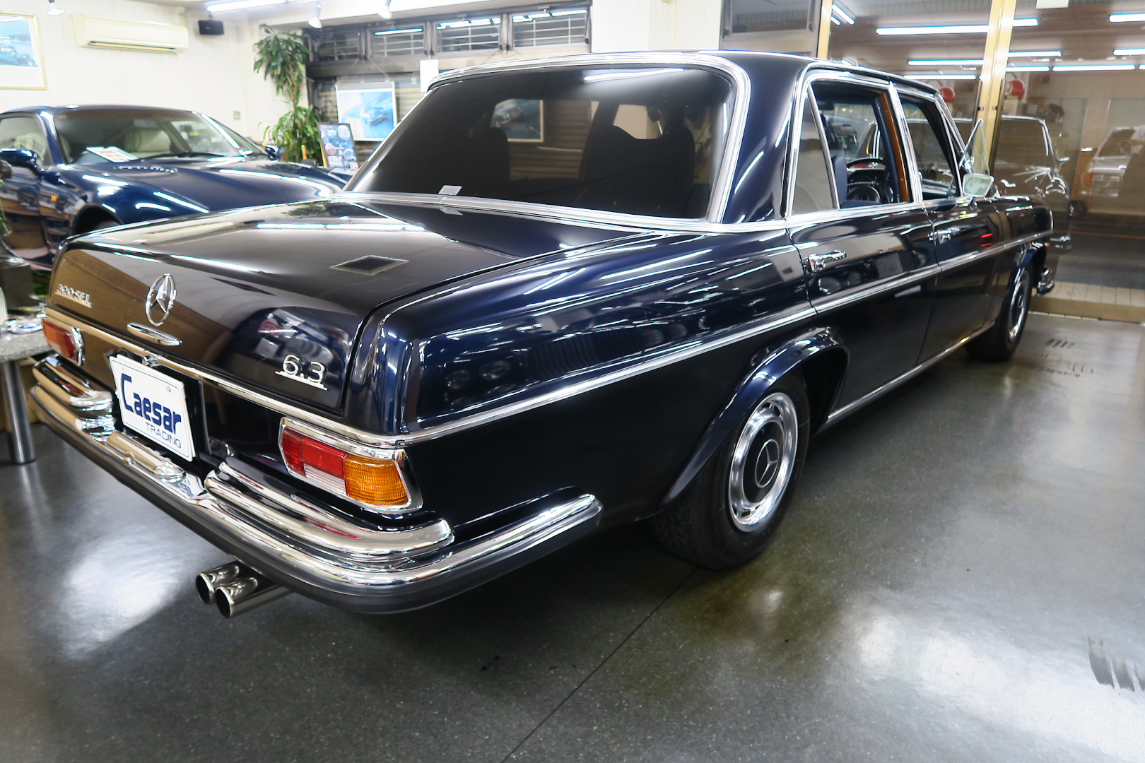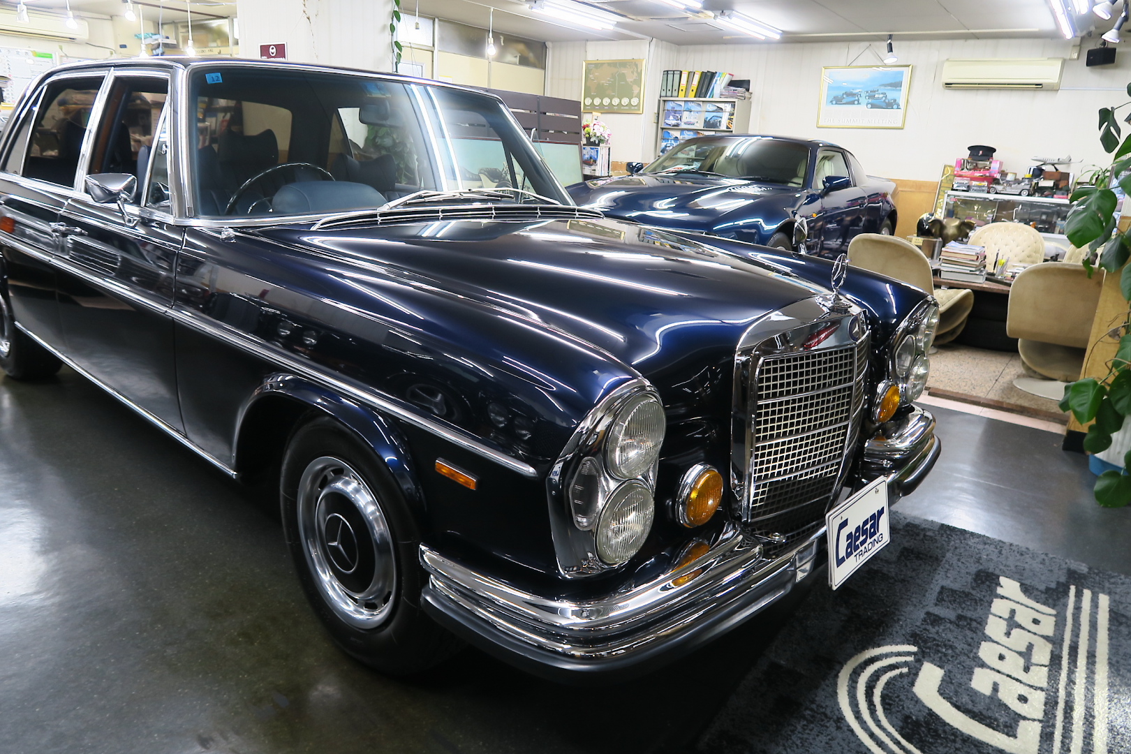 「300SEL 6.3」物語 1967年〜1972年の間に生産された「W109」タテ目の「300SEL」の 「6.3」である。 それも、ウエスタン自働車(ディーラー)物の「右ハンドル」 しかも、3オーナー、前オーナー様は、昭和59年から41年間も ご所有。 このモデルの生い立ちは、極めて興味深く、面白い。 こんな無茶なモデルがなぜに誕生したのか? ベースモデルは、1965年に発売されたばかりの最上級高級セダン「300SEL」 このモデルは、直列6気筒、3L、170馬力、 この頑丈なシャーシに目を付けたのが、エンジニアの「エーリッヒ・ヴァイクセンベル ロー」(文中:ベルローに短縮)。 1966年、「この300SELのシャーシなら、M600エンジンを積んだら面白そ〜 で、社内で こっそく時間を見つけて、載せ替え、完成させた車で、工場の敷地を 走り回った、、そして、その「音」でバレた、、 明らかに、聞くはずのない「音」、、工場責任者「ドルフ・ウーレンハウト」に見つか る。 彼はベルローに じっくり話を聞いたのち、試乗してみる。 結果、すぐに、開発へのGOサインを出す。 メーカー広報誌によれば、「書類にサインするとき、ウーレンハウトは、 ニヤリと笑ったはずだ、、」 なかなか 粋な会社である。 翌1967年、早くも市販モデル1台が完成。 正式モデル名: 「300SEL 6.3」 文字通り、「600リムジーネ」&「600プルマン」(1963年〜1981年)に積んだ 「M100」エンジン、V8、6.3L、250馬力、を移植。 これは、思った以上に販売不信だった「M100」の使い道を広げる意味もあった。 1968年から、正式に発売、1972年まで販売する。 生産台数: 「6526台」 この変態的怪物モデルは、想定外に 売れた。 ドイツ国内では、1839台しか売れていないが北米を中心とした海外で人気に火が付いた それは、現在でも同じ。 因みに、1967年は我が国でも、あの「トヨタ2000GT」が販売された年。 スペックを比較してみると: ・「300SEL 6.3」 最高速:「221km」 0−400m:「15.4秒」 ・「トヨタ2000GT」 : 「220km」 0−400m:「15.9秒」 ・「67’ ポルシェ911S」 :「225km」 0−400m:「15.8秒」 ・「70’ ハカスカGTR」 : 「200km」 0−400m:「16.0秒」 国内無敵の「2000GT」も、「6.3」に及ばず、ポルシェも「S」以外じゃ、太刀打ち できず、後年発売の「GTR」は、ぶっちぎられる、、まさに、スーパースポーツカー 、、「セダン」のくせに、、本物の「羊の皮をかぶった狼」! しかも、エアサスにレベルコントロール(車高自動調整)、AT、PW、パワステ、 クーラー付きで、乗心地も快適。「アウトバーンの覇者」。 では、当個体のお話: ウエスタン自働車(=ヤナセ=ディーラー)物、右ハンドル、3オーナー 前オーナー様は、昭和59年(1984年)より、2025年まで 41年間 ご所有。 聞けば分かる有名企業のオーナー様で、入手当初は、ヤナセ整備、できるメカニックが 引退したのちは、通常整備は、地元整備工場で、「6.3」ならではの整備は、例の神戸 の専門店様にて。この専門店さまで、2021年に大掛かりな整備、明細残る。 ・エアサス関係・レベリング関係・インジェクション関係・コンプレッサー・ウォータ ーポンプ関係・ブレーキ関係など、「6.3」における「キモ」整備が施されている。 しかも、長年のお付き合いの「正しすぎる一時預かり人」である、前オーナー様は、 弊社に持つ込むまえ、2025年8月、「シーザーさんに迷惑がかからないように」と、 前述の専門店様に入庫、点検依頼、「どこか不具合箇所があれば直しといて」 で、・ヒーターコア脱着・修理、プラグ交換、エンジンオイル交換、各グリスUP、 などなどが施された上で、当社入庫。 感謝・感激。 また、お次のオーナー様にとっても、相当な安心材料であろう。 お金持ち あるあるだが、記録簿とか なんですか それ である。 ただ、車検証上で分かるのは、 令和3年12月: 「77.200km」 令和5年12月: 「78.900km」 現在: 「79.200km」! さらに、当個体は、正しい整備だけでなく、内外装もレストアが施されている。 外装は: 「ダークブルー」メタリックに、全バラシ「オールペイント」済み。 *元色は、「パピルス・ホワイト」 (カラーVINで分かる) 塗装状態も素晴らしい◎。 「300SEL」の5mボディに良く似合うカラーで、重量感を感じる。 実際には、オリジナル「300SEL」の重量は、「1655kg」で、「6.3」は、 「1740kg」なので、85kgしか重くない(エンジンの重さの違い分)のが、、 なんだが、まったくオーラが異なるのは、、私の「6.3」への憧れ だからだけでは なさそうだ。 内装は: 「紺・本革」 「総張替え」 ・シート・ダッシュボード・天井内張り・カーペットに至るまで全て。 で、ほとんど乗らないものだから、今もバリビカ。 ただ、ウッド類は、オリジナルのまま なので、風情が残る。 ここが素のままなので、時代があう。 ・4速AT・パワーステアリング・パワーウインド・クーラー、快適な怪物マシン。 後付けで、・パナ「ゴリラ」ナビ(取り外し可)・「バックカメラ」連動・ETC・ 「前後ドラレコ」・「油圧メーター」 即戦力。 機関系: エンジンは、前述の通り、「M100」、当