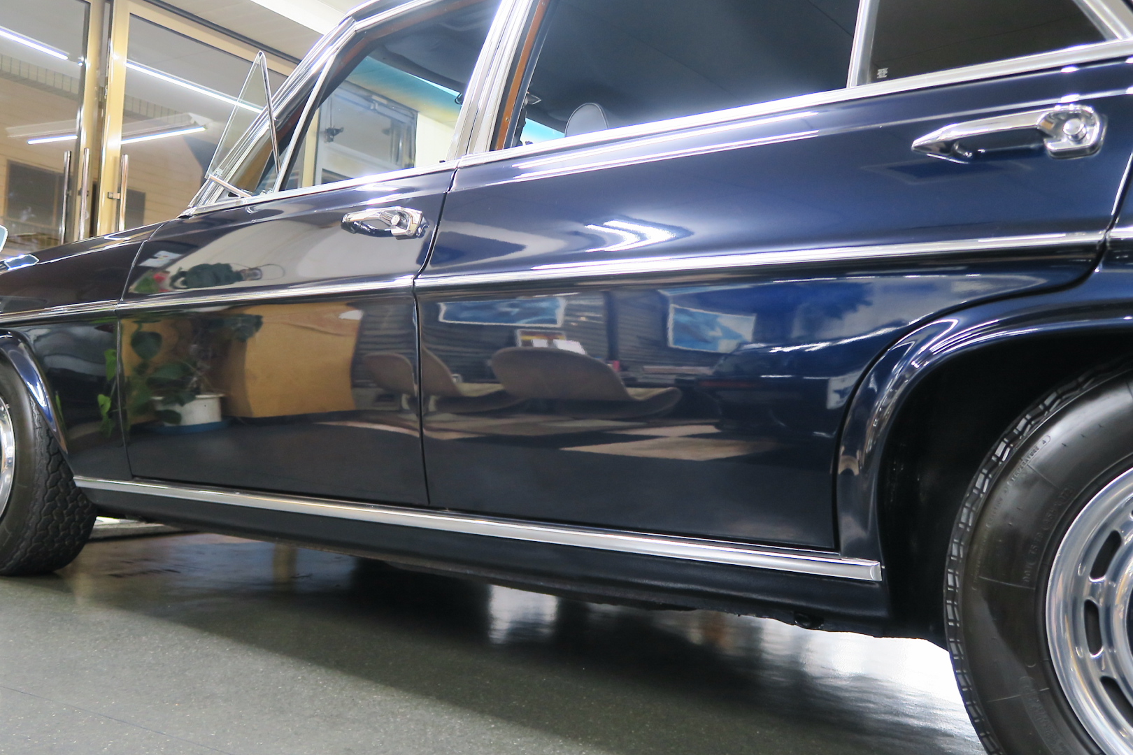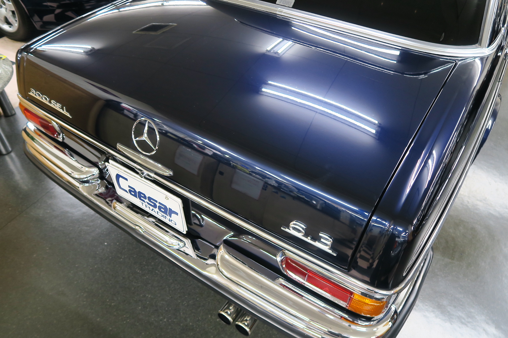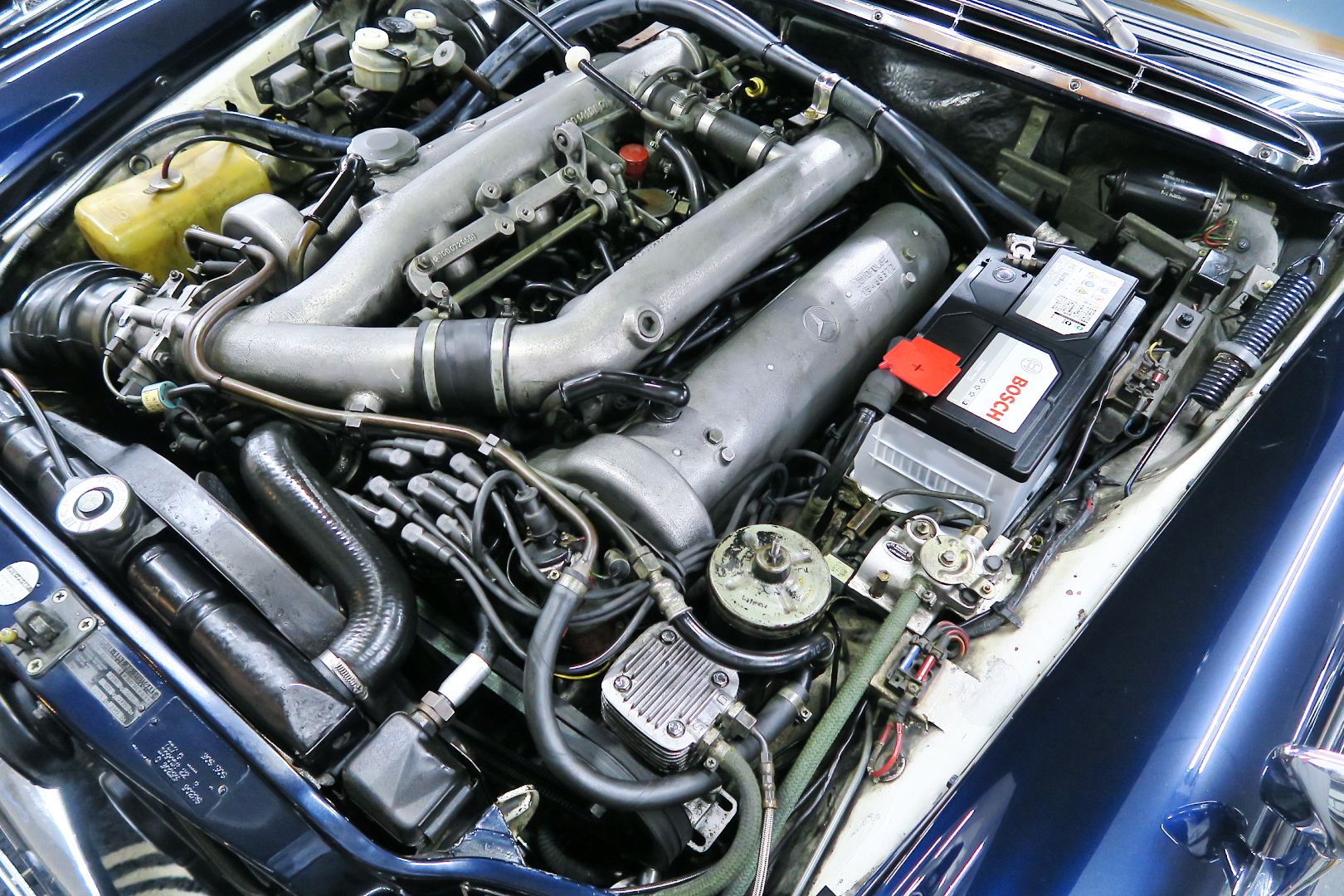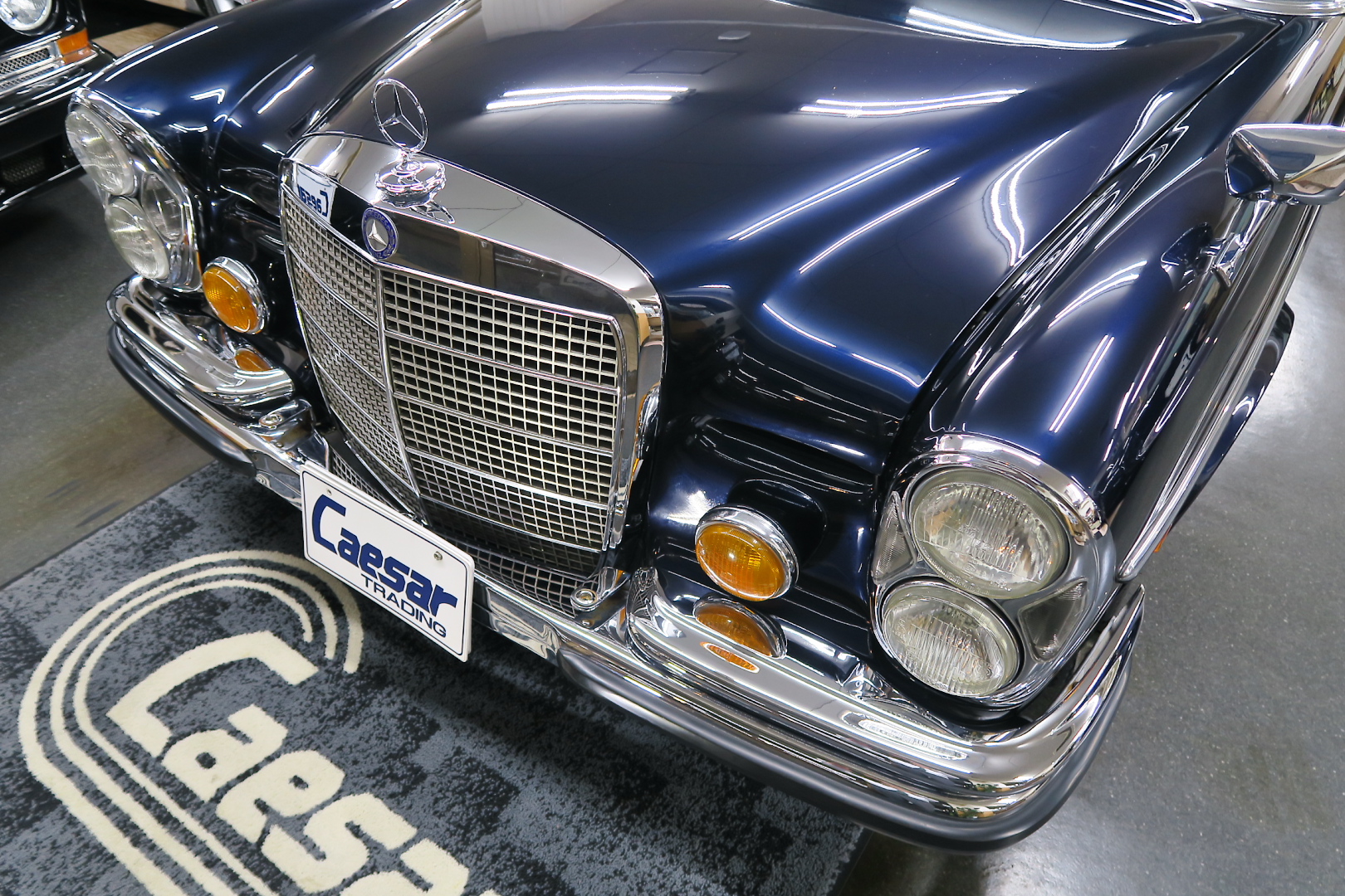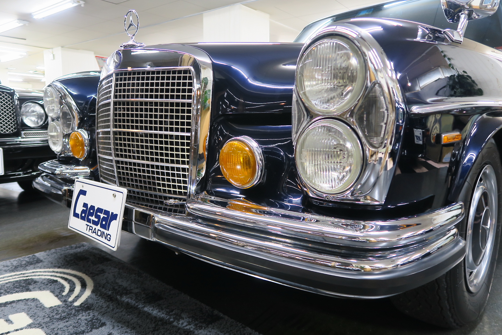 「300SEL 6.3」物語 1967年〜1972年の間に生産された「W109」タテ目の「300SEL」の 「6.3」である。 それも、ウエスタン自働車(ディーラー)物の「右ハンドル」 しかも、3オーナー、前オーナー様は、昭和59年から41年間も ご所有。 このモデルの生い立ちは、極めて興味深く、面白い。 こんな無茶なモデルがなぜに誕生したのか? ベースモデルは、1965年に発売されたばかりの最上級高級セダン「300SEL」 このモデルは、直列6気筒、3L、170馬力、 この頑丈なシャーシに目を付けたのが、エンジニアの「エーリッヒ・ヴァイクセンベル ロー」(文中:ベルローに短縮)。 1966年、「この300SELのシャーシなら、M600エンジンを積んだら面白そ〜 で、社内で こっそく時間を見つけて、載せ替え、完成させた車で、工場の敷地を 走り回った、、そして、その「音」でバレた、、 明らかに、聞くはずのない「音」、、工場責任者「ドルフ・ウーレンハウト」に見つか る。 彼はベルローに じっくり話を聞いたのち、試乗してみる。 結果、すぐに、開発へのGOサインを出す。 メーカー広報誌によれば、「書類にサインするとき、ウーレンハウトは、 ニヤリと笑ったはずだ、、」 なかなか 粋な会社である。 翌1967年、早くも市販モデル1台が完成。 正式モデル名: 「300SEL 6.3」 文字通り、「600リムジーネ」&「600プルマン」(1963年〜1981年)に積んだ 「M100」エンジン、V8、6.3L、250馬力、を移植。 これは、思った以上に販売不信だった「M100」の使い道を広げる意味もあった。 1968年から、正式に発売、1972年まで販売する。 生産台数: 「6526台」 この変態的怪物モデルは、想定外に 売れた。 ドイツ国内では、1839台しか売れていないが北米を中心とした海外で人気に火が付いた それは、現在でも同じ。 因みに、1967年は我が国でも、あの「トヨタ2000GT」が販売された年。 スペックを比較してみると: ・「300SEL 6.3」 最高速:「221km」 0−400m:「15.4秒」 ・「トヨタ2000GT」 : 「220km」 0−400m:「15.9秒」 ・「67’ ポルシェ911S」 :「225km」 0−400m:「15.8秒」 ・「70’ ハカスカGTR」 : 「200km」 0−400m:「16.0秒」 国内無敵の「2000GT」も、「6.3」に及ばず、ポルシェも「S」以外じゃ、太刀打ち できず、後年発売の「GTR」は、ぶっちぎられる、、まさに、スーパースポーツカー 、、「セダン」のくせに、、本物の「羊の皮をかぶった狼」! しかも、エアサスにレベルコントロール(車高自動調整)、AT、PW、パワステ、 クーラー付きで、乗心地も快適。「アウトバーンの覇者」。 では、当個体のお話: ウエスタン自働車(=ヤナセ=ディーラー)物、右ハンドル、3オーナー 前オーナー様は、昭和59年(1984年)より、2025年まで 41年間 ご所有。 聞けば分かる有名企業のオーナー様で、入手当初は、ヤナセ整備、できるメカニックが 引退したのちは、通常整備は、地元整備工場で、「6.3」ならではの整備は、例の神戸 の専門店様にて。この専門店さまで、2021年に大掛かりな整備、明細残る。 ・エアサス関係・レベリング関係・インジェクション関係・コンプレッサー・ウォータ ーポンプ関係・ブレーキ関係など、「6.3」における「キモ」整備が施されている。 しかも、長年のお付き合いの「正しすぎる一時預かり人」である、前オーナー様は、 弊社に持つ込むまえ、2025年8月、「シーザーさんに迷惑がかからないように」と、 前述の専門店様に入庫、点検依頼、「どこか不具合箇所があれば直しといて」 で、・ヒーターコア脱着・修理、プラグ交換、エンジンオイル交換、各グリスUP、 などなどが施された上で、当社入庫。 感謝・感激。 また、お次のオーナー様にとっても、相当な安心材料であろう。 お金持ち あるあるだが、記録簿とか なんですか それ である。 ただ、車検証上で分かるのは、 令和3年12月: 「77.200km」 令和5年12月: 「78.900km」 現在: 「79.200km」! さらに、当個体は、正しい整備だけでなく、内外装もレストアが施されている。 外装は: 「ダークブルー」メタリックに、全バラシ「オールペイント」済み。 *元色は、「パピルス・ホワイト」 (カラーVINで分かる) 塗装状態も素晴らしい◎。 「300SEL」の5mボディに良く似合うカラーで、重量感を感じる。 実際には、オリジナル「300SEL」の重量は、「1655kg」で、「6.3」は、 「1740kg」なので、85kgしか重くない(エンジンの重さの違い分)のが、、 なんだが、まったくオーラが異なるのは、、私の「6.3」への憧れ だからだけでは なさそうだ。 内装は: 「紺・本革」 「総張替え」 ・シート・ダッシュボード・天井内張り・カーペットに至るまで全て。 で、ほとんど乗らないものだから、今もバリビカ。 ただ、ウッド類は、オリジナルのまま なので、風情が残る。 ここが素のままなので、時代があう。 ・4速AT・パワーステアリング・パワーウインド・クーラー、快適な怪物マシン。 後付けで、・パナ「ゴリラ」ナビ(取り外し可)・「バックカメラ」連動・ETC・ 「前後ドラレコ」・「油圧メーター」 即戦力。 機関系: エンジンは、前述の通り、「M100」、当
