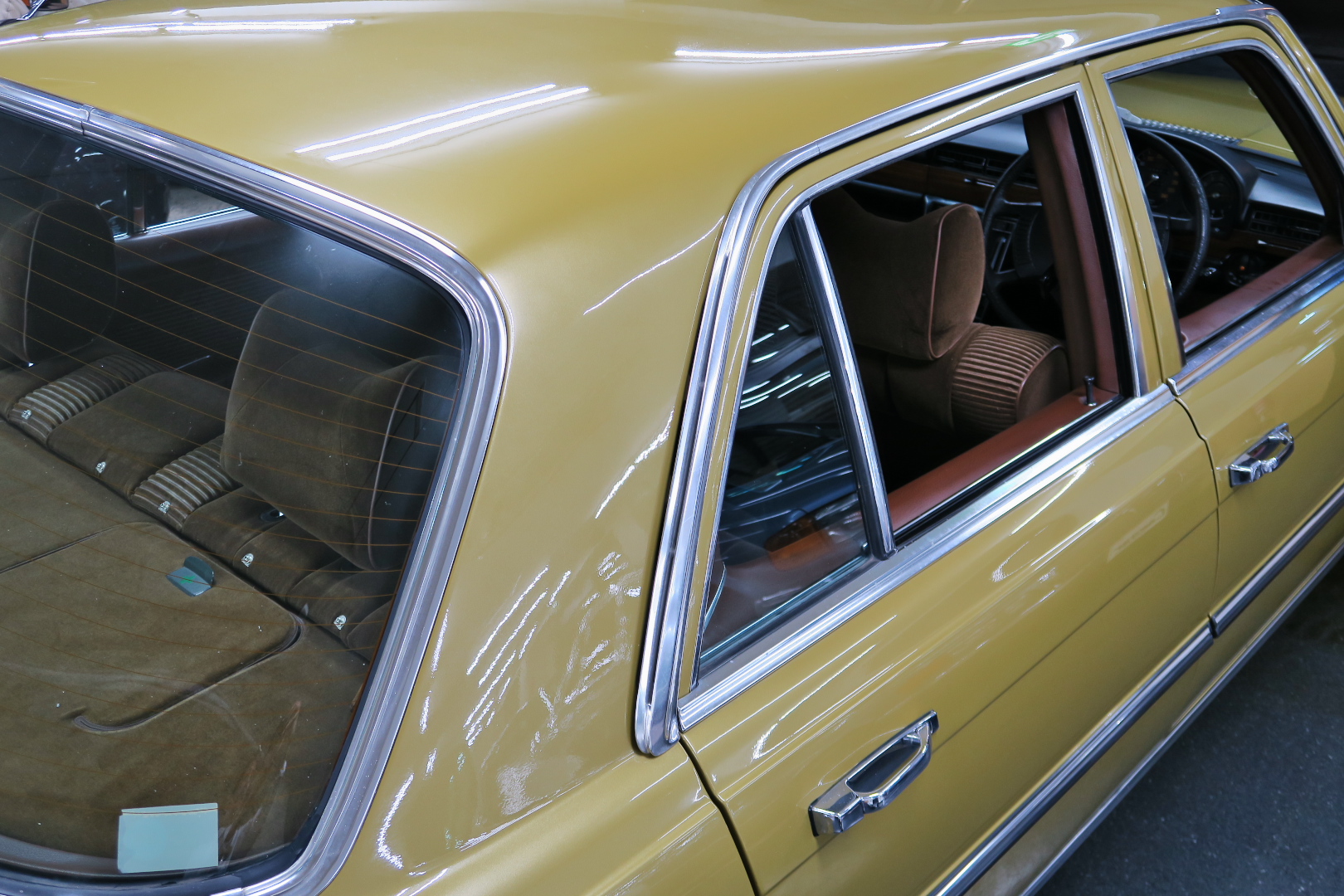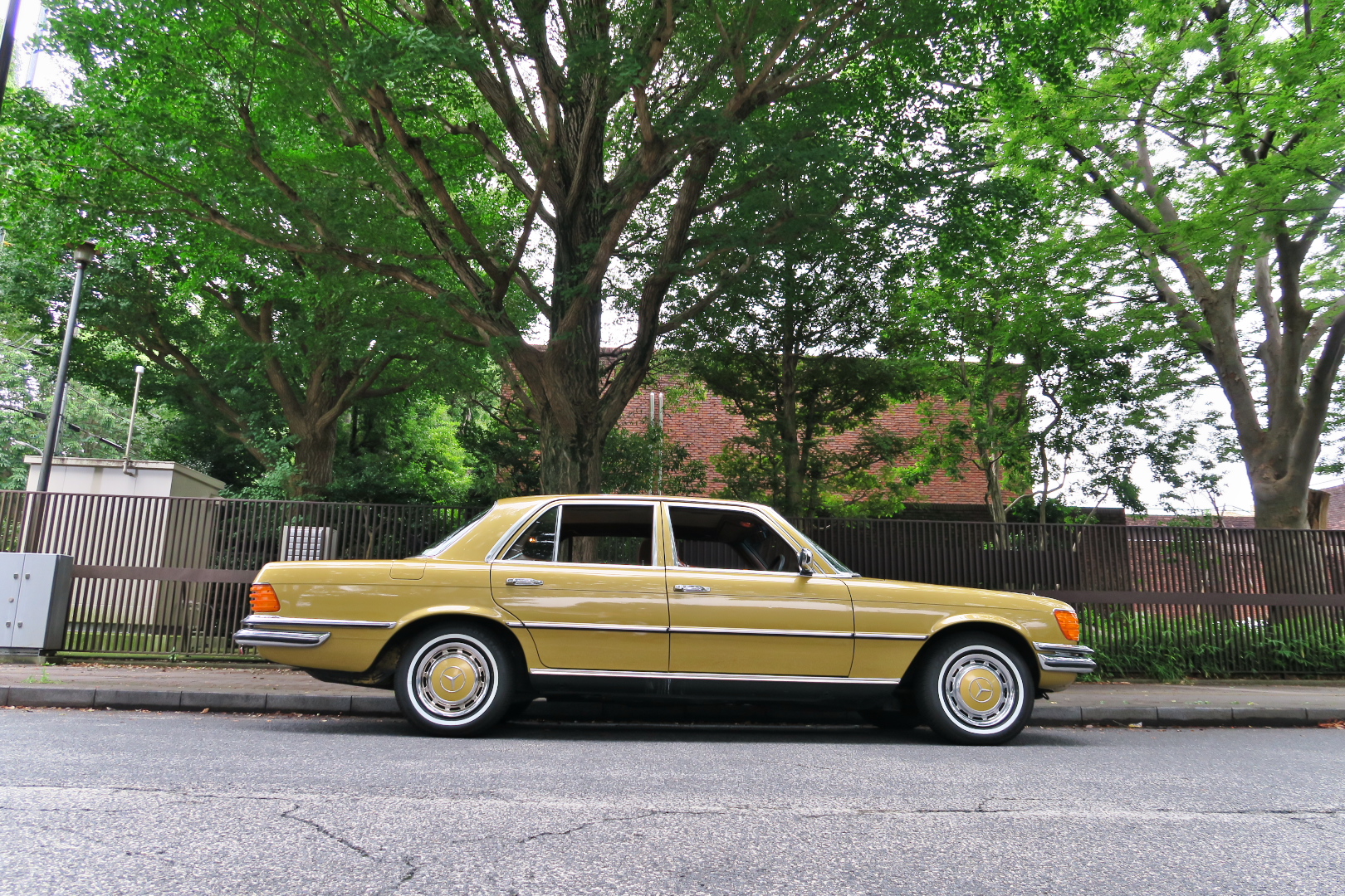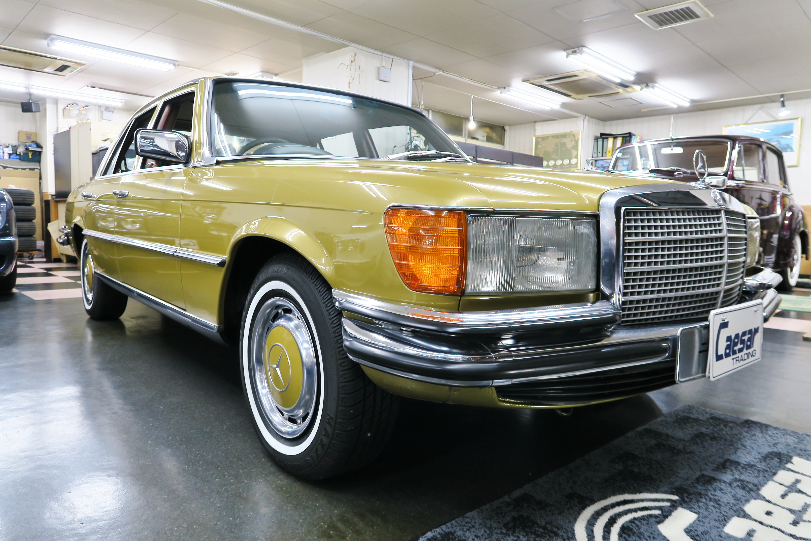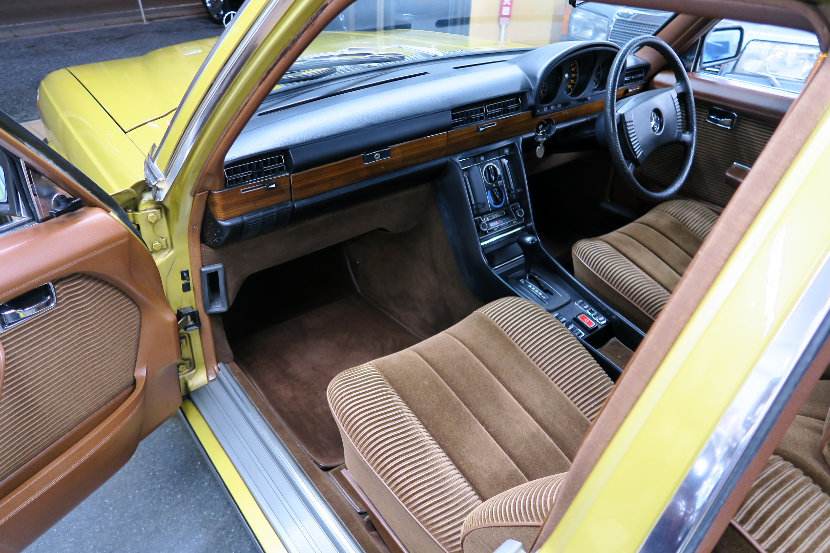 メルセデス・ベンツ「280 S」 1972年〜1980年の間に生産された最初の「Sクラス」、「W116」の 「280S」である。 日本で言う「ダブルバンパー」 このモデルには、ありし日の「メルセデスの良心」が詰め込まれている。 乗員の安全を守る ありとあらゆる工夫と知恵が満載。 まず、デザイナーからして凄い。 社内デザイナー「フリードリッヒ・ガイガー」師匠 1933年入社で、師匠デザイン、戦前では、 ・500K & 540Kスポーツ 戦後になると、かの ・「300SL ガルウイング」 ・「W111&112」「W160」 フィンテール ・「W113」 縦目 パゴダ「SL」 ・「R107」 SLとSLC ・「W108&109」 縦目セダン ・「600リムジーネ」 ・当「W116」 ダブルバンパー このラインナップは、当社が扱いたいモデルと完全合致している。気が合うわ~ *彼のあとを引き継いだデザイナーが、「ブルーノ・サッコ」氏(1973年~)である。 「W116」のコンセプトは、思うに、豪華で安全な高級車 この時代の、アウトバーンでは、皆 飛ばしまくり、各メーカーの車とも 大事故続発 安全こそ命、で、まずボディでは: ・前後、鉄板の分厚い「Wバンパー」で武装 ・横転した事態を考え、ルーフとAピラー、Cピラーの剛性を特に強化 ・後部からの衝突にも対応するため、ガソリンタンクをトランク下ではなく、 リアの車軸の上に配置 ・遠くからでも認識しやすいように、前後のウインカーレンズなどを大型化 ・極めつけは:メルセデス特許の「セーフティセル構造」! これは、「F1」マシンのように、乗員部分を金庫化し、クラッシュ時には、前後の ボディで衝撃を吸収、、「セーフティセル」内の乗員を保護する というもの。 ・78年末には、世界で初めて「ABS」を採用 室内でも: ・ダッシュボードには、厚い衝撃吸収パッドが敷き詰められている。 ・ステアリングは、中央に大きなパッドを持つ、頑丈でデカイ4本スポーク、 ・ステアリング自体にも、衝撃吸収するボスとショックアブソーバーを ・スイッチ類は運転中でも、迷わないように、シンプルデザイン ・しかも、衝突時にそなえ、スイッチ類に とがりなし。 ・サイドサポートに優れたシート・デザイン、しかも乗り心地バツグン ・しかも、シートの前方部を少し傾斜させることで、足の血管の鬱血防ぐ ・ウインドは、広く、視認性◎ ・が、各ドア部などを頑丈に分厚くしているため、思ったより室内空間は広くない。 これで、「一部」だもの どんだけ~ 「W116」は、すごいのである。 お次は、「W116」のラインナップ ・「280S」「SE」「SEL」 ・「350SE」「SEL」 ・「300D」 ・「450SE」「SEL」 ・「450SEL 6.9」 「ディーゼル」の「300D」は別物として 要は、「直列6気筒DOHC」の「280」と 「V型8気筒SOHC」の「350」「450」というラインナップ 直6モデルだけは、「4速AT」、V8モデルは、「3速AT」 これは、ツインカム・エンジンを堪能するための選択。 で、当個体の「280S」以外は、「E」=「インジェクション」 ライトウエイトで、軽快な走りをするのが、「ソレックスのS」というわけ。 「W116」は全モデルで、1972年9月~1980年の生産期間で「473.035台」も売れた なかでも、10万台を突破したのは、「280S」:「122.848台」と 「280SE」:「150.593台」の2モデルのみ = 一番人気。 では、基礎知識をご理解いただいたところで、当個体のお話: ディーラー車 左ハンドル 3オーナー! 新車時からの「記録簿」びっしりで、 最後の「記録簿」は、令和5年(2023年)10月19日:車検時:「57.665km」 現在の走行距離: 「58.074 km」! ファーストオーナーは、法人さんで、新車時から平成31年(2019年)まで、実に 43年間もご所有、、大事にされたんだな~ 当然、事故なし綺麗な個体しか扱わないわけだが、当個体、なに好いかって、 色が好い! 外装:「アイコン・ゴールド」メタリック 当時のカタログで見たことはあったけど、実車は、初めてみたっ な、なんて素敵なカラーなんでしょ このカラー、もち純正色であるが、W116では(他モデルは知らんけど)、 1973年~1978年の間のみに存在したカラー。 珍しいなんてもんじゃない。 手直し塗装もされていて、それも、うまい。で、ドキレイ! が、さすがの「シーザー」さん、ここから、気になる箇所を、更に手直し塗装して 仕上げる。なので、↓この写真は、「ビフォー」写真。 あっ リアバンパーに、1ケ所、5mmほどの凹みがあるが、これは直さない。風情。 特筆は、トランクない、左右の端、通常、ここに水が溜まって、錆びたり、腐ったり している。それが、まったくない。雨天未使用かよっ 全長: 496cm 「Sクラス」のショートホイール、ちょうど良きサイズだわ。 内装:「ブラウン・ベロア」 ナイスな選択。 当時の内装の選択肢は、標準で「ファブリック」。 オプションで、「MBTEX合皮」「本革」「ベロア」とあった。 安価な「280」では、「ファブリック」のままが多いが、そこを「ブラウン・ベロア」 とくる。外装ゴールドとのマッチングが、粋。 このベロアを含め、内装のコンディションも目を見張るものがあるが、 1ケ所だけ、運転席の背もた