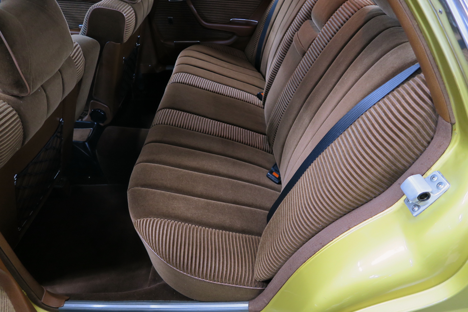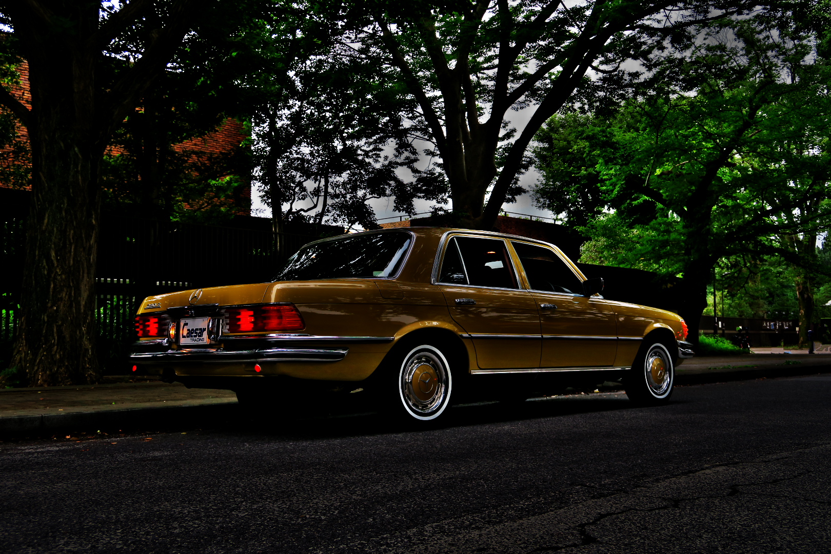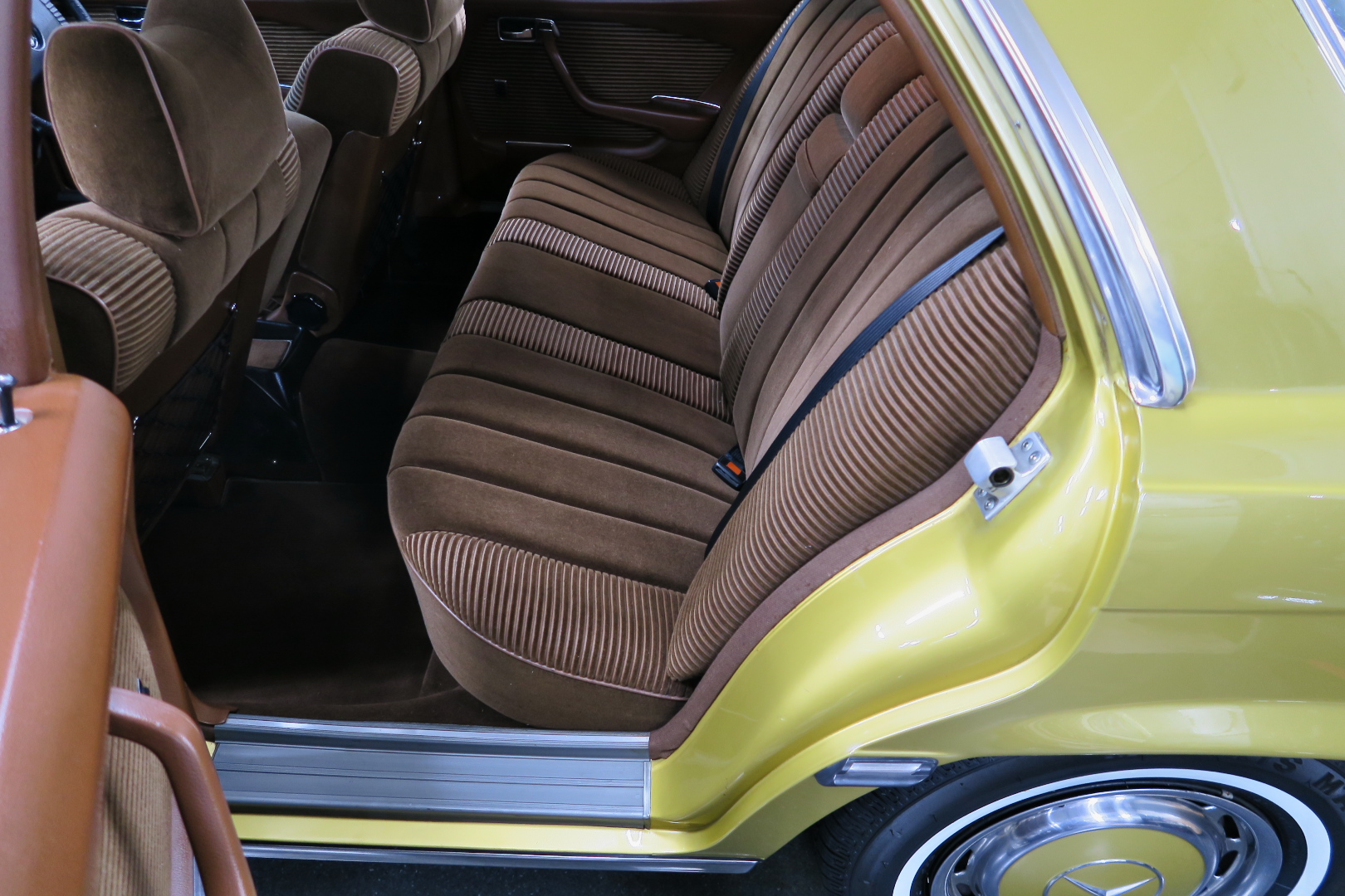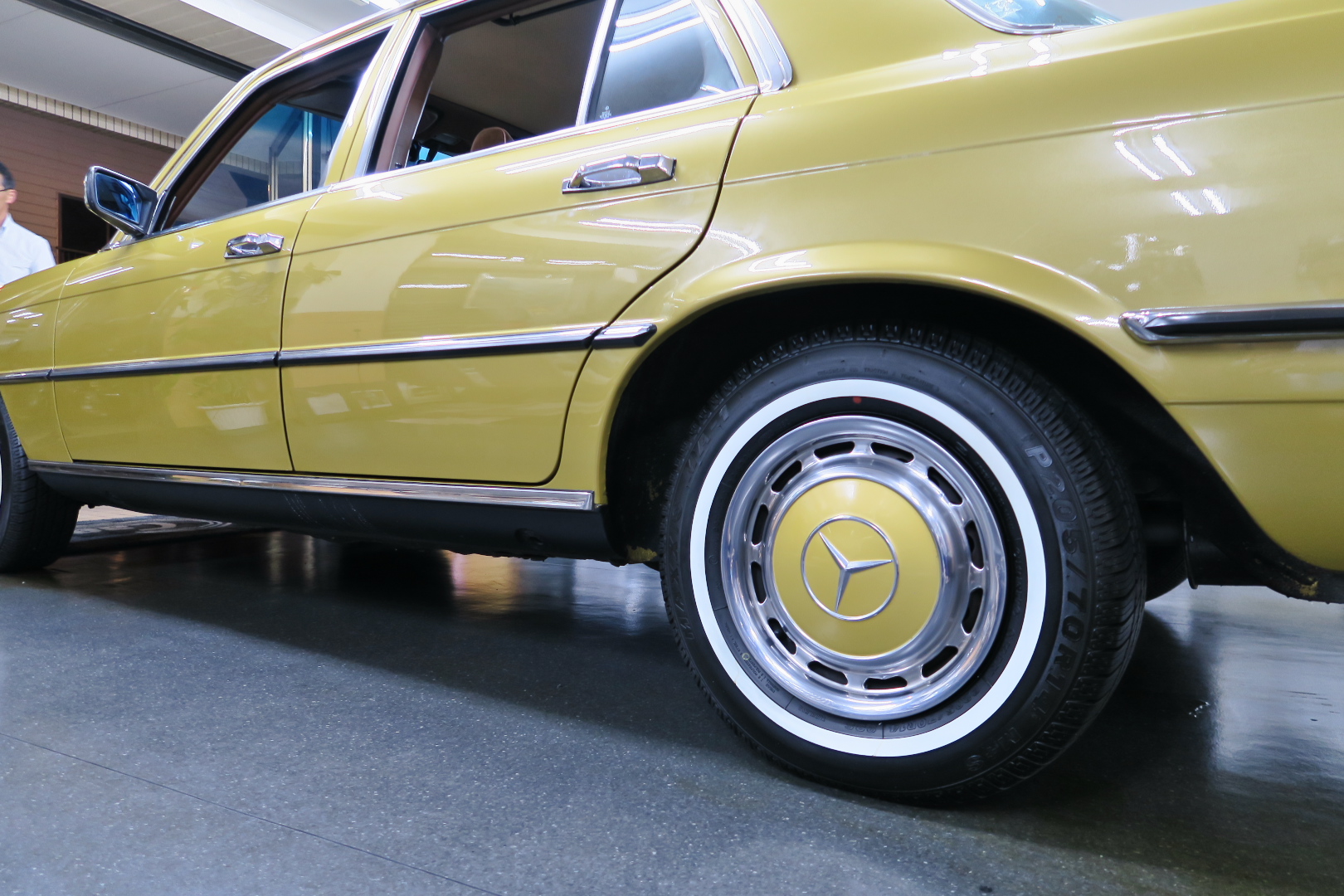 メルセデス・ベンツ「280 S」 1972年〜1980年の間に生産された最初の「Sクラス」、「W116」の 「280S」である。 日本で言う「ダブルバンパー」 このモデルには、ありし日の「メルセデスの良心」が詰め込まれている。 乗員の安全を守る ありとあらゆる工夫と知恵が満載。 まず、デザイナーからして凄い。 社内デザイナー「フリードリッヒ・ガイガー」師匠 1933年入社で、師匠デザイン、戦前では、 ・500K & 540Kスポーツ 戦後になると、かの ・「300SL ガルウイング」 ・「W111&112」「W160」 フィンテール ・「W113」 縦目 パゴダ「SL」 ・「R107」 SLとSLC ・「W108&109」 縦目セダン ・「600リムジーネ」 ・当「W116」 ダブルバンパー このラインナップは、当社が扱いたいモデルと完全合致している。気が合うわ~ *彼のあとを引き継いだデザイナーが、「ブルーノ・サッコ」氏(1973年~)である。 「W116」のコンセプトは、思うに、豪華で安全な高級車 この時代の、アウトバーンでは、皆 飛ばしまくり、各メーカーの車とも 大事故続発 安全こそ命、で、まずボディでは: ・前後、鉄板の分厚い「Wバンパー」で武装 ・横転した事態を考え、ルーフとAピラー、Cピラーの剛性を特に強化 ・後部からの衝突にも対応するため、ガソリンタンクをトランク下ではなく、 リアの車軸の上に配置 ・遠くからでも認識しやすいように、前後のウインカーレンズなどを大型化 ・極めつけは:メルセデス特許の「セーフティセル構造」! これは、「F1」マシンのように、乗員部分を金庫化し、クラッシュ時には、前後の ボディで衝撃を吸収、、「セーフティセル」内の乗員を保護する というもの。 ・78年末には、世界で初めて「ABS」を採用 室内でも: ・ダッシュボードには、厚い衝撃吸収パッドが敷き詰められている。 ・ステアリングは、中央に大きなパッドを持つ、頑丈でデカイ4本スポーク、 ・ステアリング自体にも、衝撃吸収するボスとショックアブソーバーを ・スイッチ類は運転中でも、迷わないように、シンプルデザイン ・しかも、衝突時にそなえ、スイッチ類に とがりなし。 ・サイドサポートに優れたシート・デザイン、しかも乗り心地バツグン ・しかも、シートの前方部を少し傾斜させることで、足の血管の鬱血防ぐ ・ウインドは、広く、視認性◎ ・が、各ドア部などを頑丈に分厚くしているため、思ったより室内空間は広くない。 これで、「一部」だもの どんだけ~ 「W116」は、すごいのである。 お次は、「W116」のラインナップ ・「280S」「SE」「SEL」 ・「350SE」「SEL」 ・「300D」 ・「450SE」「SEL」 ・「450SEL 6.9」 「ディーゼル」の「300D」は別物として 要は、「直列6気筒DOHC」の「280」と 「V型8気筒SOHC」の「350」「450」というラインナップ 直6モデルだけは、「4速AT」、V8モデルは、「3速AT」 これは、ツインカム・エンジンを堪能するための選択。 で、当個体の「280S」以外は、「E」=「インジェクション」 ライトウエイトで、軽快な走りをするのが、「ソレックスのS」というわけ。 「W116」は全モデルで、1972年9月~1980年の生産期間で「473.035台」も売れた なかでも、10万台を突破したのは、「280S」:「122.848台」と 「280SE」:「150.593台」の2モデルのみ = 一番人気。 では、基礎知識をご理解いただいたところで、当個体のお話: ディーラー車 左ハンドル 3オーナー! 新車時からの「記録簿」びっしりで、 最後の「記録簿」は、令和5年(2023年)10月19日:車検時:「57.665km」 現在の走行距離: 「58.074 km」! ファーストオーナーは、法人さんで、新車時から平成31年(2019年)まで、実に 43年間もご所有、、大事にされたんだな~ 当然、事故なし綺麗な個体しか扱わないわけだが、当個体、なに好いかって、 色が好い! 外装:「アイコン・ゴールド」メタリック 当時のカタログで見たことはあったけど、実車は、初めてみたっ な、なんて素敵なカラーなんでしょ このカラー、もち純正色であるが、W116では(他モデルは知らんけど)、 1973年~1978年の間のみに存在したカラー。 珍しいなんてもんじゃない。 手直し塗装もされていて、それも、うまい。で、ドキレイ! が、さすがの「シーザー」さん、ここから、気になる箇所を、更に手直し塗装して 仕上げる。なので、↓この写真は、「ビフォー」写真。 あっ リアバンパーに、1ケ所、5mmほどの凹みがあるが、これは直さない。風情。 特筆は、トランクない、左右の端、通常、ここに水が溜まって、錆びたり、腐ったり している。それが、まったくない。雨天未使用かよっ 全長: 496cm 「Sクラス」のショートホイール、ちょうど良きサイズだわ。 内装:「ブラウン・ベロア」 ナイスな選択。 当時の内装の選択肢は、標準で「ファブリック」。 オプションで、「MBTEX合皮」「本革」「ベロア」とあった。 安価な「280」では、「ファブリック」のままが多いが、そこを「ブラウン・ベロア」 とくる。外装ゴールドとのマッチングが、粋。 このベロアを含め、内装のコンディションも目を見張るものがあるが、 1ケ所だけ、運転席の背もた